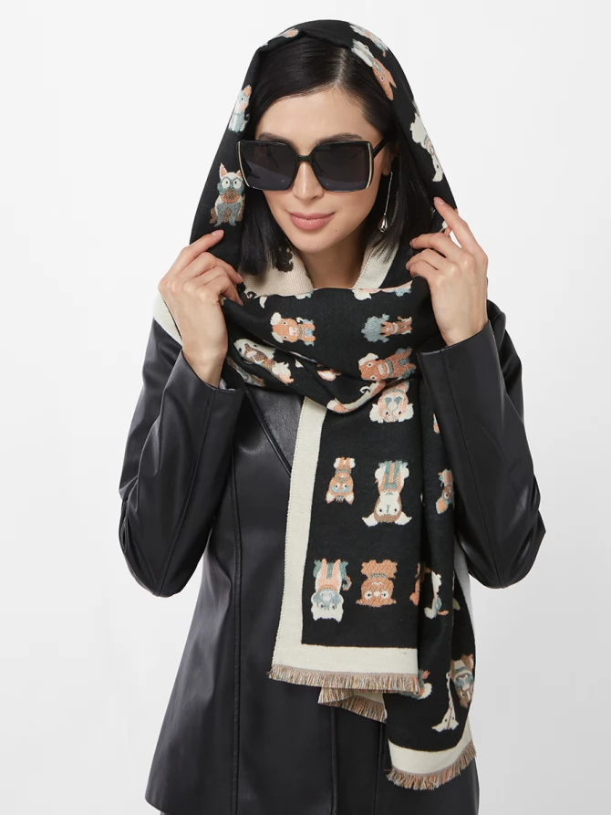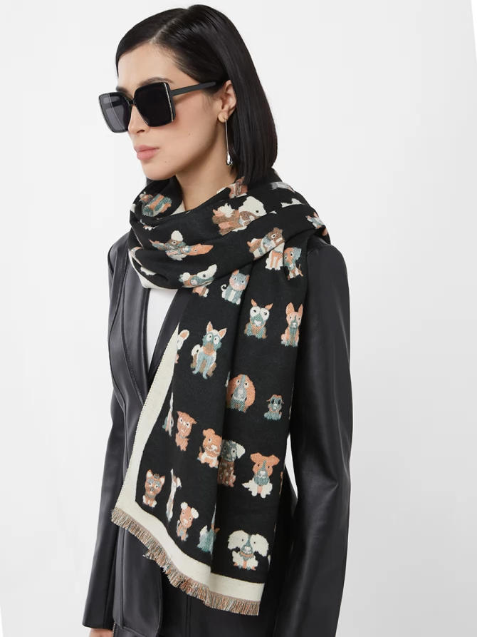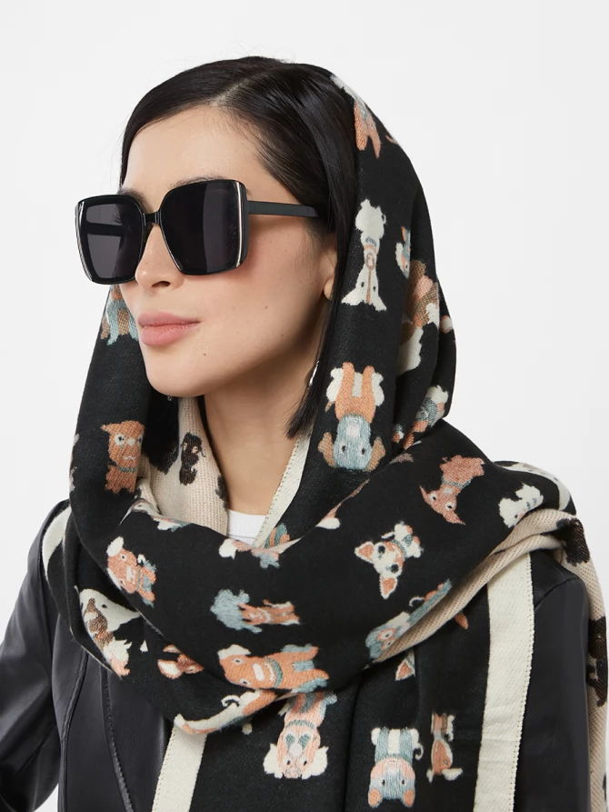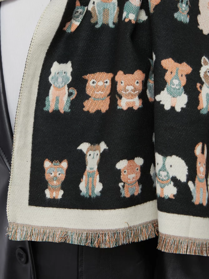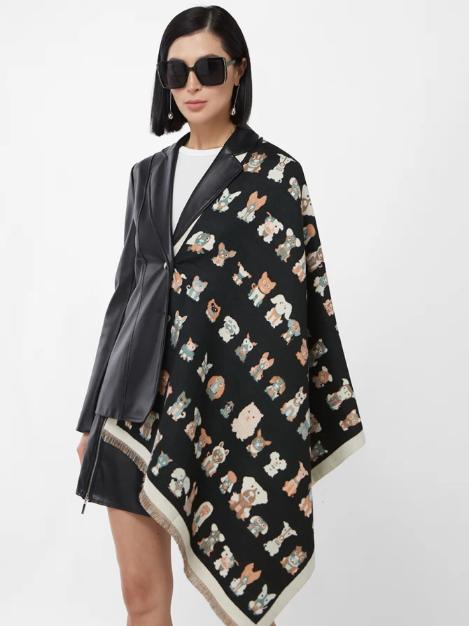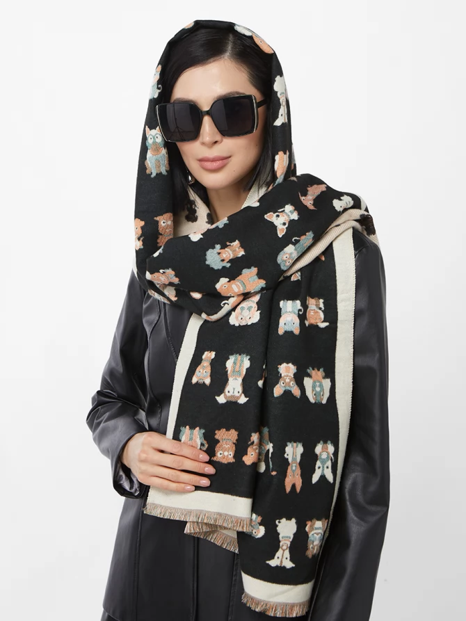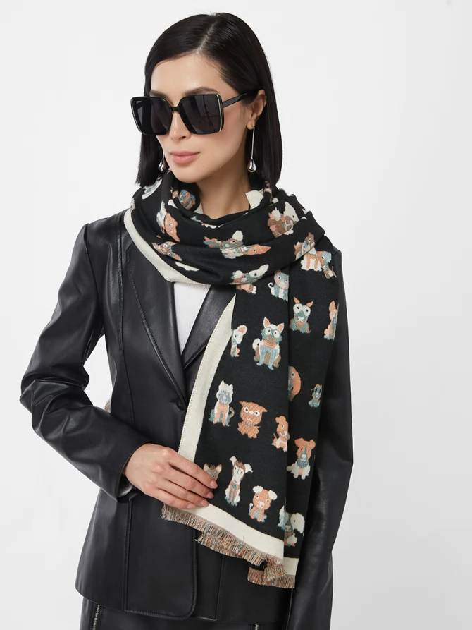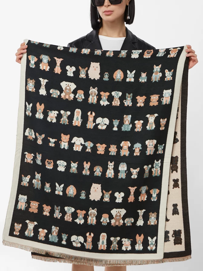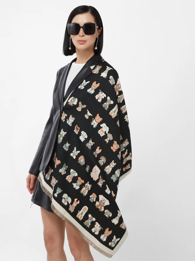 Представляем вашему вниманию большой, мягкий и теплый палантин с невероятно очаровательным принтом 'Щенки'. На глубоком черном фоне расположились милые мультяшные песики в пастельных тонах, создавая уникальный и запоминающийся узор.
