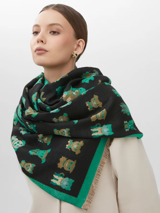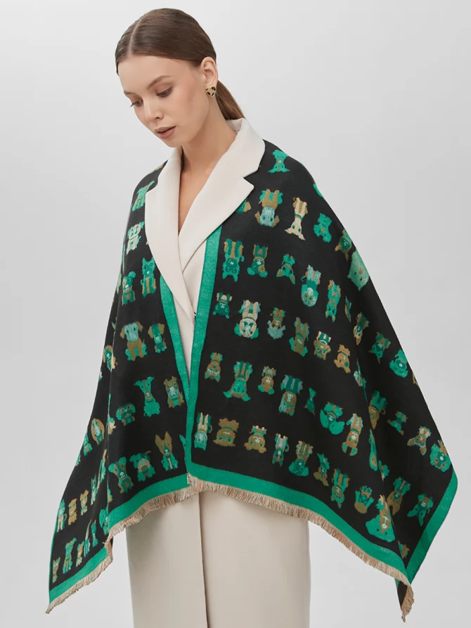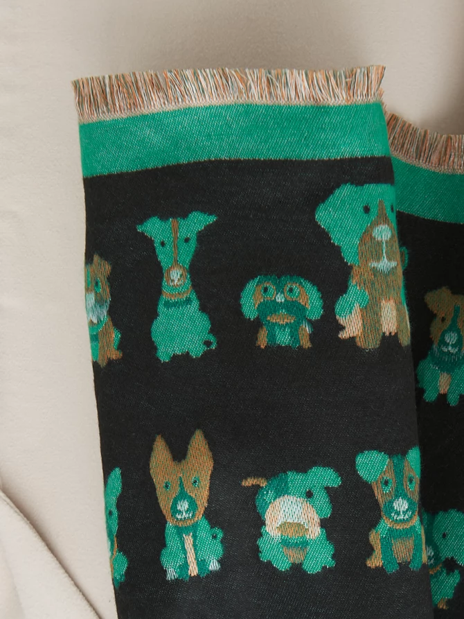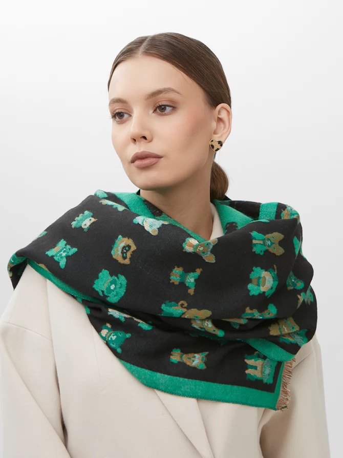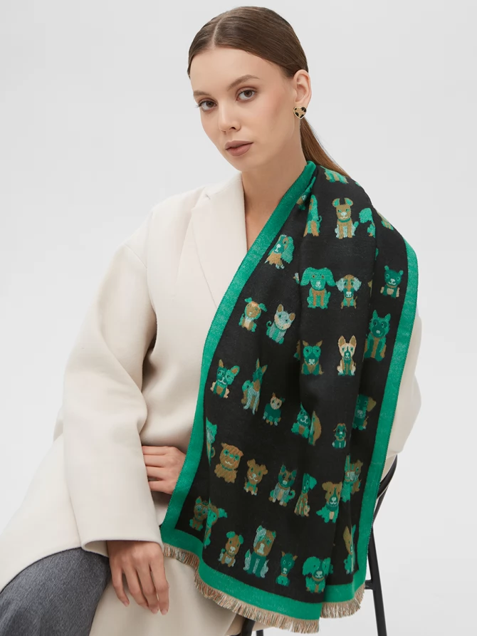 Этот большой, невероятно мягкий и теплый аксессуар создан для тех, кто ценит не только комфорт, но и неповторимый стиль. С одной стороны, вас ждет глубокий черный фон, украшенный очаровательным и стильным паттерном из забавных собачек разных пород в изумрудных и коричневых оттенках. Яркая зеленая окантовка по периметру добавляет свежести и акцентирует внимание на игривом дизайне. Другая сторона палантина выполнена в контрастном цвете, что позволяет вам экспериментировать с образами и каждый день выглядеть по-новому.