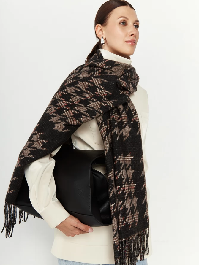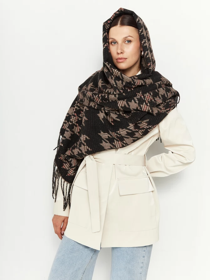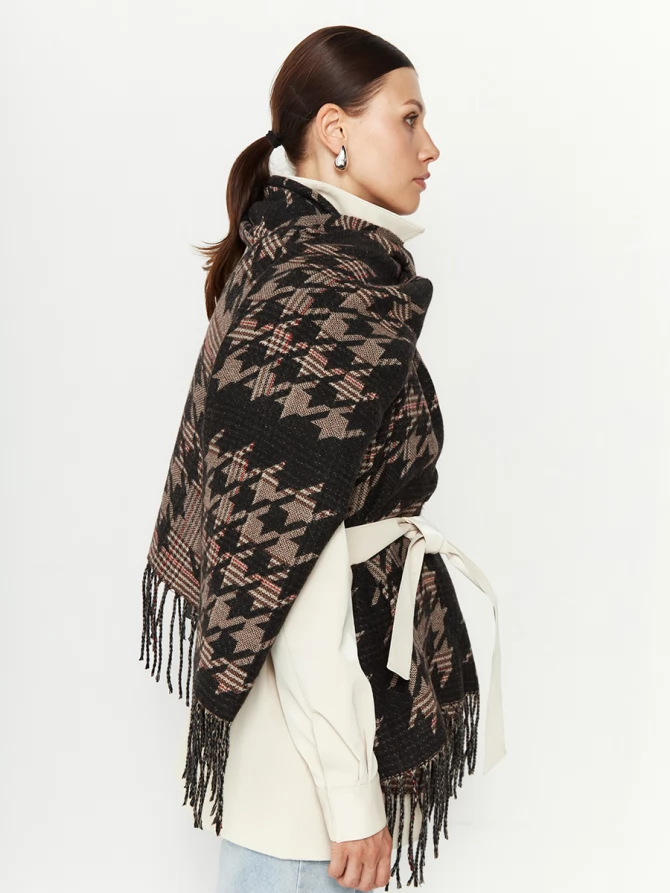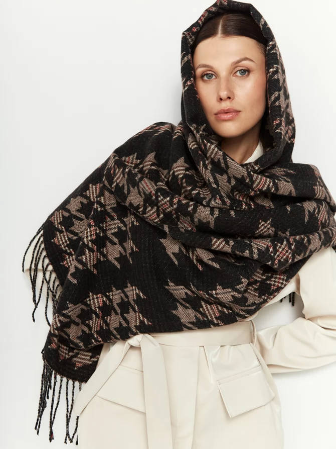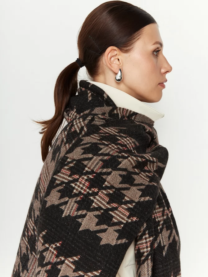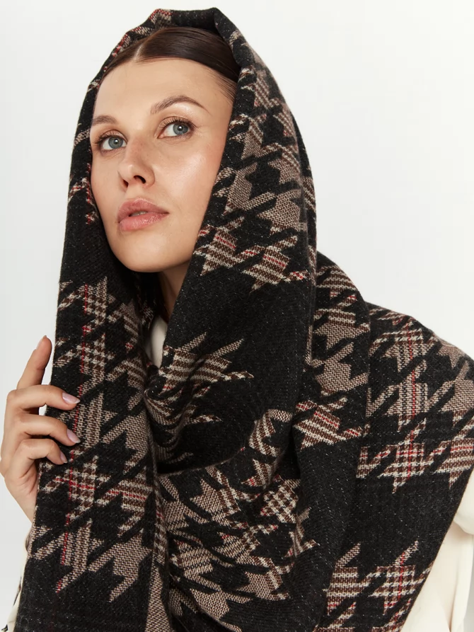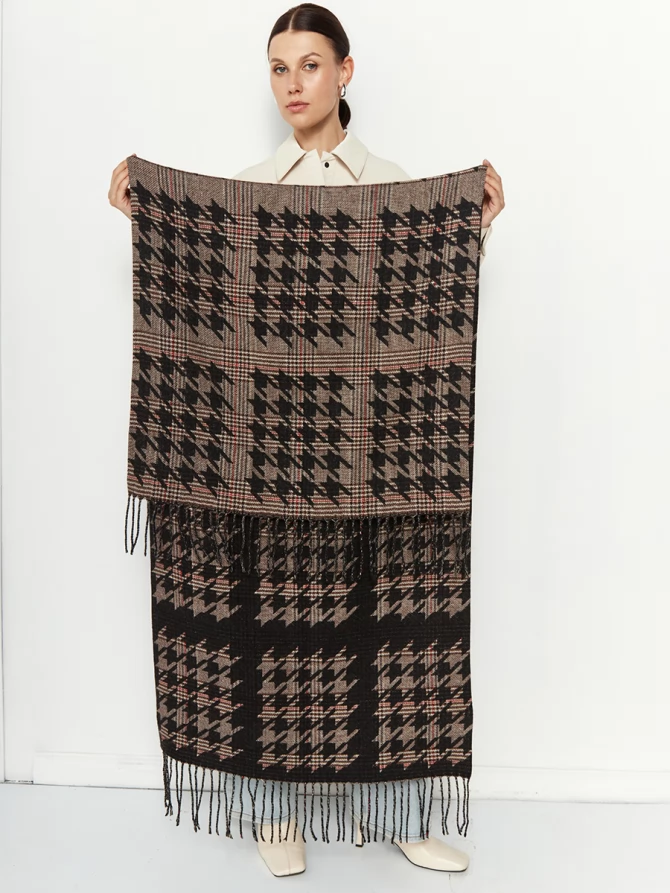 Созданный с любовью и вниманием к каждой детали в собственных мастерских TANTINO, этот большой двусторонний палантин станет незаменимым акцентом в вашем гардеробе. Классический, но всегда актуальный принт "гусиная лапка" в глубоких коричнево-бежевых тонах с легкими акцентами красного добавляет образу изысканности и шарма, позволяя вам чувствовать себя уверенно и стильно в любой ситуации.