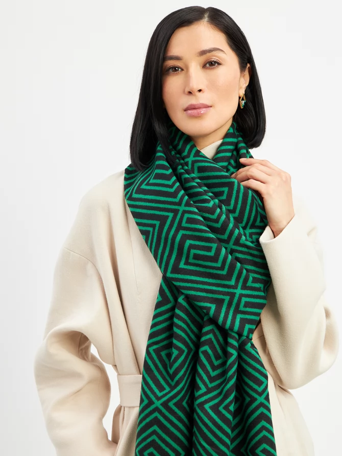 Наш большой и невероятно мягкий палантин с трендовым геометрическим принтом в глубоких оттенках зеленого и черного мгновенно добавит шика и выразительности вашему ансамблю. Его двусторонний дизайн предлагает еще больше возможностей для стилизации: создавайте новые комбинации, меняя стороны, и каждый раз выглядите по-новому. Укутайтесь в него, чтобы почувствовать нежное тепло в прохладный день, или элегантно накиньте на плечи, завершая вечерний образ. Его объем и роскошный крой обеспечивают идеальную посадку и эффектную драпировку.