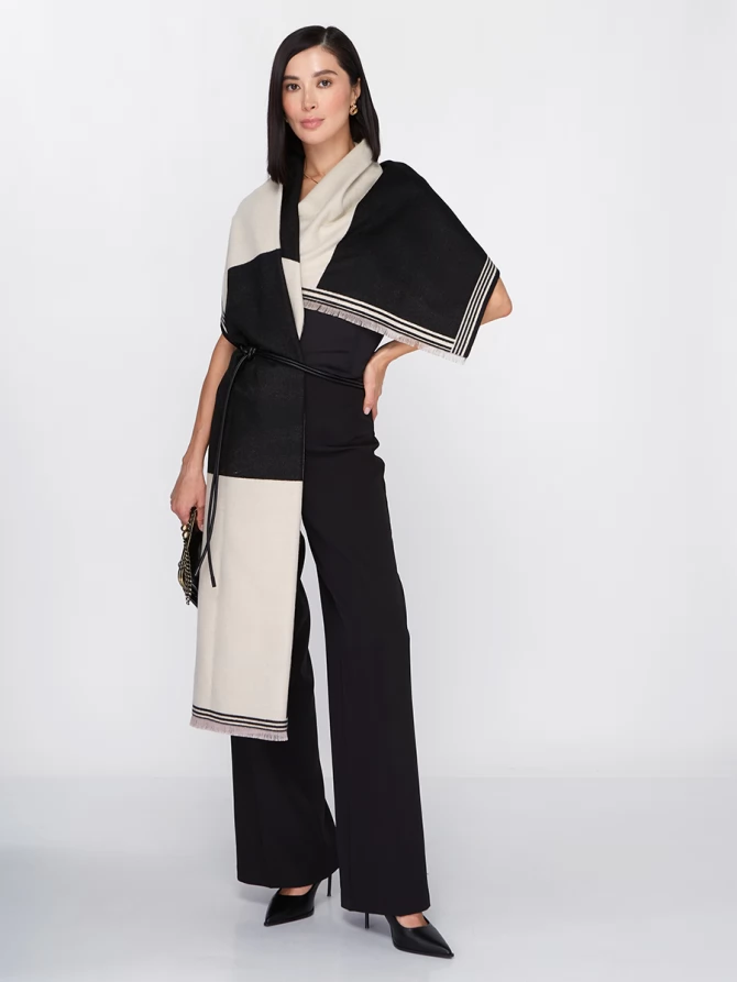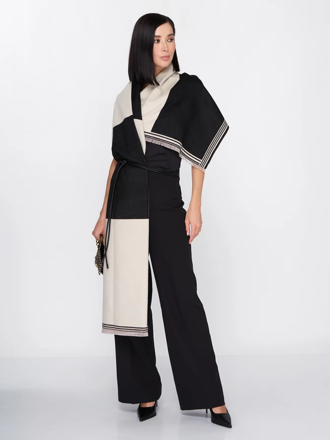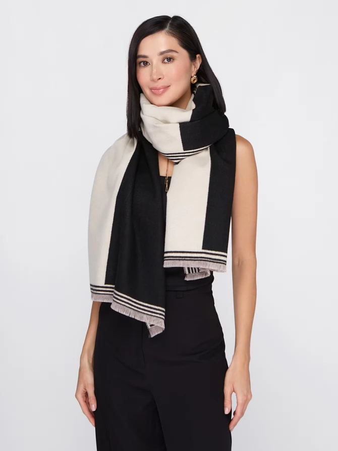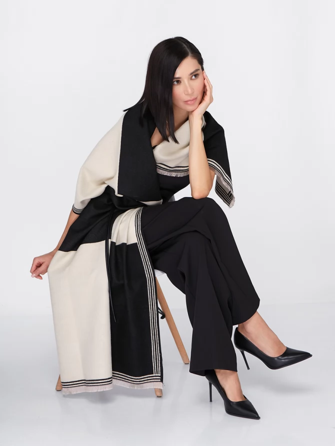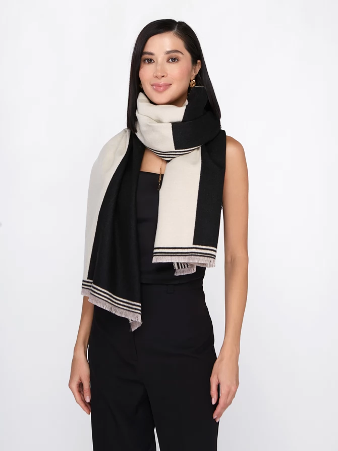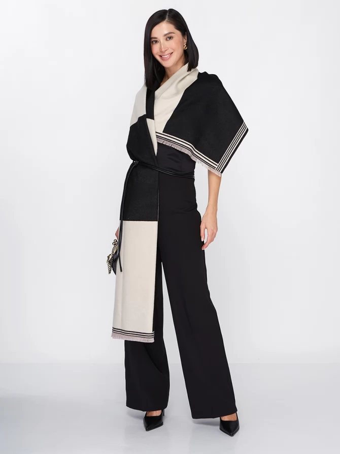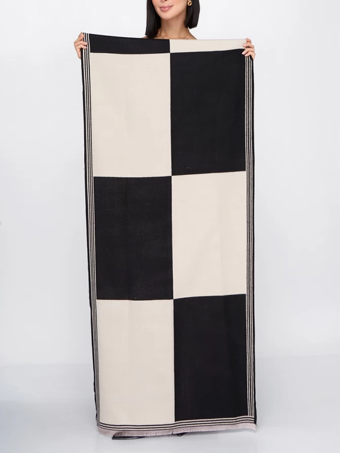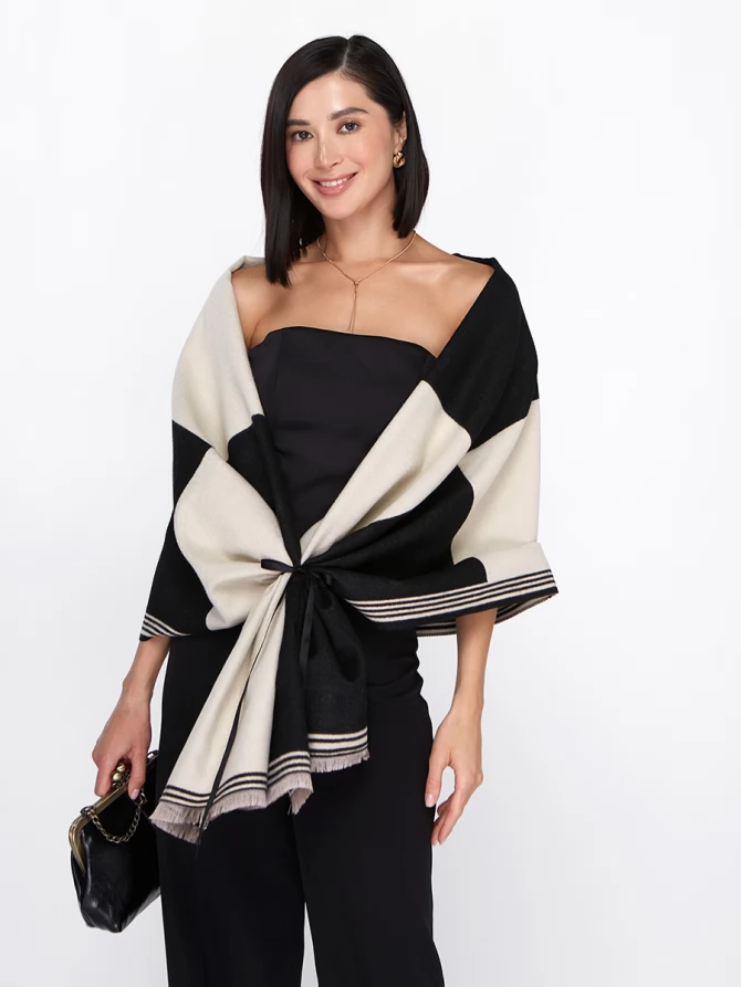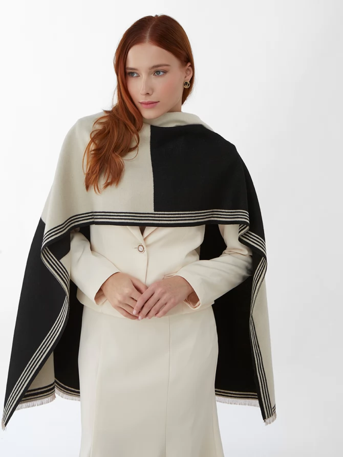 Погрузитесь в объятия мягкости и тепла с этим роскошным палантином. Его уникальный дизайн с контрастными цветовыми блоками — глубоким черным и нежным кремовым — позволяет вам мгновенно менять акценты в вашем образе. Благодаря двусторонней фактуре, вы можете носить его по-разному, экспериментируя со стилями: от классического до смело-современного. Элегантные полосатые края добавляют изделию утонченности и завершенности.