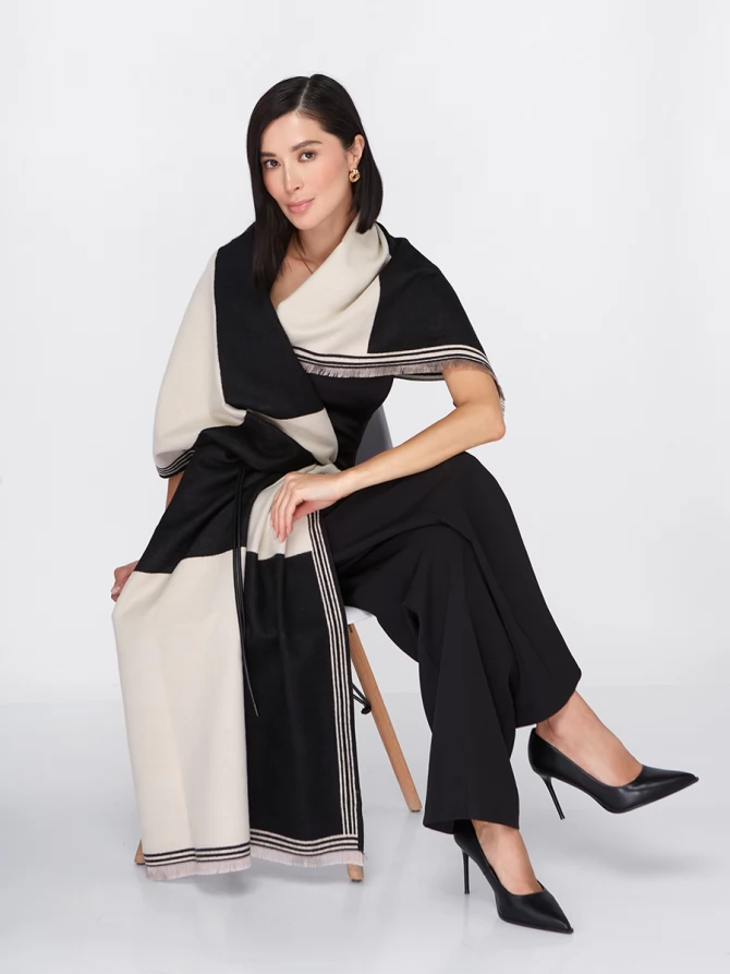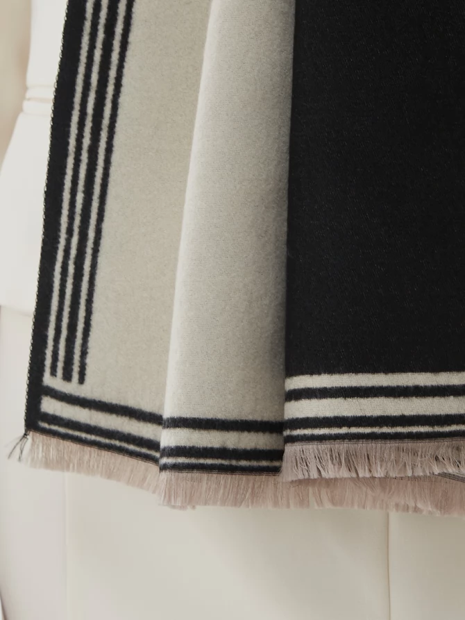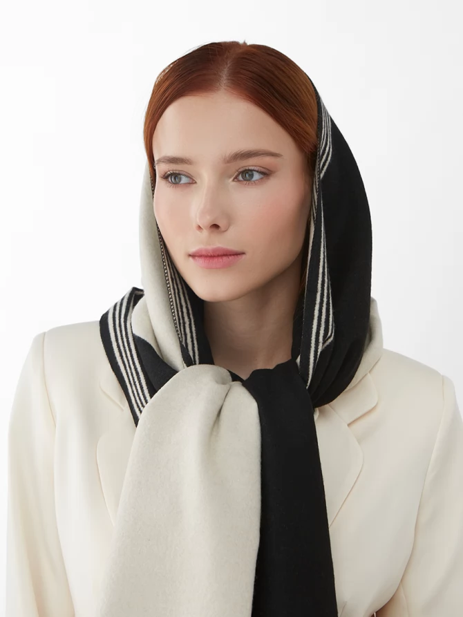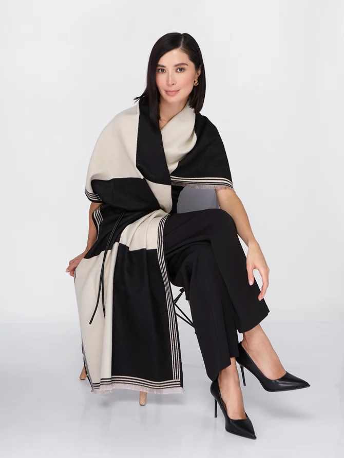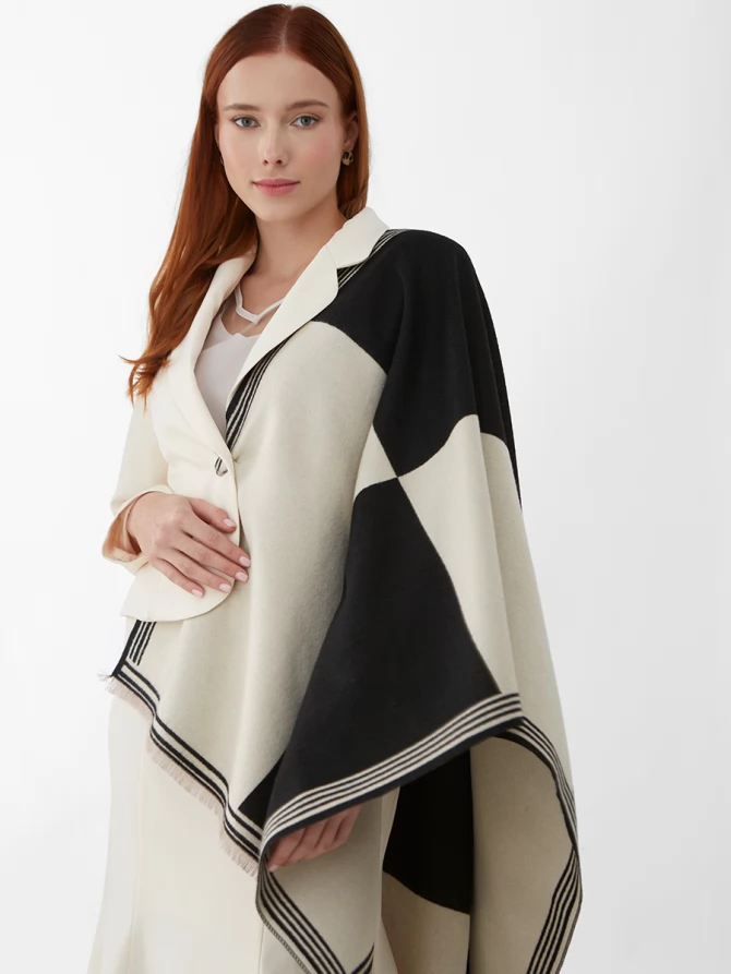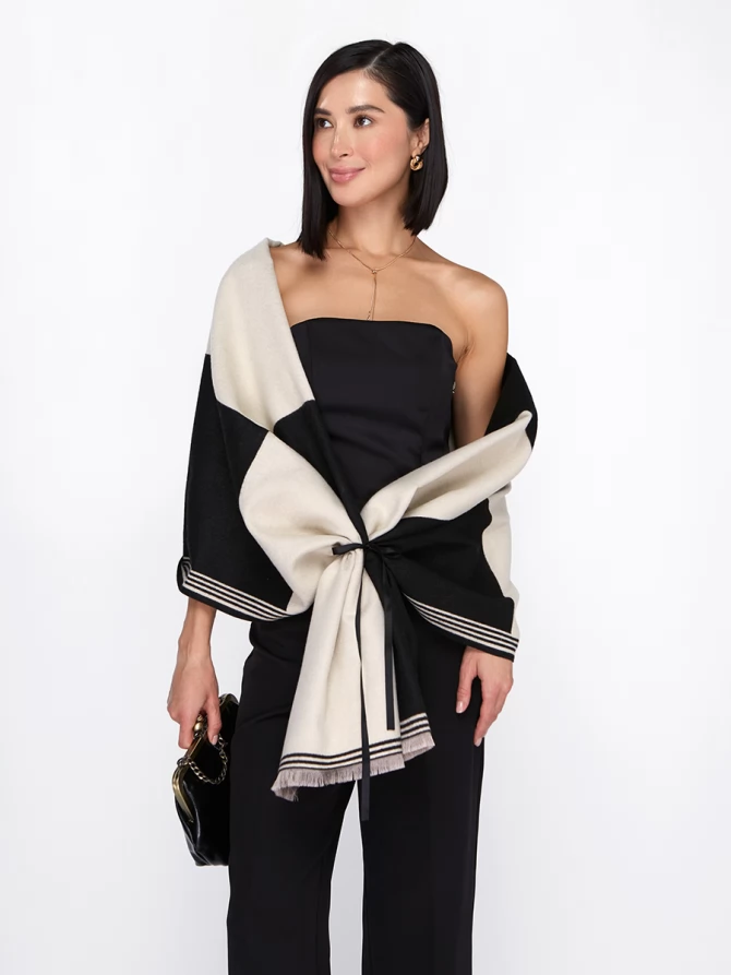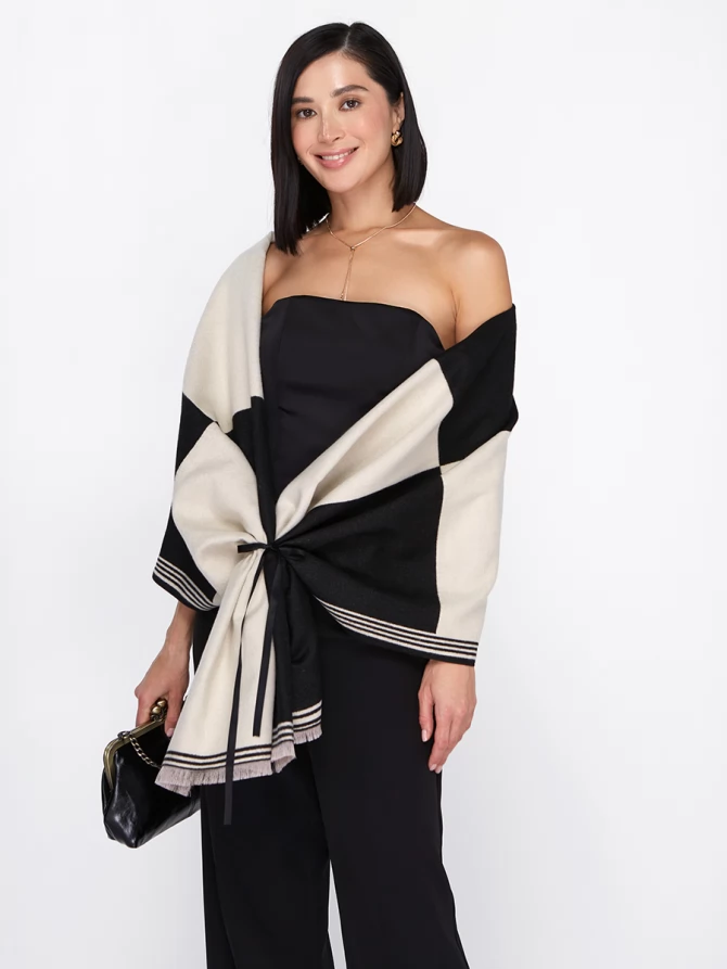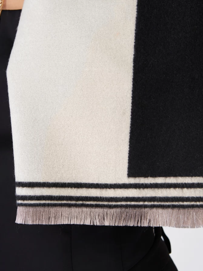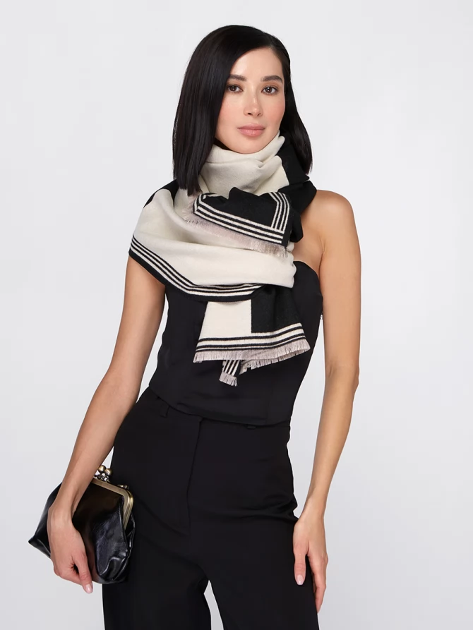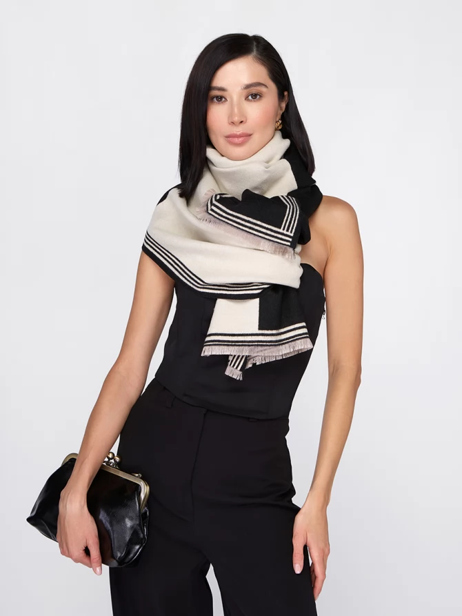 Погрузитесь в объятия мягкости и тепла с этим роскошным палантином. Его уникальный дизайн с контрастными цветовыми блоками — глубоким черным и нежным кремовым — позволяет вам мгновенно менять акценты в вашем образе. Благодаря двусторонней фактуре, вы можете носить его по-разному, экспериментируя со стилями: от классического до смело-современного. Элегантные полосатые края добавляют изделию утонченности и завершенности.