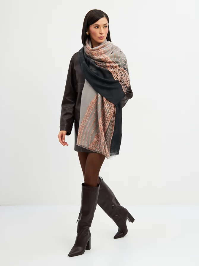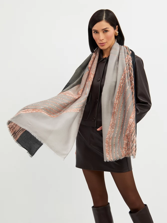 Наш палантин — воплощение роскошной мягкости и невесомой тонкости. Он невероятно приятен к коже, дарит ощущение уюта и тепла. Благодаря двустороннему дизайну, вы получаете два стильных решения в одном: элегантный серый фон с динамичными линиями медного оттенка, переходящий в глубокий черный. Этот уникальный абстрактный узор идеально соответствует актуальным мировым трендам и позволяет легко менять настроение вашего наряда.