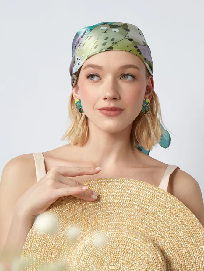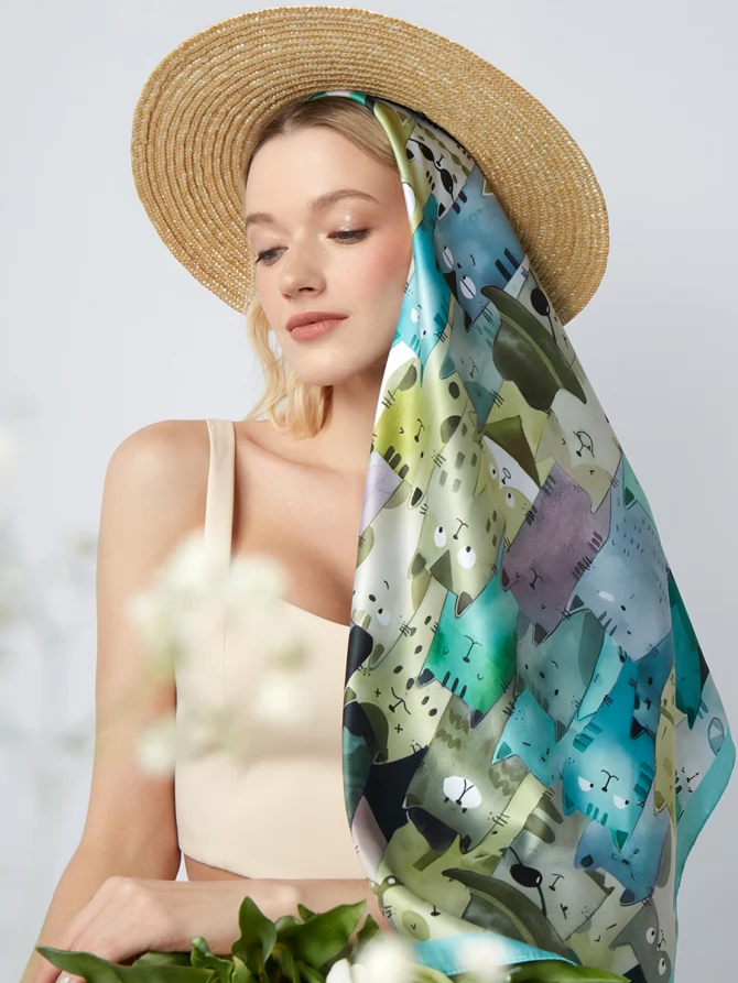 Мы создали этот платок с особым вниманием к деталям. Его отличает мягкость, невероятная тонкость и нежность, что делает его исключительно приятным на ощупь. Дизайн принта – это целая история, рассказанная в гармонии зеленых, бирюзовых и серых оттенков, напоминающих абстрактные пейзажи или таинственные морские глубины. Каждый завиток и штрих выполнен с любовью, отражая последние мировые тенденции и ваш безупречный вкус.