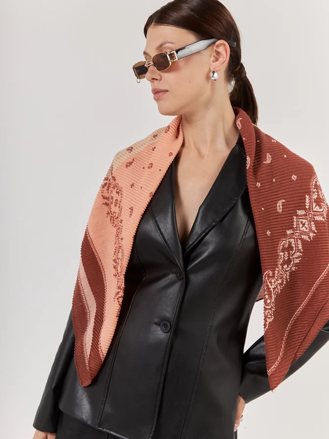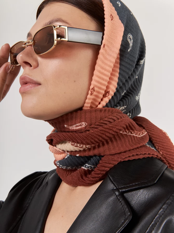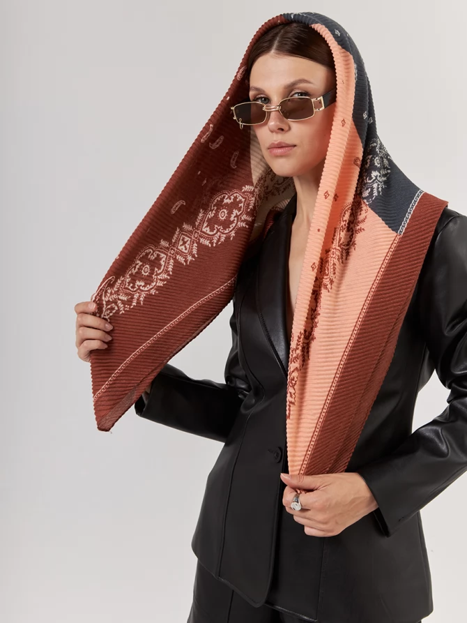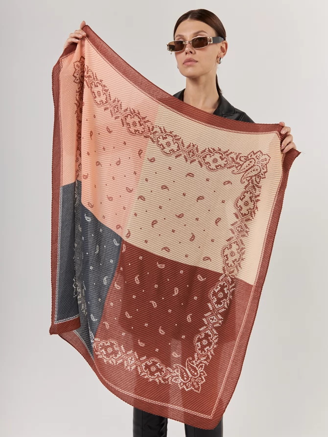 Он большой, мягкий, тонкий и невероятно нежный на ощупь, словно легкое облако. Изысканный принт с элегантными элементами пейсли, выполненный в гармоничном сочетании терракотового, персикового, графитового и светло-бежевого оттенков, придает ему особую привлекательность. Этот аксессуар – воплощение актуальных мировых трендов и нашего стремления к уникальному дизайну.