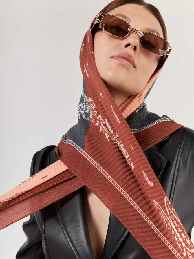 Идеальная посадка и драпировка платка позволяют экспериментировать с образами: носите его как элегантный головной убор, стильно повязывайте на шею или используйте как акцентный элемент на вашей сумочке. Он добавит вашему наряду нотку роскоши и индивидуальности, подчеркивая вашу неповторимую женственность и чувство стиля.