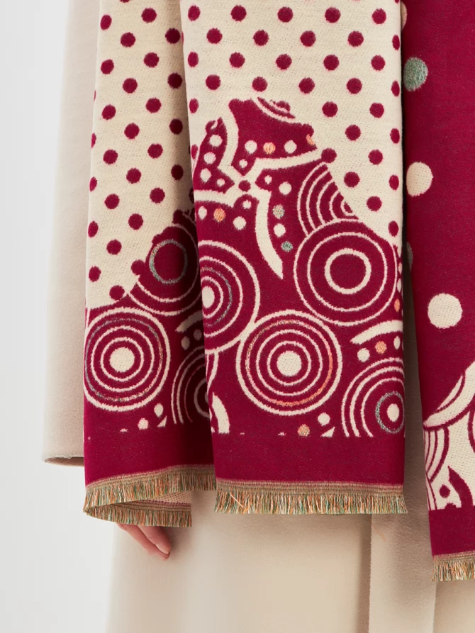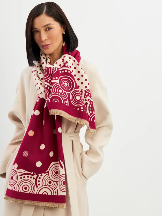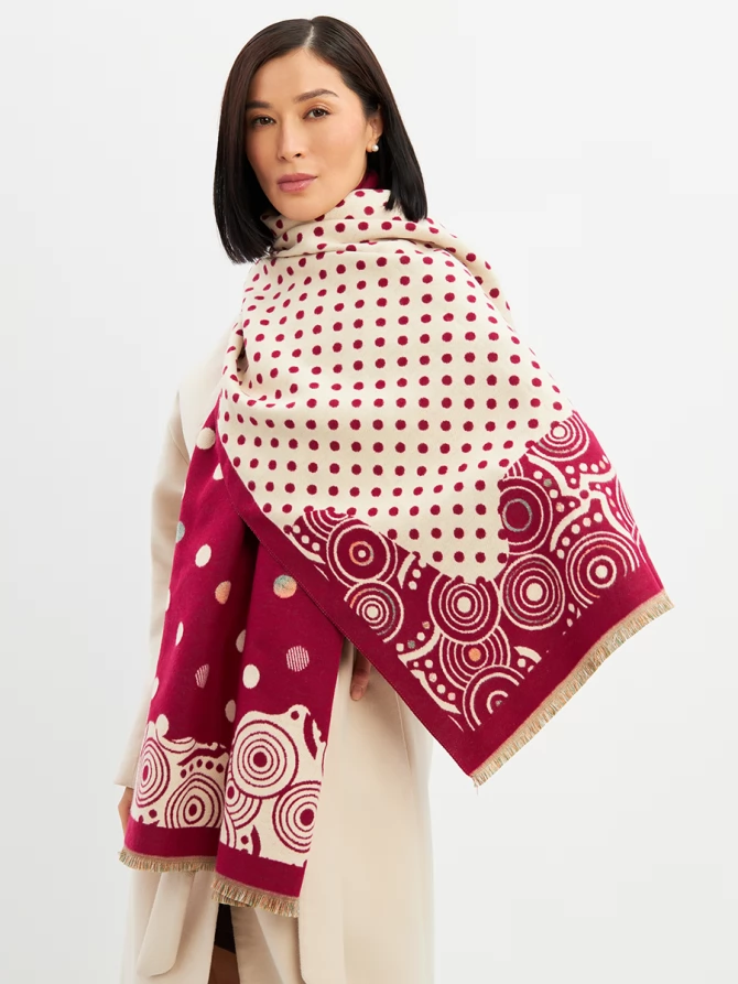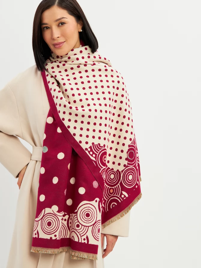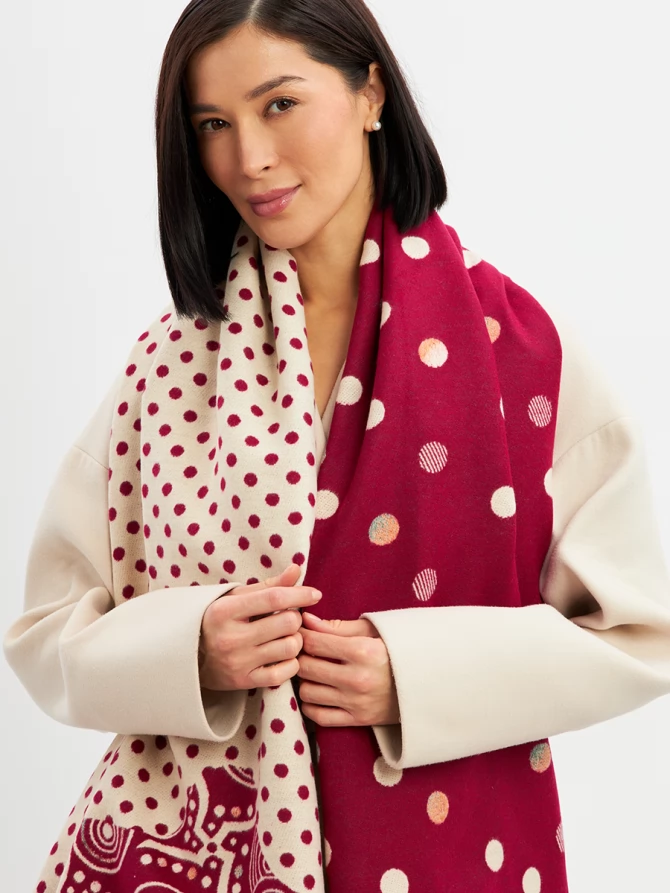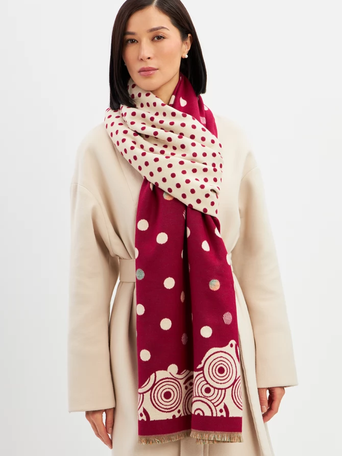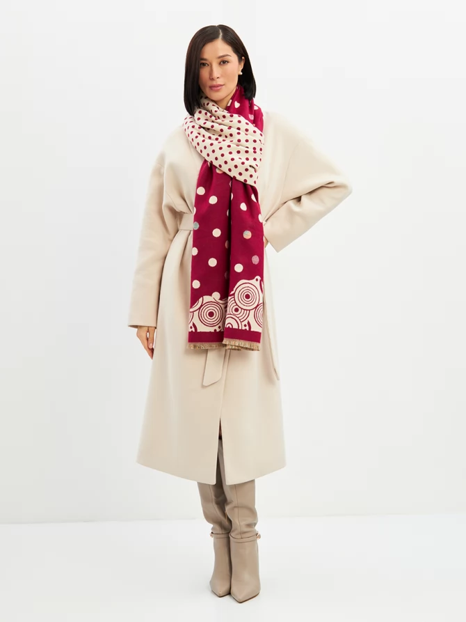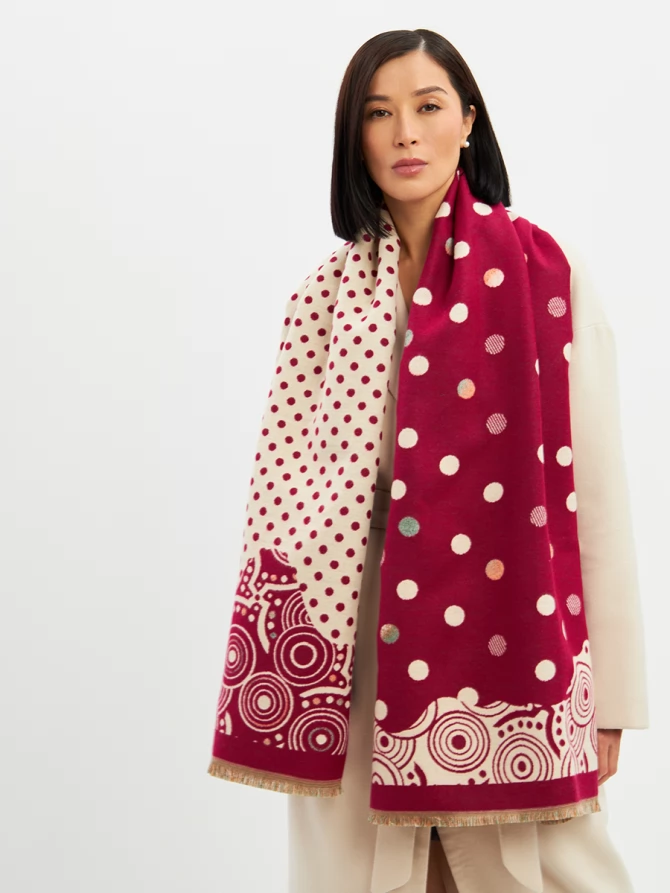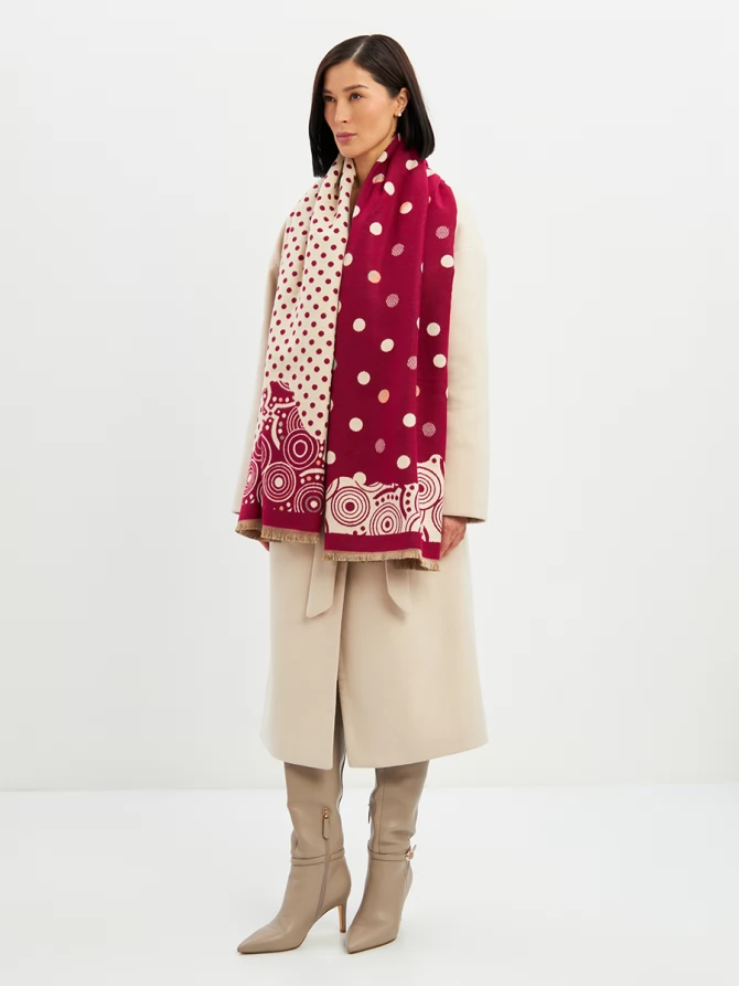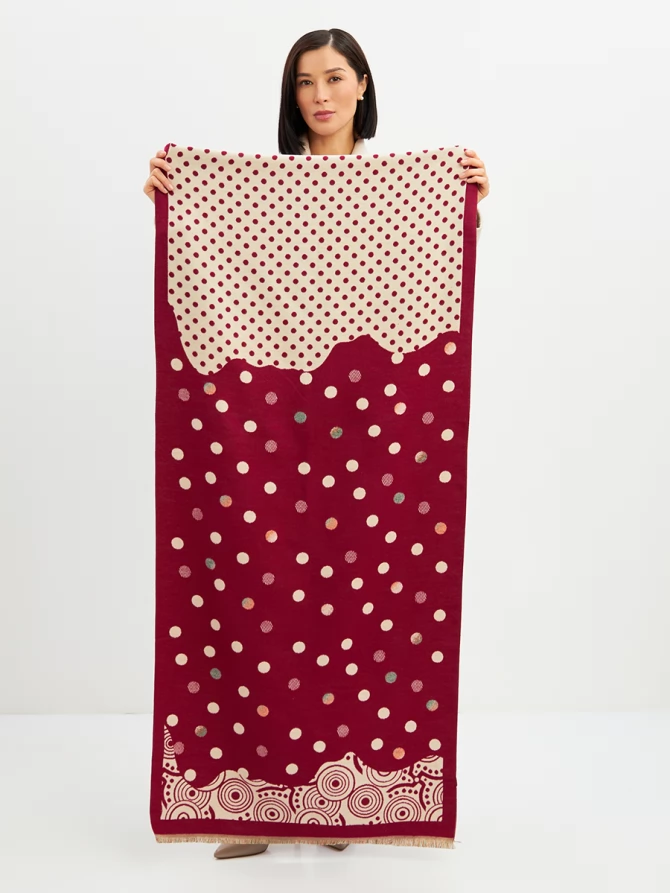 Этот палантин – настоящее произведение искусства. Одна сторона украшена игривым принтом в мелкий горошек на нежном кремовом фоне, создавая легкий и романтичный образ. Стоит лишь перевернуть его, и вы обнаружите совершенно иное настроение: глубокий бордовый цвет, усыпанный крупным горошком и дополненный стильным геометрическим узором по краям. Такой продуманный дизайн позволяет легко менять акценты в вашем образе, делая его уникальным каждый день.