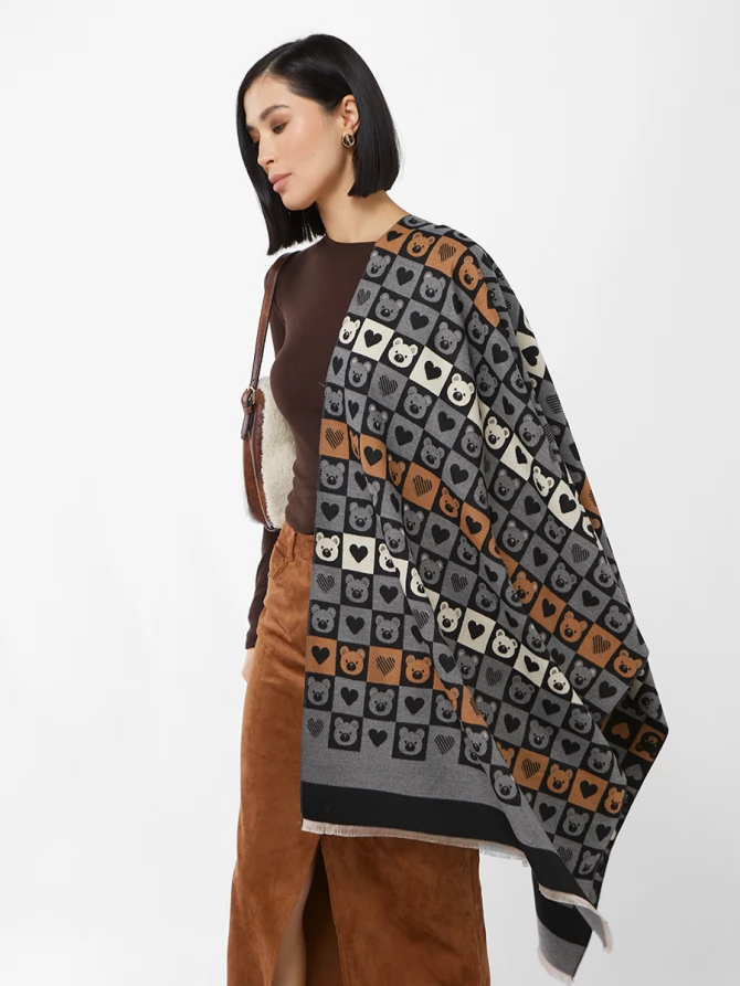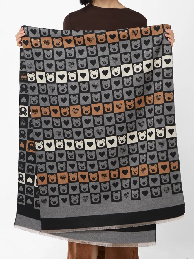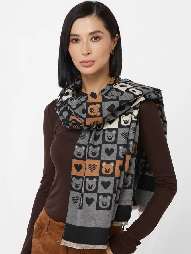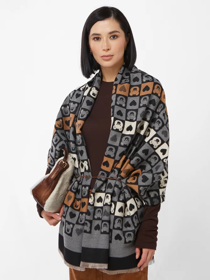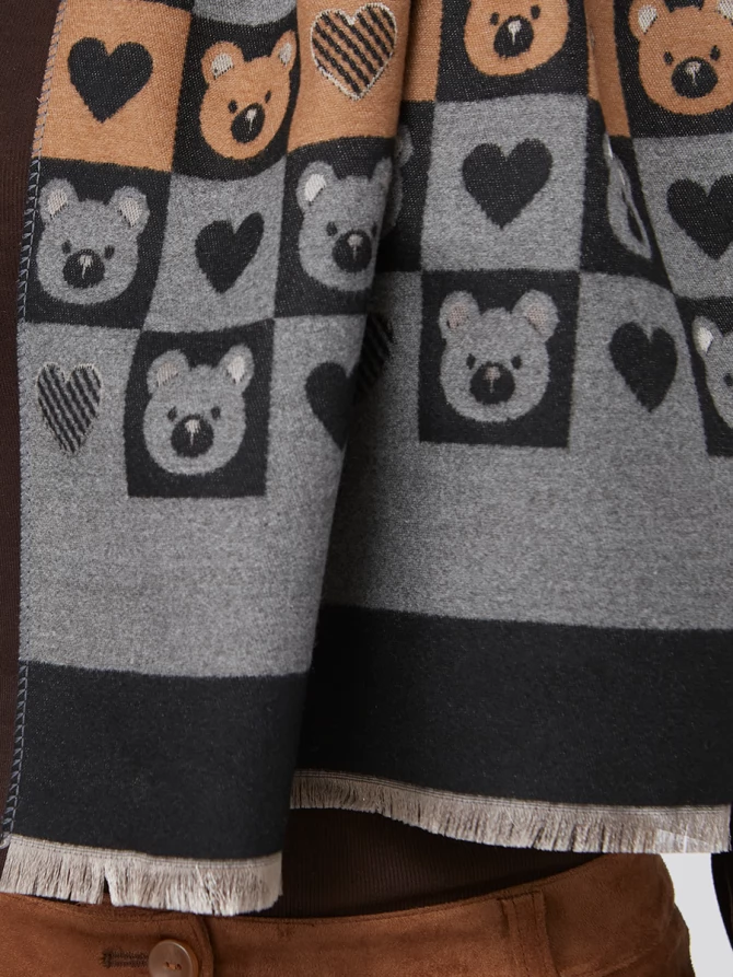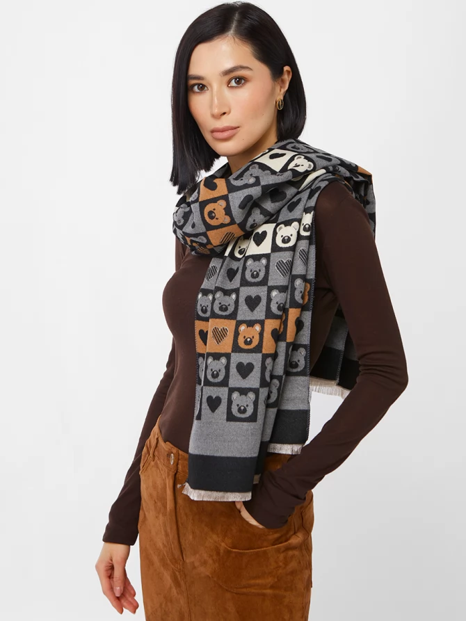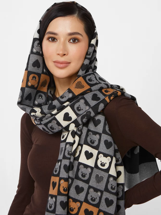 Созданный с любовью в дизайн-студии TANTINO, этот палантин сразу приковывает взгляды своим игривым и современным узором. Квадраты с милыми медвежатами и нежными сердцами в стильных черно-серых и теплых бежевых оттенках создают уникальный рисунок, который легко впишется в ваш повседневный или особый образ. Благодаря двустороннему дизайну, вы можете менять настроение образа, просто перевернув палантин.