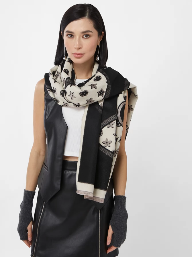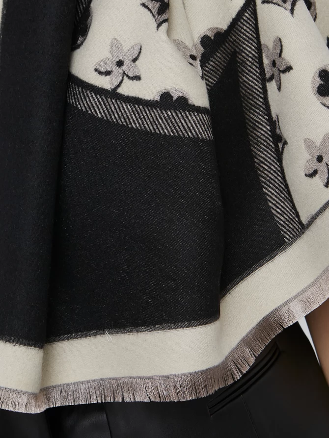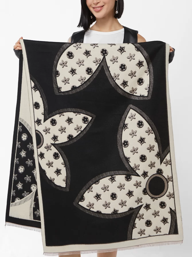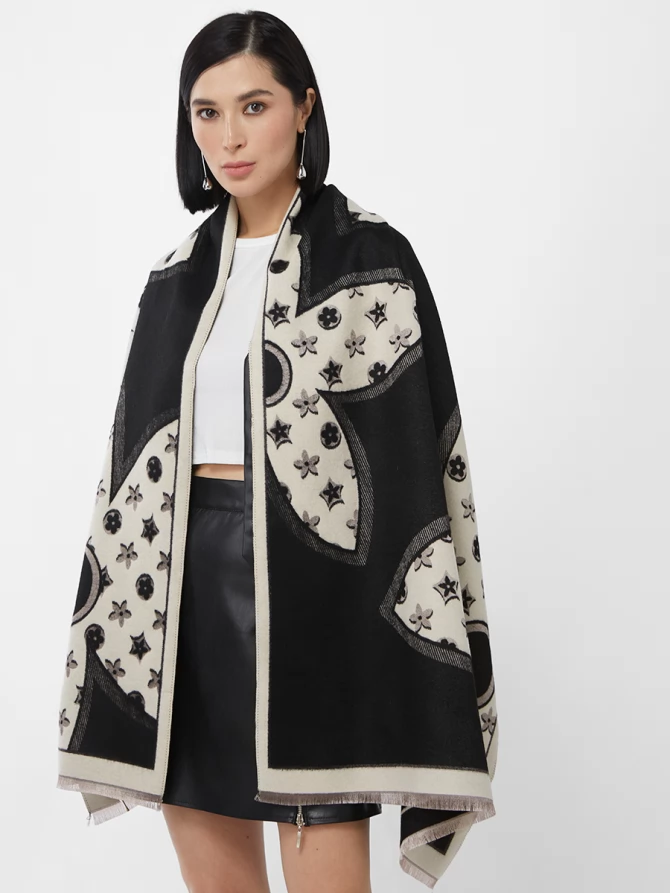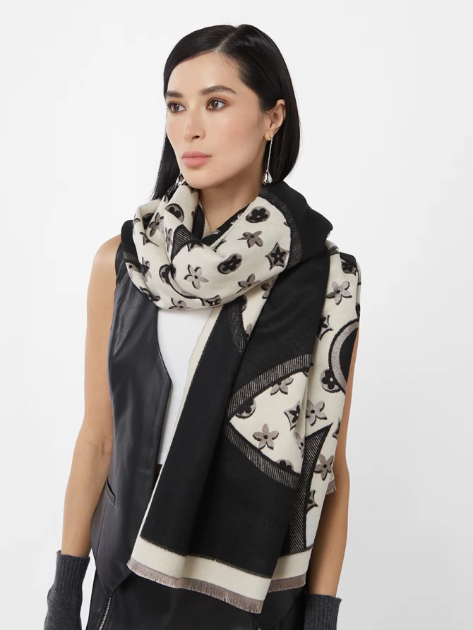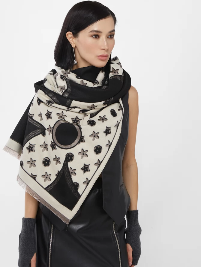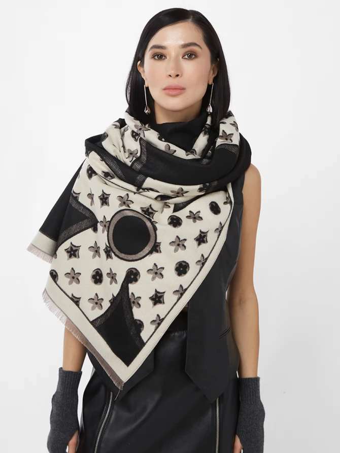 Особенность модели – её двусторонний дизайн: одна сторона доминирует черным фоном с молочными акцентами, другая – наоборот. Это дает возможность менять настроение образа по желанию. Благодаря внушительной размерности, палантин можно драпировать множеством способов: накинуть на плечи для тепла, обернуть вокруг шеи для объема или использовать как стильную шаль.
