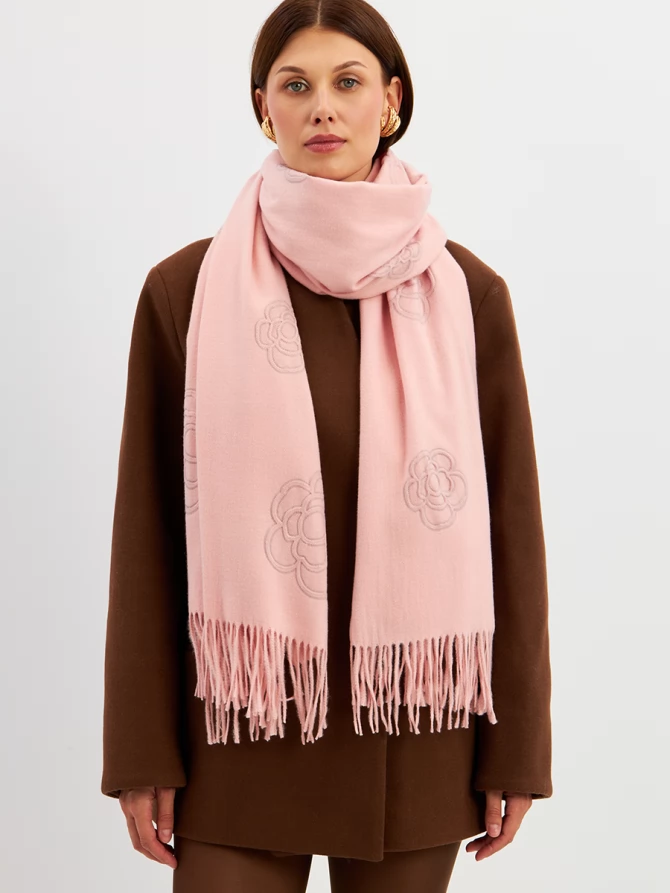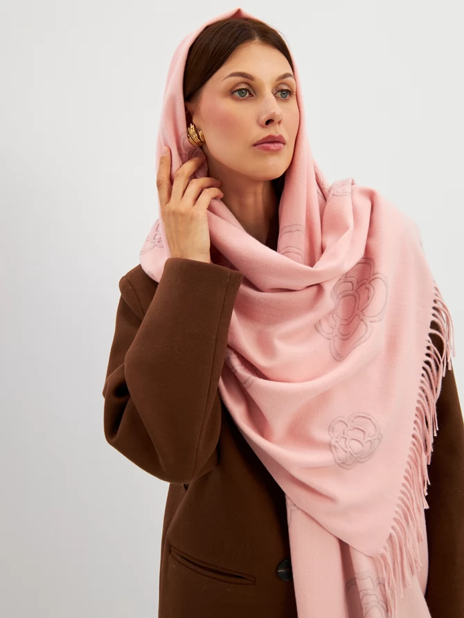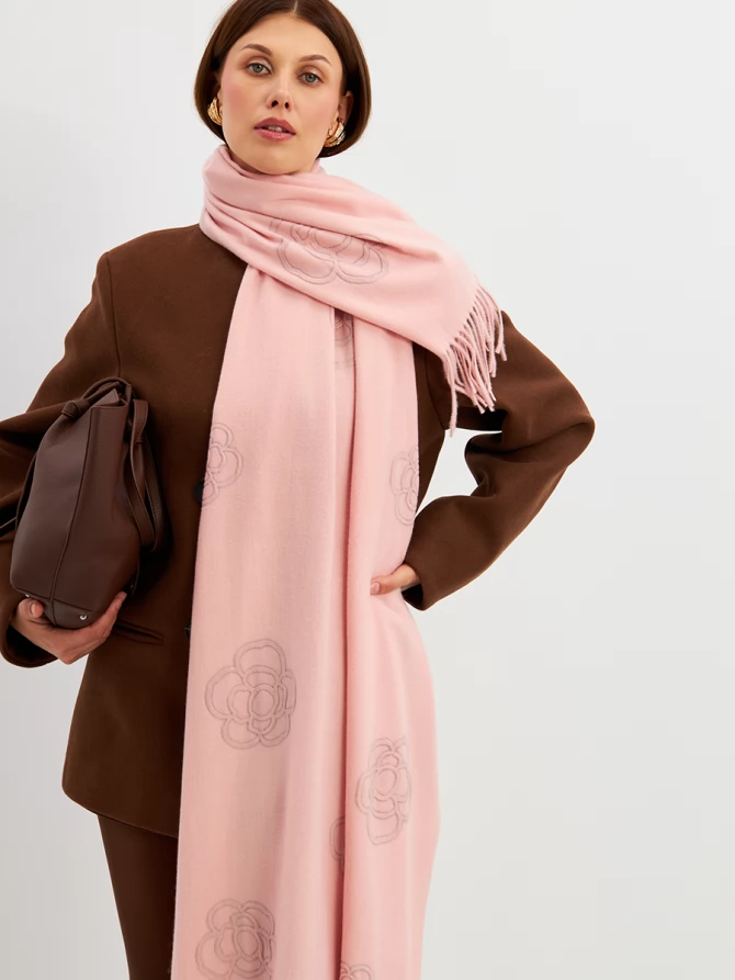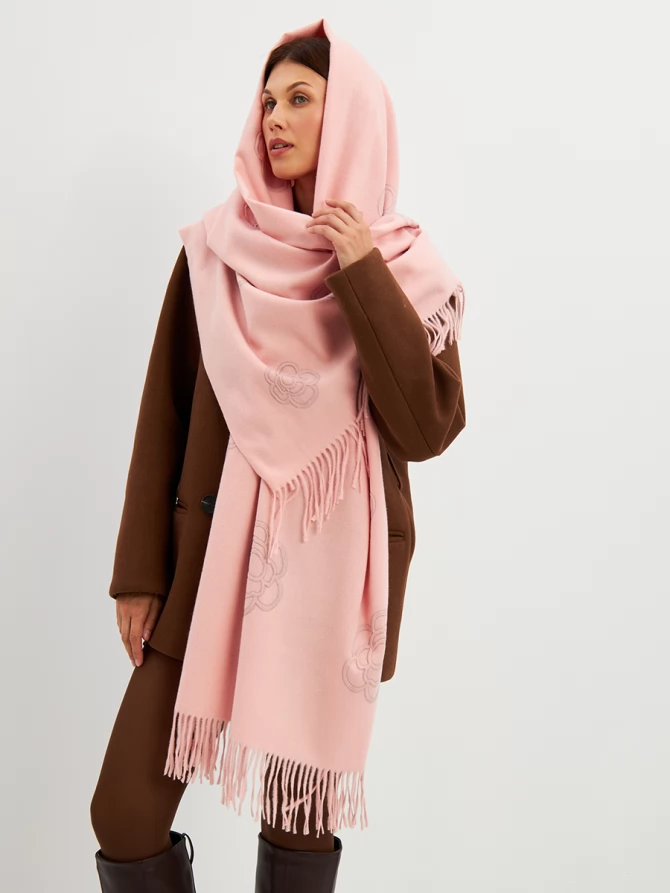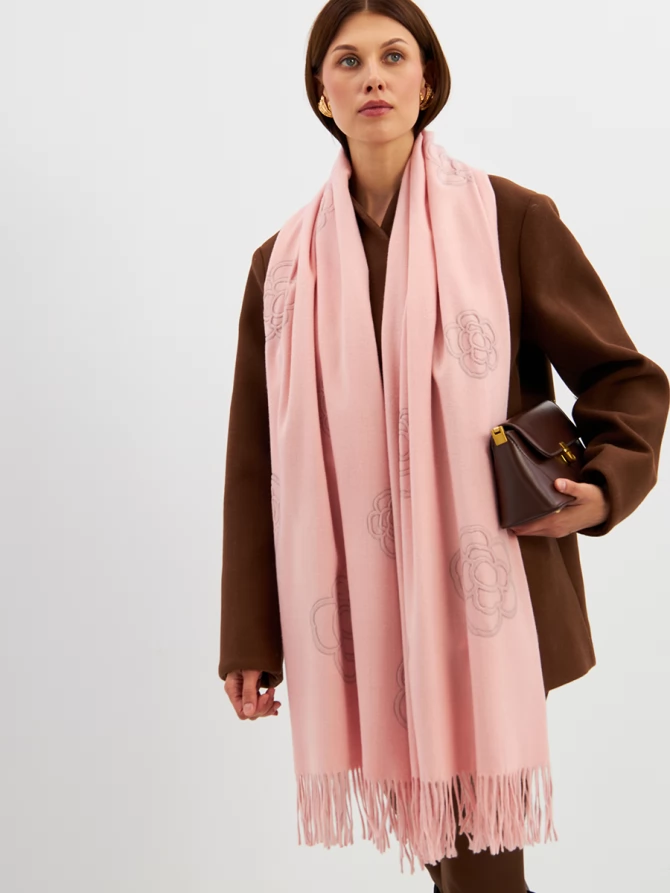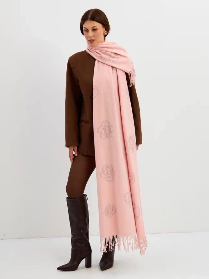 Выполненный в нежном однотонном оттенке, палантин украшен изысканным цветочным принтом-печатью, который придает ему особый шарм. Модный узор отражает актуальные мировые тренды, позволяя вам всегда оставаться в центре внимания. Края изделия деликатно оформлены стильной бахромой, добавляя изящества.