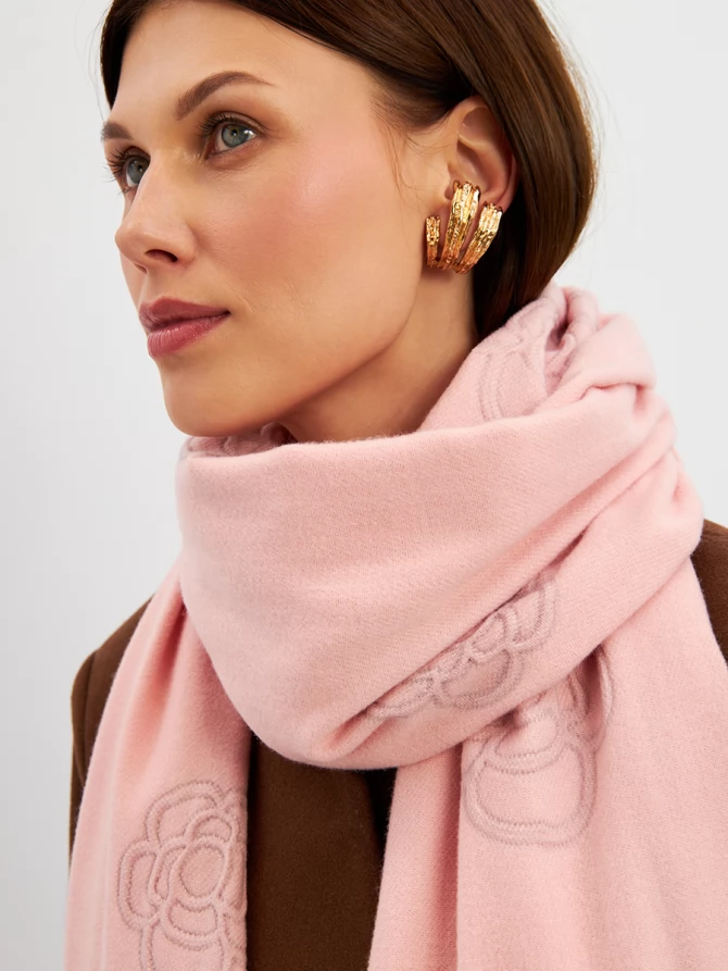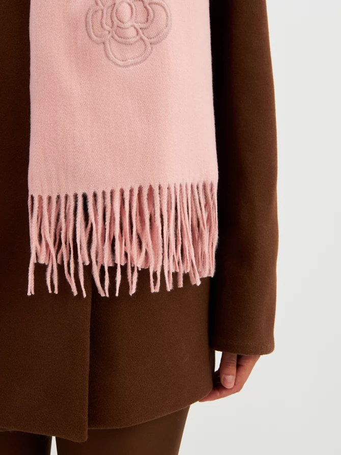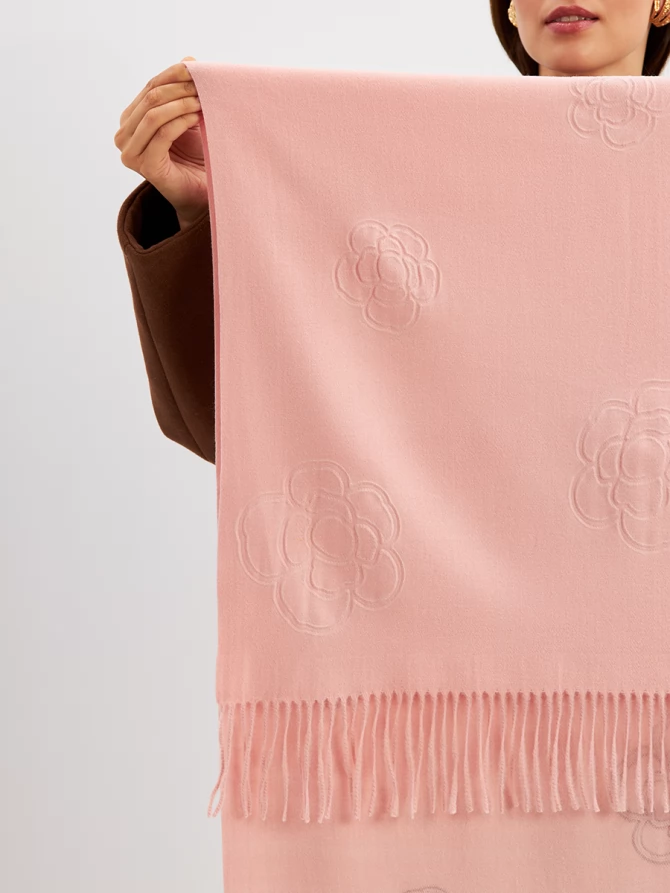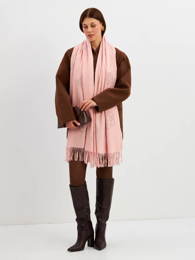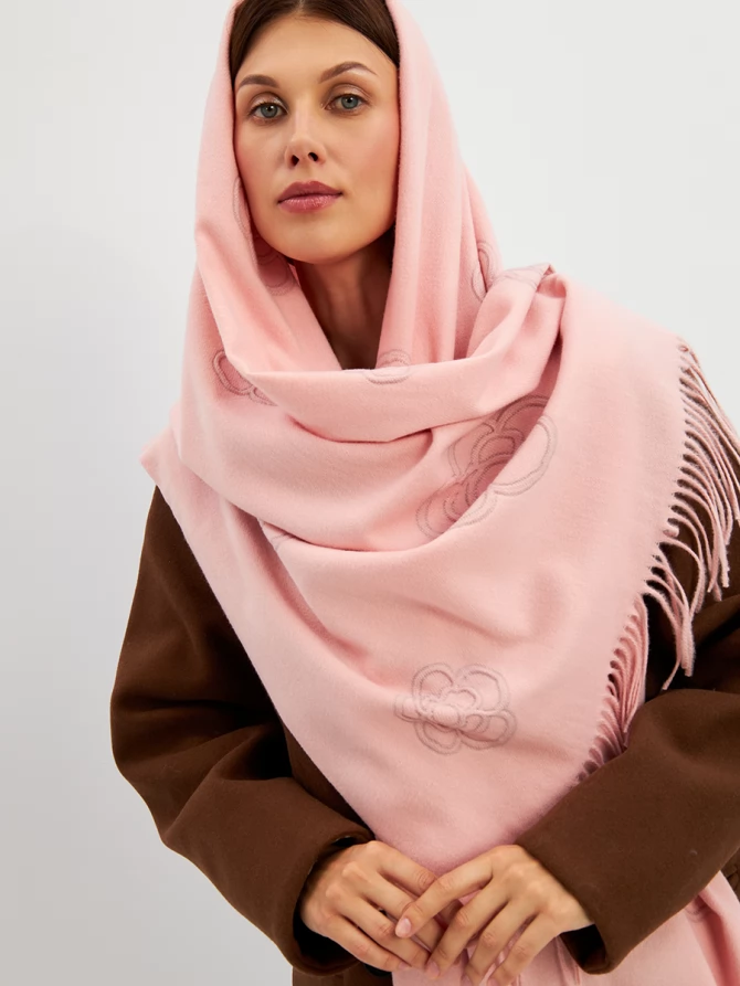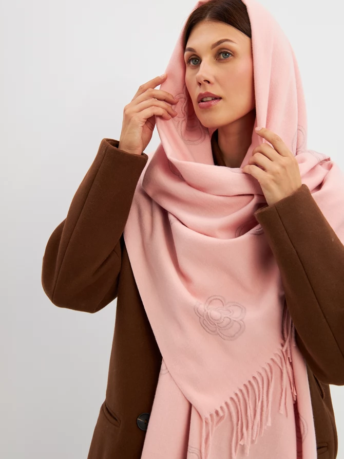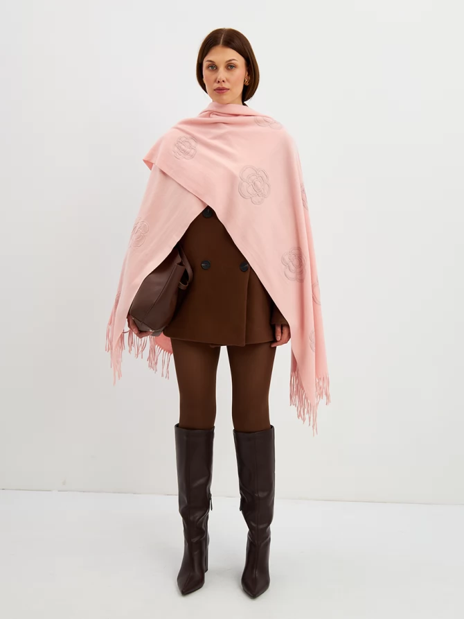 Выполненный в нежном однотонном оттенке, палантин украшен изысканным цветочным принтом-печатью, который придает ему особый шарм. Модный узор отражает актуальные мировые тренды, позволяя вам всегда оставаться в центре внимания. Края изделия деликатно оформлены стильной бахромой, добавляя изящества.