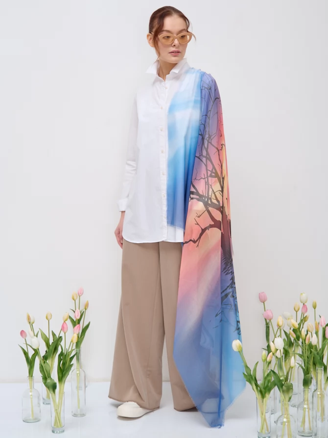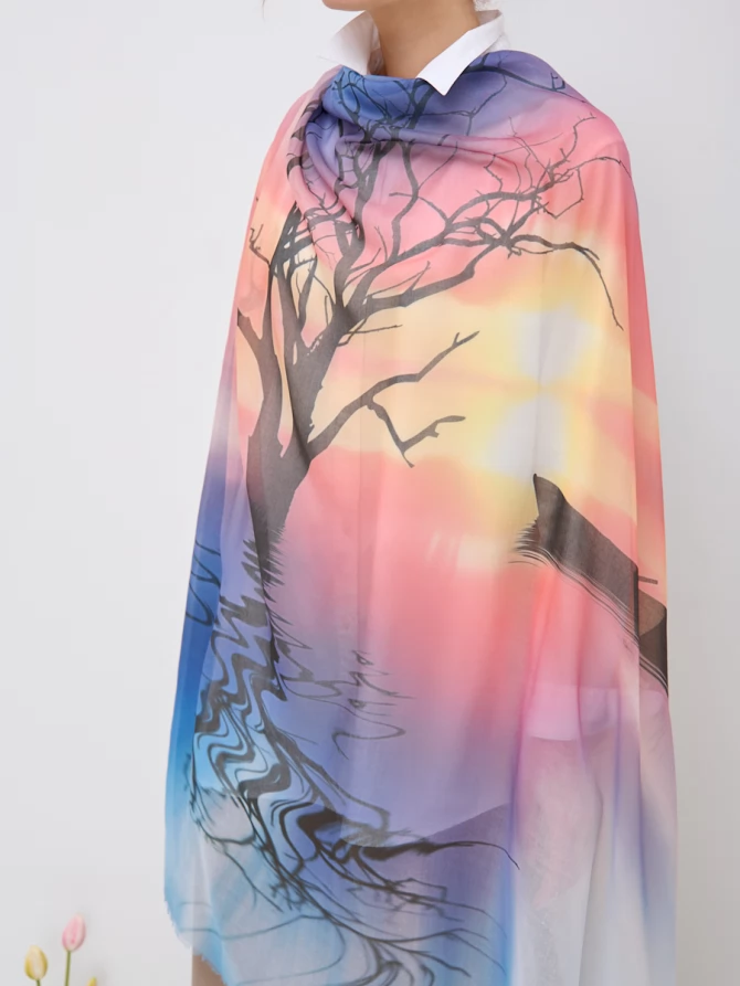 Представляем вашему вниманию большой двусторонний платок, который очаровывает своим уникальным принтом. Его рисунок словно переносит вас в живописный пейзаж: на одной стороне раскинулся завораживающий градиент от небесно-голубого до нежных оттенков заката, где силуэты деревьев создают атмосферу таинственности и спокойствия. Такой смелый и актуальный принт отражает мировые тенденции в дизайне, позволяя вам всегда быть на пике моды.