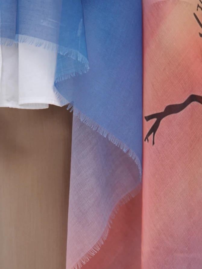 Особое внимание привлекает необычная текстура ткани, которая делает платок невероятно приятным на ощупь и обеспечивает красивую драпировку. Края изделия деликатно украшены бахромой, добавляющей легкости и игривости. Благодаря двустороннему дизайну, вы получаете два настроения в одном аксессуаре, легко меняя акценты в зависимости от вашего образа и настроения.