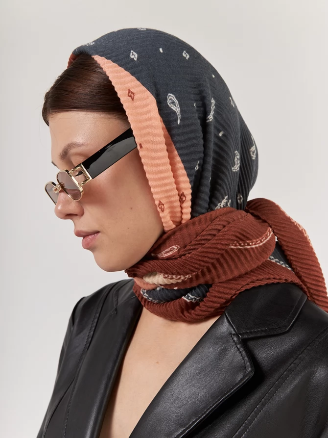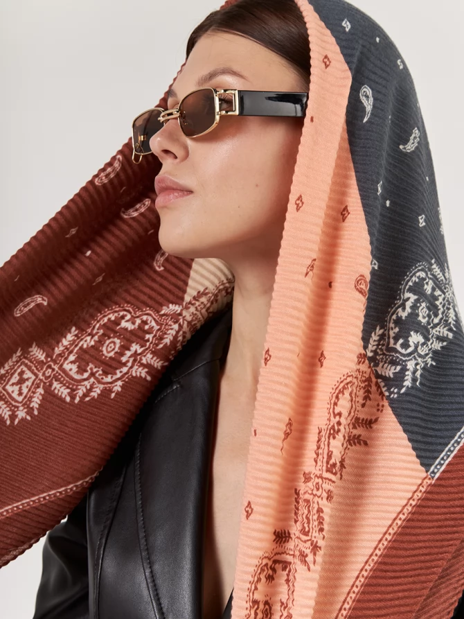 Он большой, мягкий, тонкий и невероятно нежный на ощупь, словно легкое облако. Изысканный принт с элегантными элементами пейсли, выполненный в гармоничном сочетании терракотового, персикового, графитового и светло-бежевого оттенков, придает ему особую привлекательность. Этот аксессуар – воплощение актуальных мировых трендов и нашего стремления к уникальному дизайну.