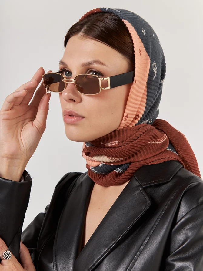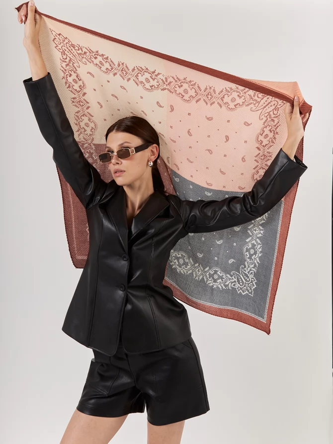 Идеальная посадка и драпировка платка позволяют экспериментировать с образами: носите его как элегантный головной убор, стильно повязывайте на шею или используйте как акцентный элемент на вашей сумочке. Он добавит вашему наряду нотку роскоши и индивидуальности, подчеркивая вашу неповторимую женственность и чувство стиля.