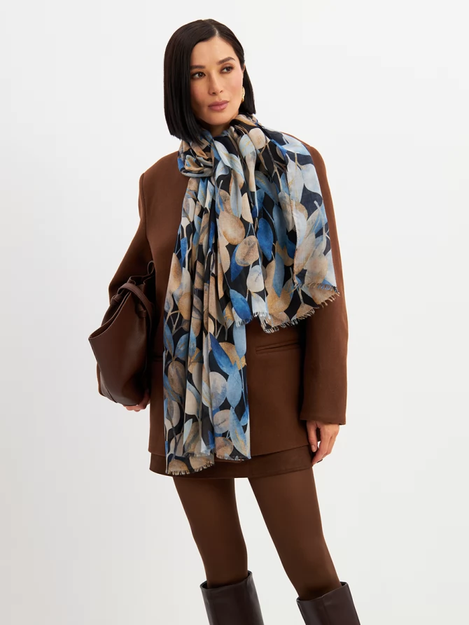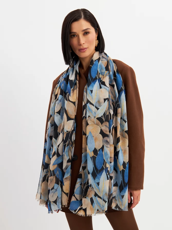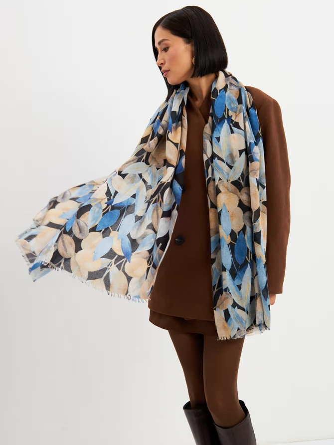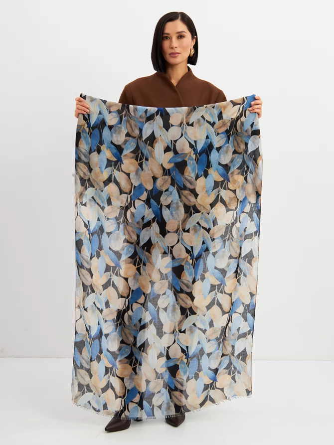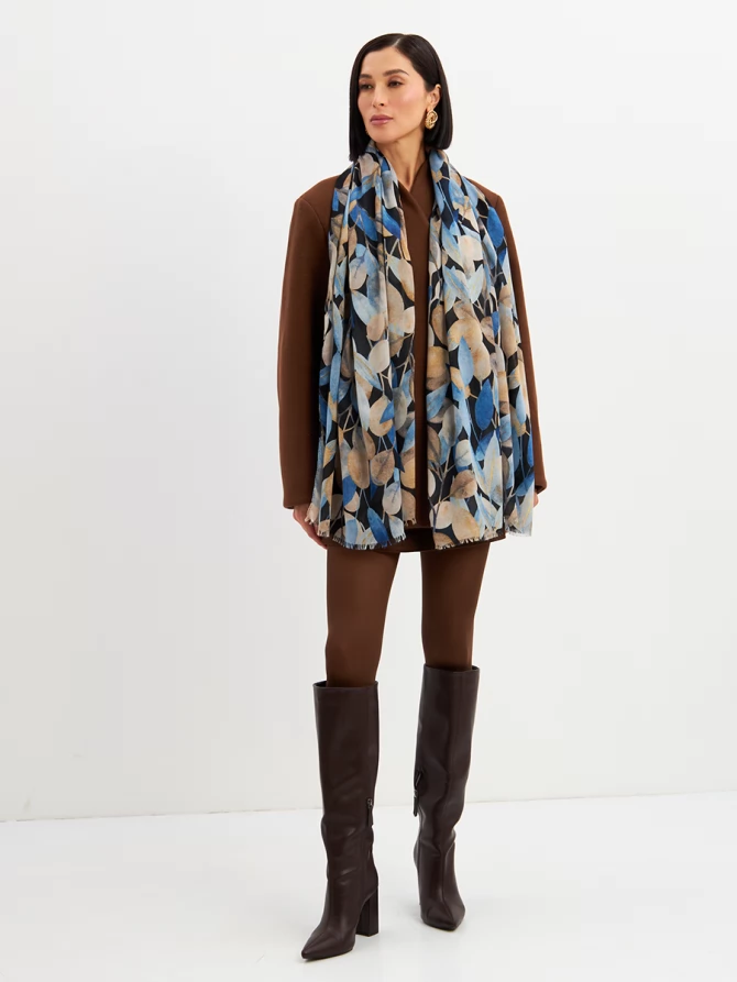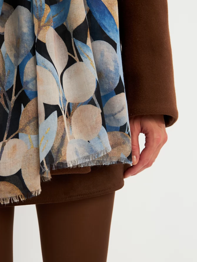 Принт со стилизованными листьями в гармоничных синих, лазурных и бежевых оттенках на темном фоне – воплощение мировых модных тенденций. Каждый элемент рисунка продуман до мелочей. Бахрома ручной работы подчеркивает эксклюзивность и внимание TANTINO к деталям.