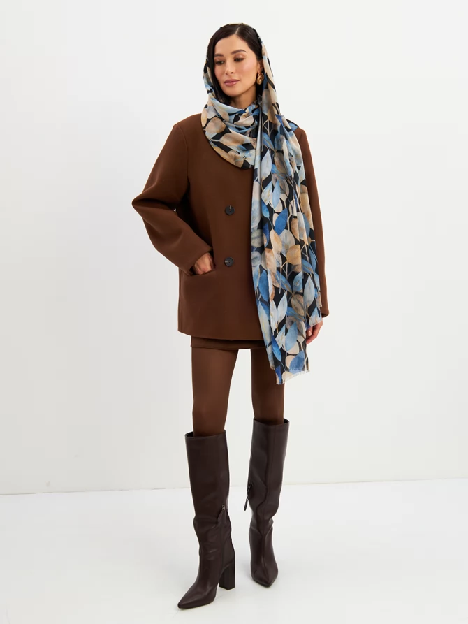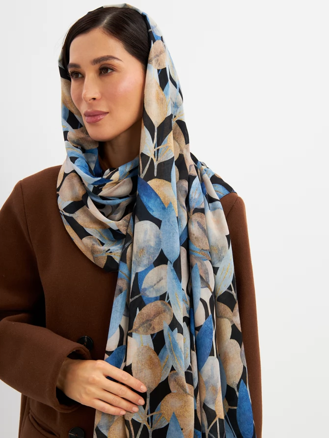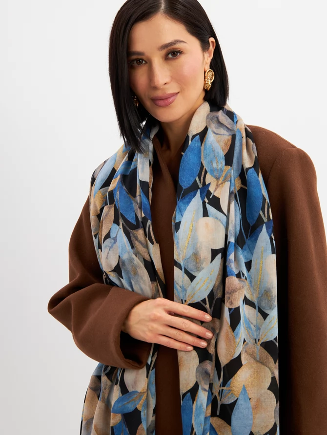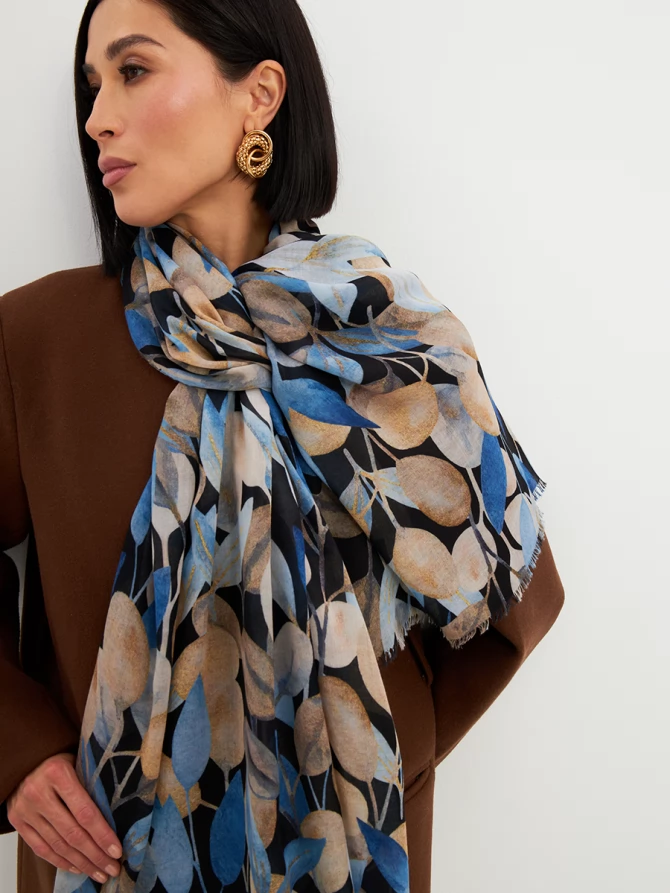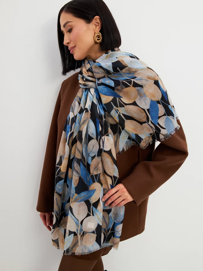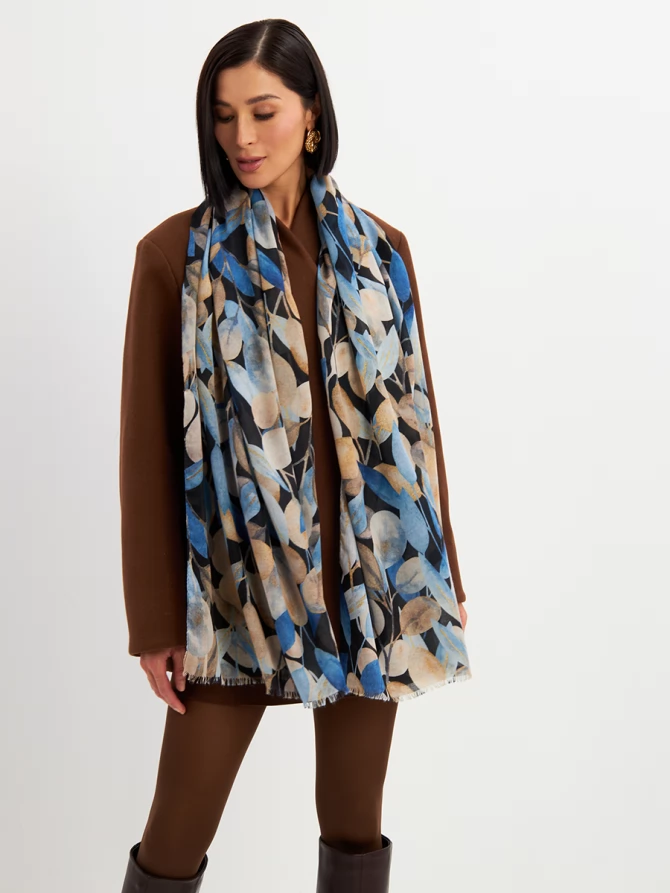 Принт со стилизованными листьями в гармоничных синих, лазурных и бежевых оттенках на темном фоне – воплощение мировых модных тенденций. Каждый элемент рисунка продуман до мелочей. Бахрома ручной работы подчеркивает эксклюзивность и внимание TANTINO к деталям.