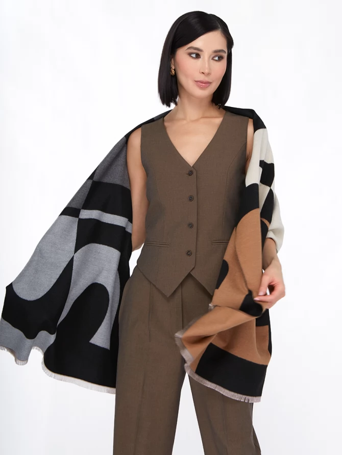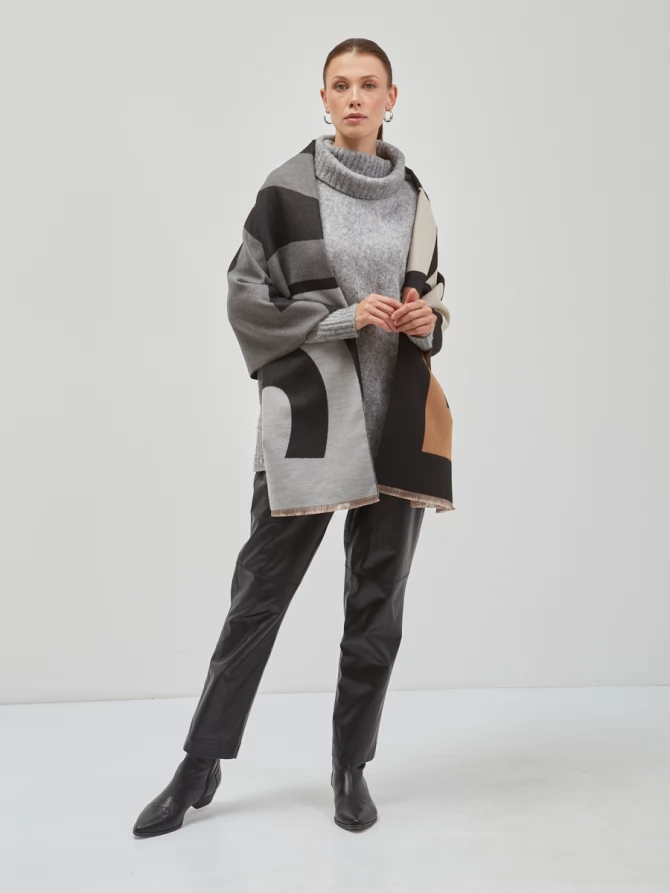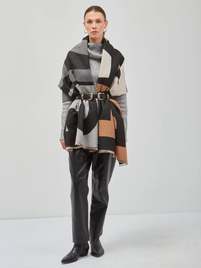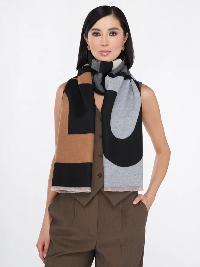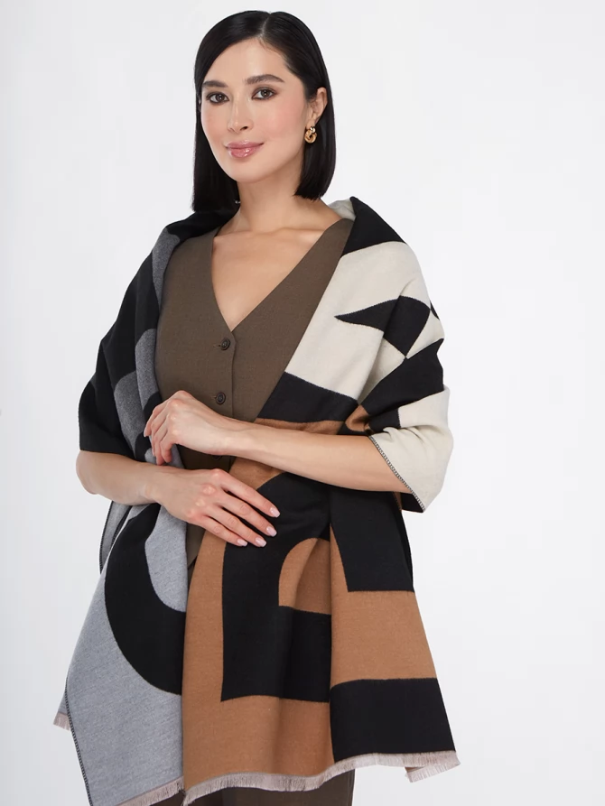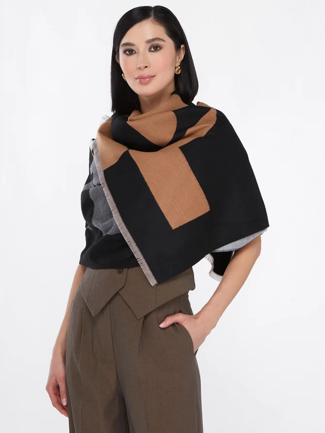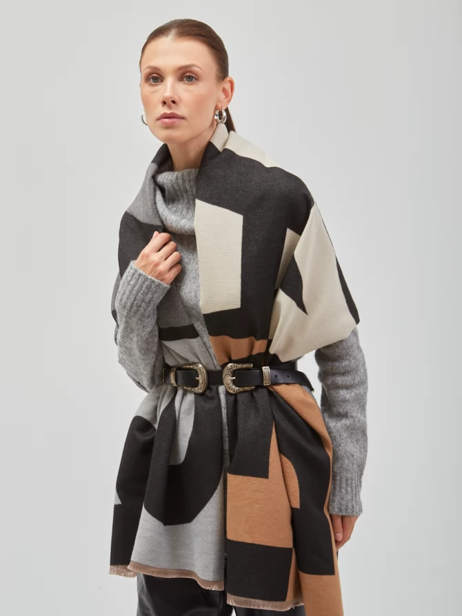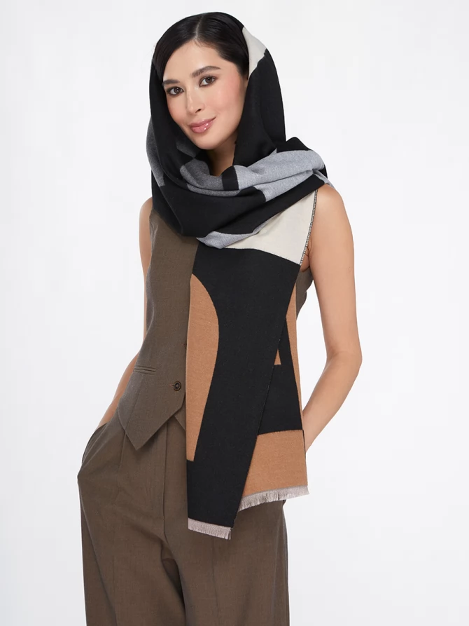 Сочетание глубокого черного, нежного айвори и теплых оттенков camel, дополненное акцентами серого, делает его невероятно универсальным. Крупный, динамичный рисунок выполнен с безупречным чувством стиля, отражая актуальные мировые тренды. Это не просто палантин, это произведение искусства, которое легко трансформирует ваш повседневный наряд в элегантный вечерний или стильный деловой образ.