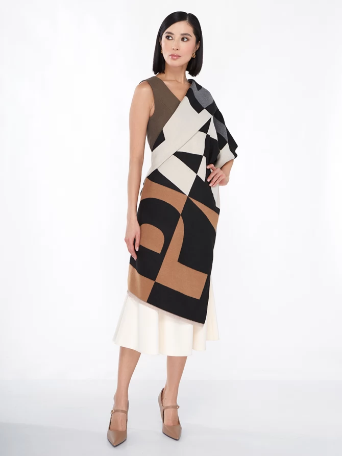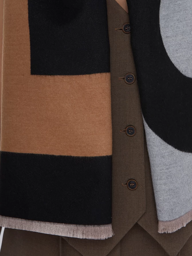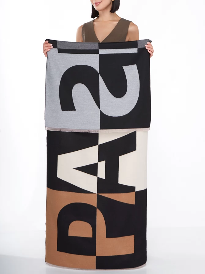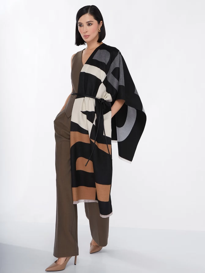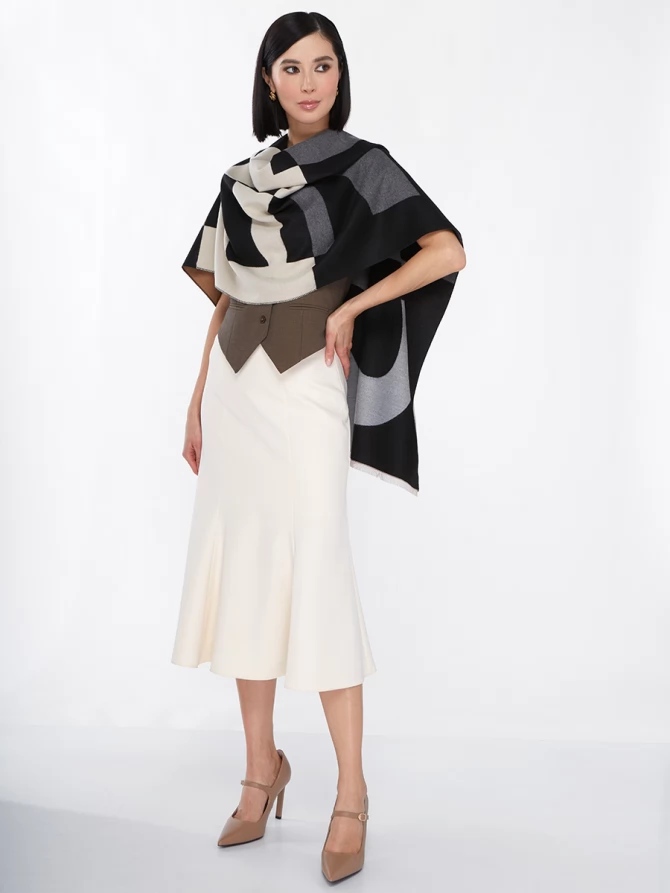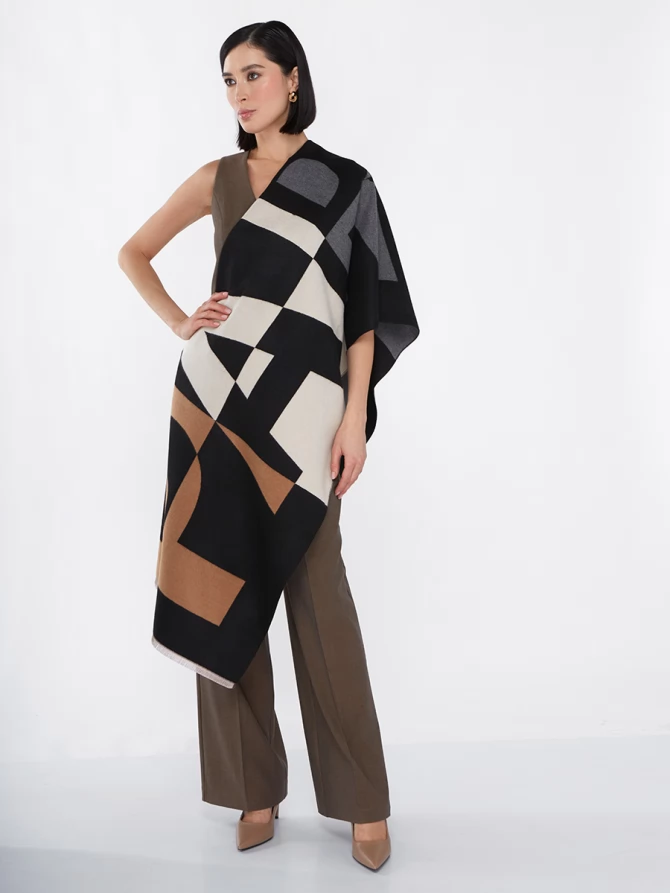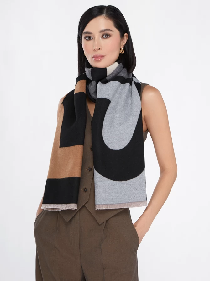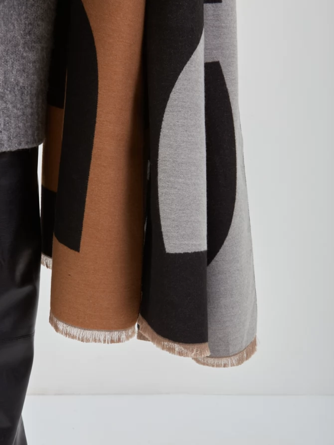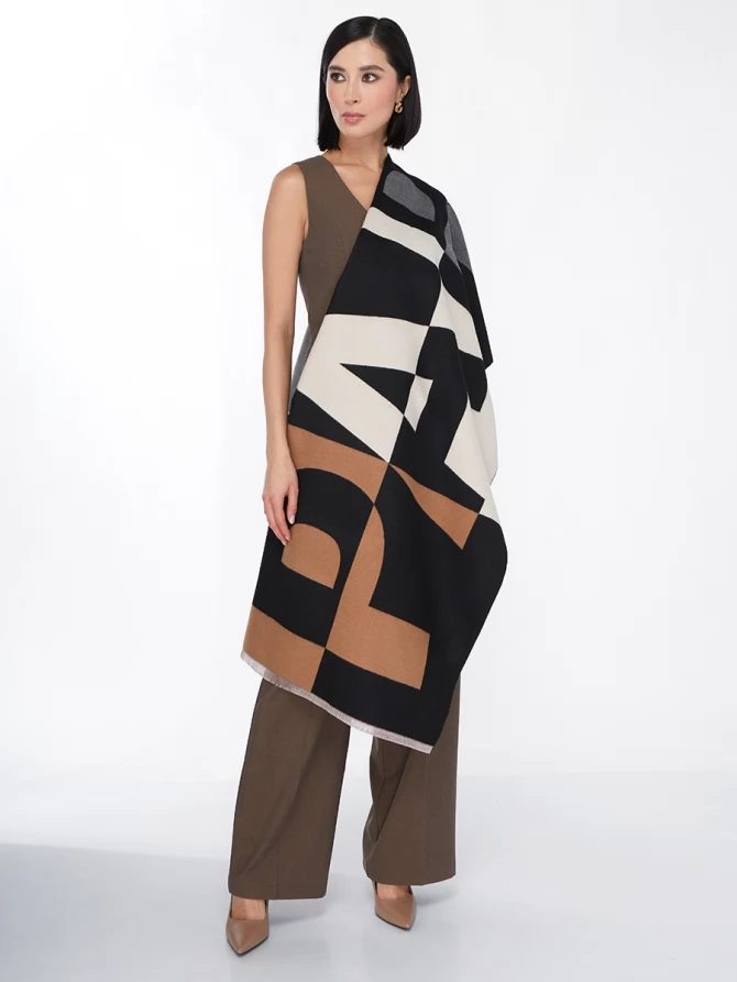 Сочетание глубокого черного, нежного айвори и теплых оттенков camel, дополненное акцентами серого, делает его невероятно универсальным. Крупный, динамичный рисунок выполнен с безупречным чувством стиля, отражая актуальные мировые тренды. Это не просто палантин, это произведение искусства, которое легко трансформирует ваш повседневный наряд в элегантный вечерний или стильный деловой образ.