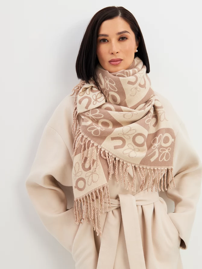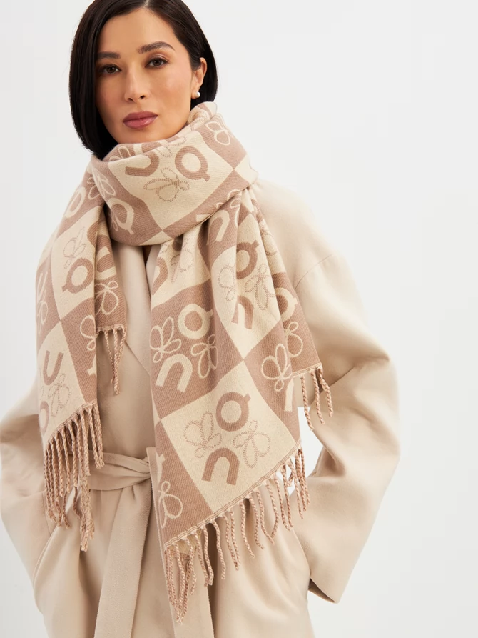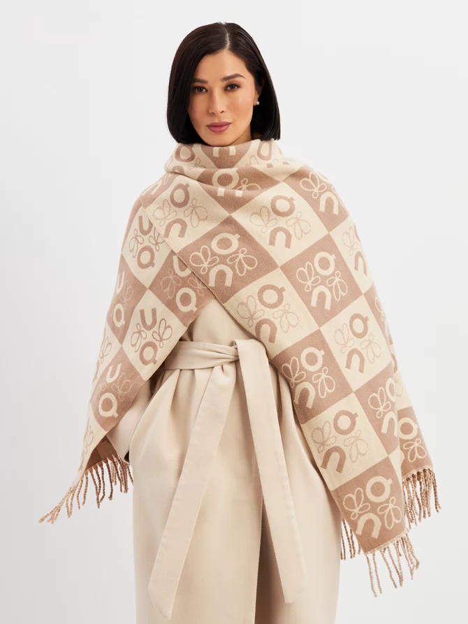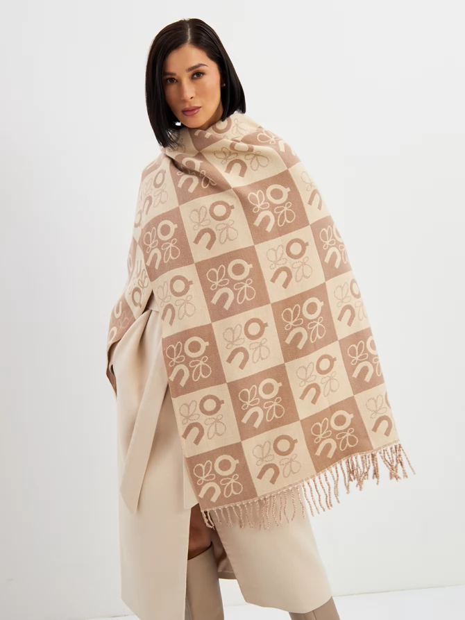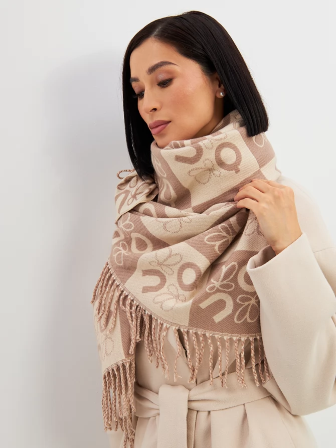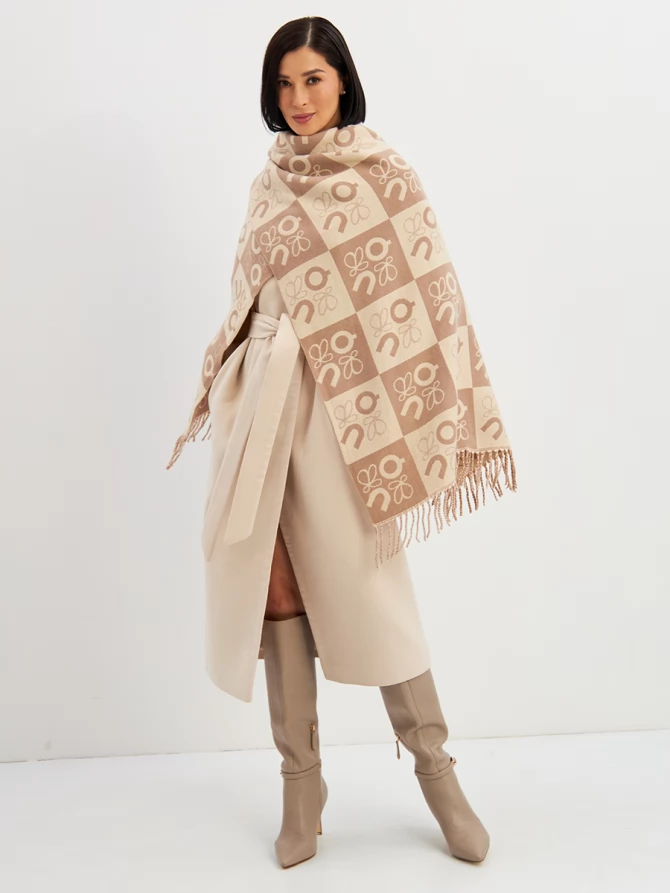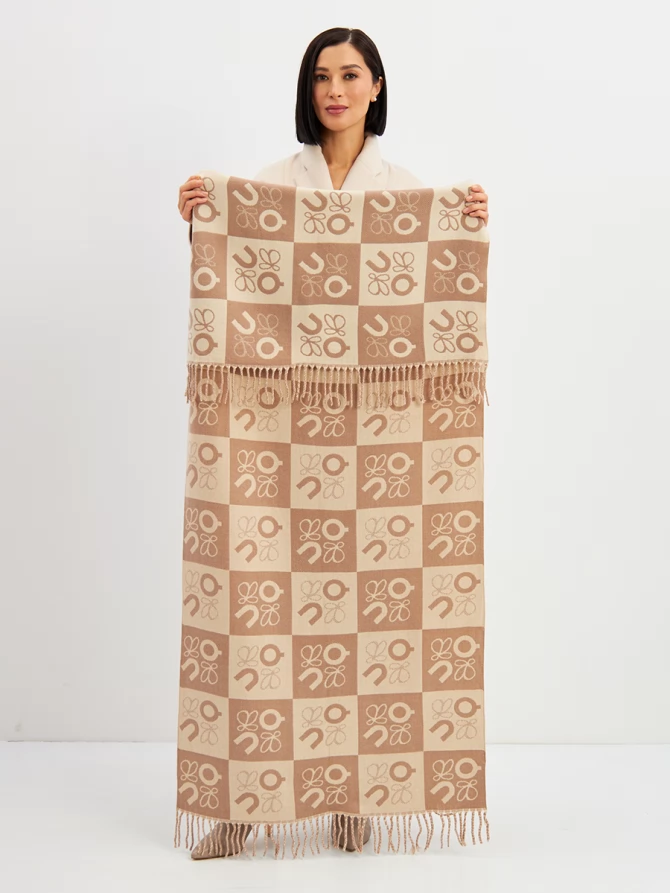 Наш большой, невероятно мягкий и нежный палантин выполнен из тонкой ткани, которая приятно обволакивает, даря ощущение тепла и уюта. Его уникальный рисунок – это стильное сочетание бежевых и кремовых оттенков в клетчатом дизайне с авторскими элементами, напоминающими монограммы или символы, что придает аксессуару особую изысканность. Эти акцентные детали выделят вас из толпы, подчеркивая вашу индивидуальность и тонкий вкус.