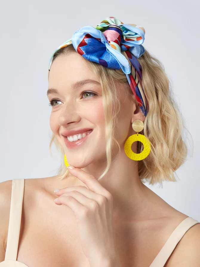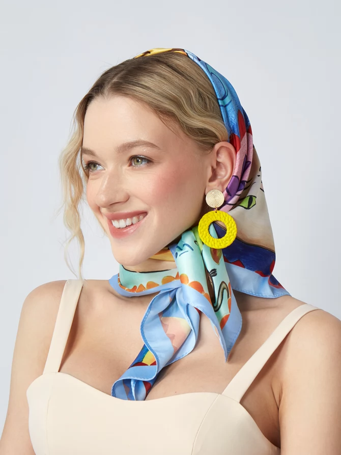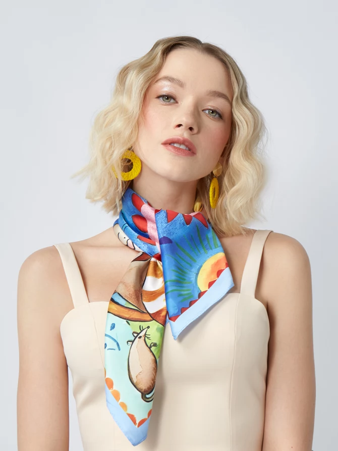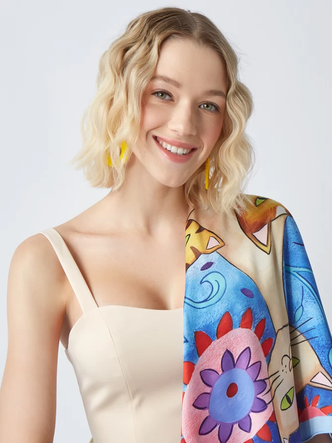 Мы сами разрабатываем и шьем каждое наше изделие, и этот платок — яркое тому подтверждение. Его уникальный акварельный принт, вдохновленный последними мировыми трендами, представляет собой гармоничное сочетание ярких красок и абстрактных форм. Глубокие синие, огненные красные, нежные розовые и солнечные желтые оттенки переплетаются в изысканном узоре, который моментально притягивает взгляды и подчеркивает вашу индивидуальность.