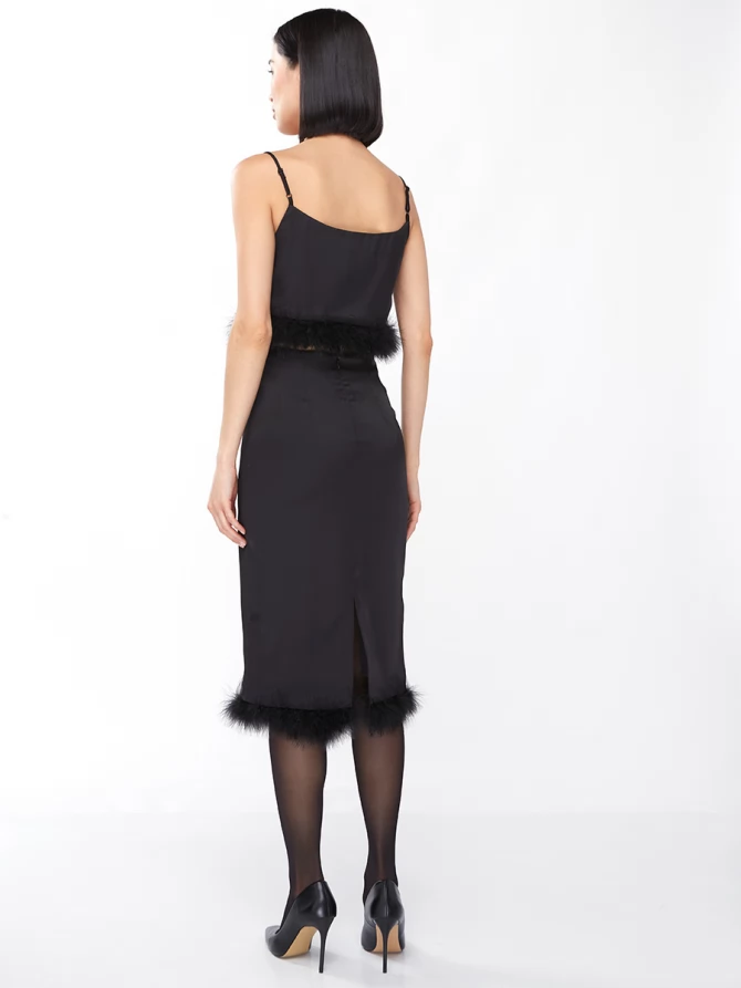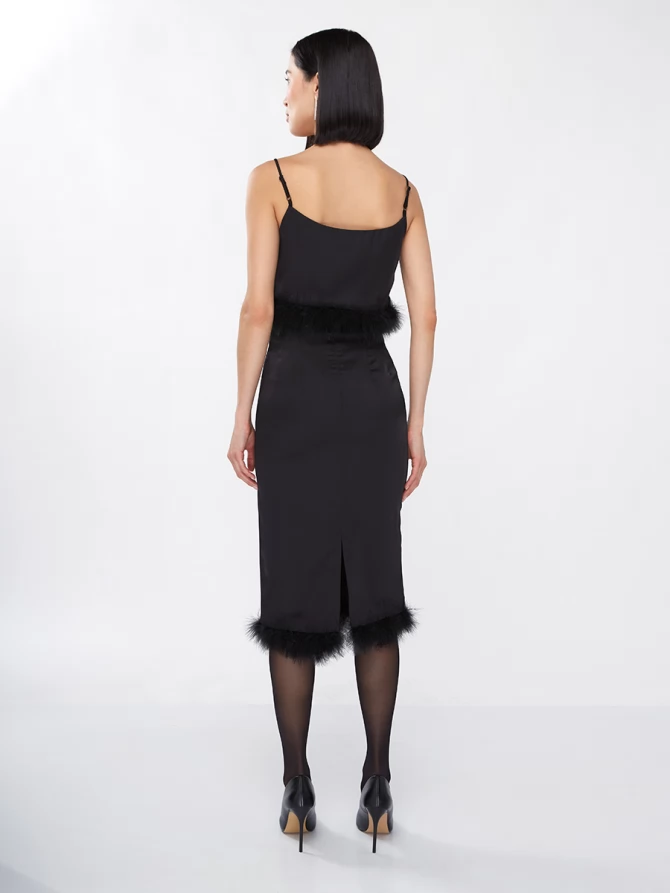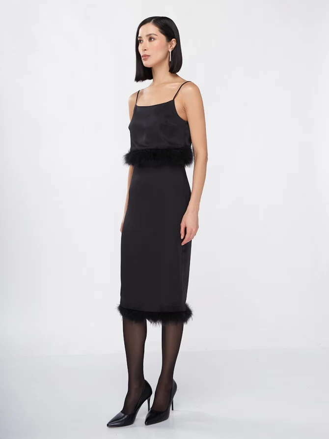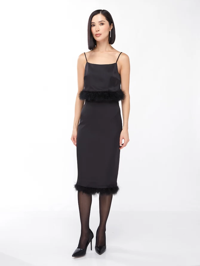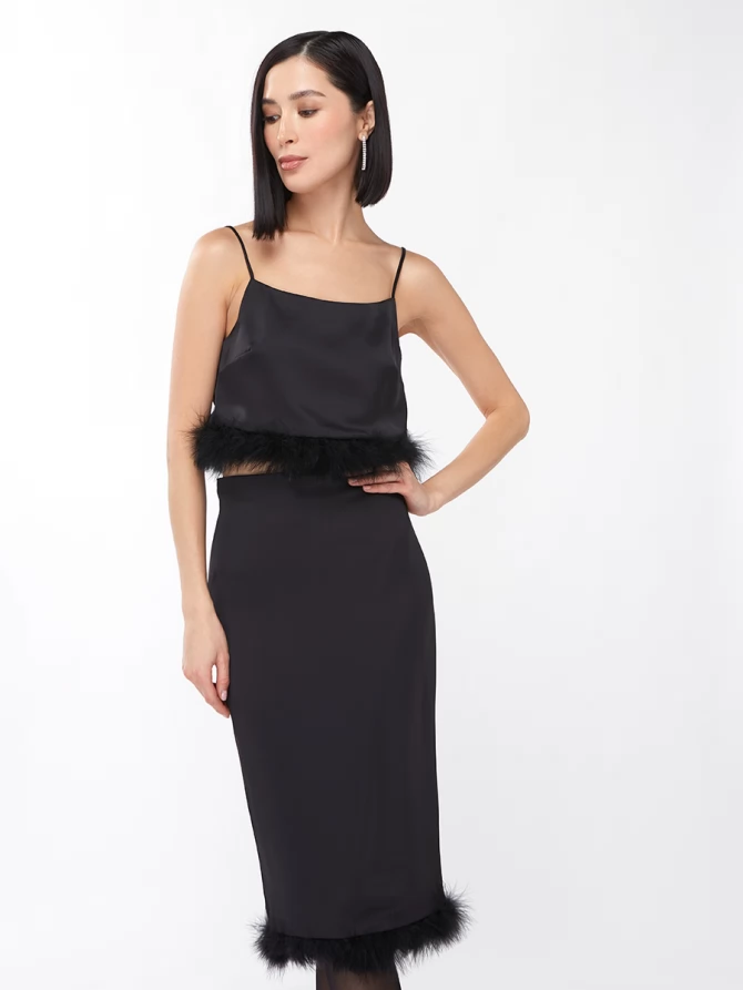 Эта модель — воплощение смелого fashion-заявления. Классический черный цвет в сочетании с ультрамодными декоративными перьями на подоле превращает юбку в звезду любого гардероба. Она создана для женщин, которые ценят эксклюзивность, высокое качество и хотят быть в центре внимания.