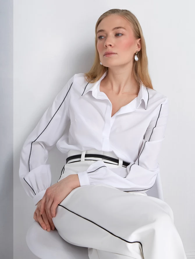 Брюки прямого силуэта, из однотонной костюмной ткани. Со стрелками. Высокая посадка. Карманы в боковой части полочки. Изделие с декоративным контрастным кантом. Декоративные листочки на спинке. Рост модели 170 см. Изделие на модели 42 р-ра. Длина изделия по боковому шву 115,4 см.