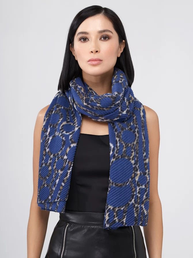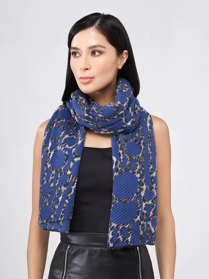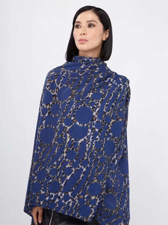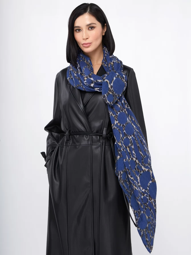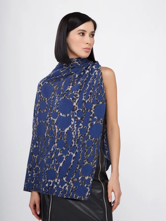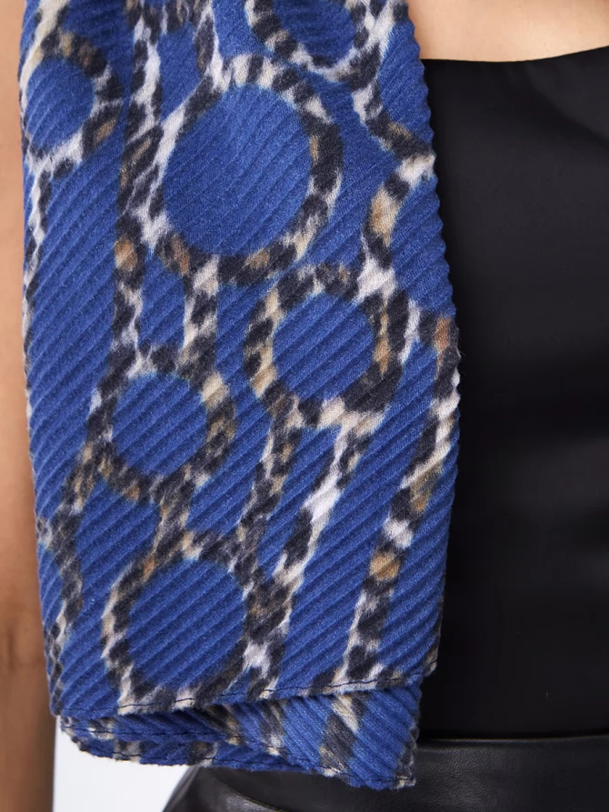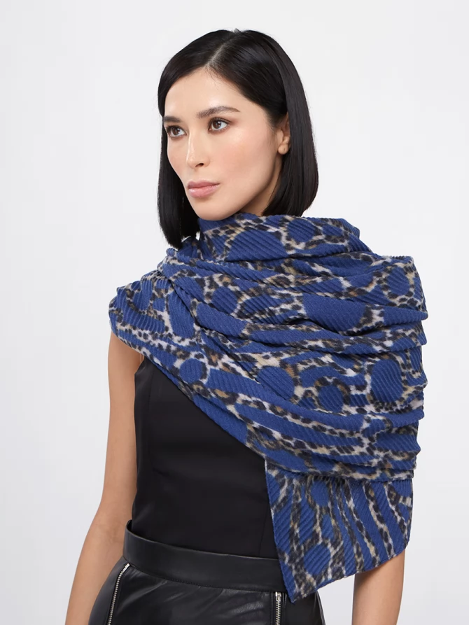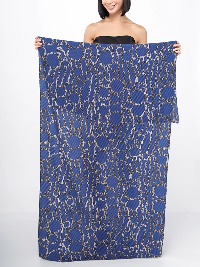 Этот двусторонний палантин – настоящее воплощение стиля и комфорта. Он большой, невероятно мягкий, тонкий и очень нежный на ощупь. Особая жатая текстура придает изделию уникальный объем и фактуру, а актуальный анималистичный принт в сине-бежевых тонах добавит нотку шика и современности вашему образу. Принт выполнен в абстрактной, художественной интерпретации, с преобладанием глубокого синего, делая его выразительным.