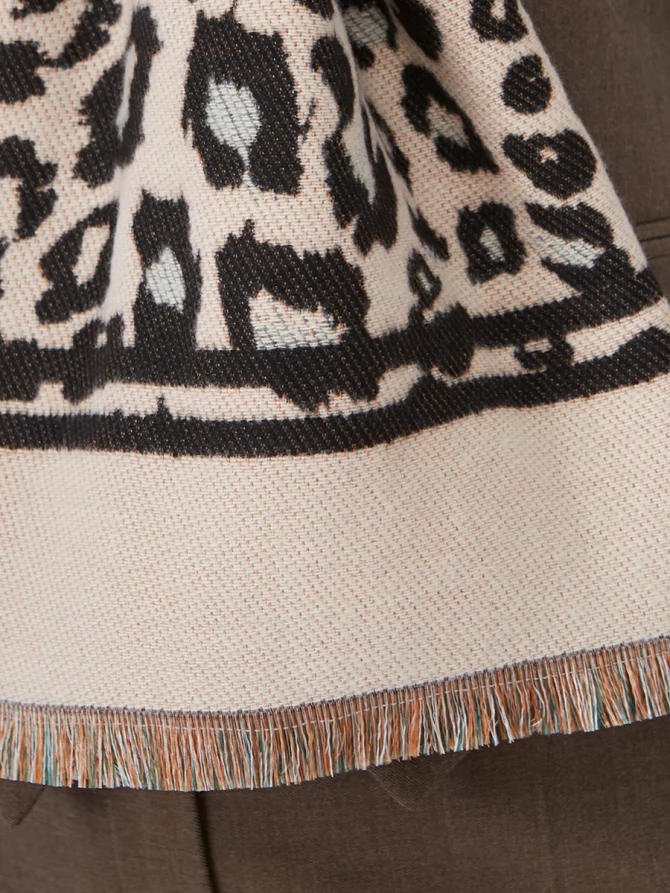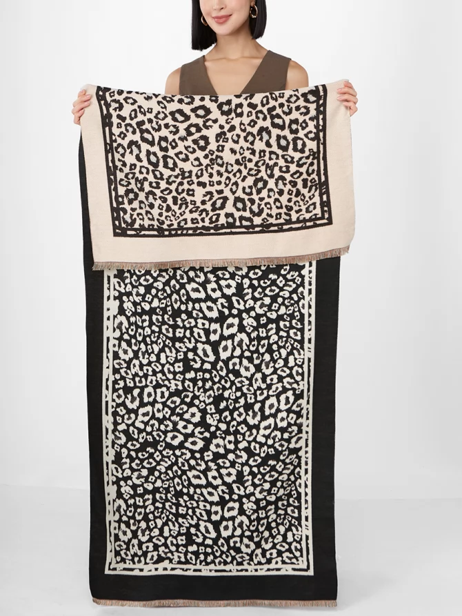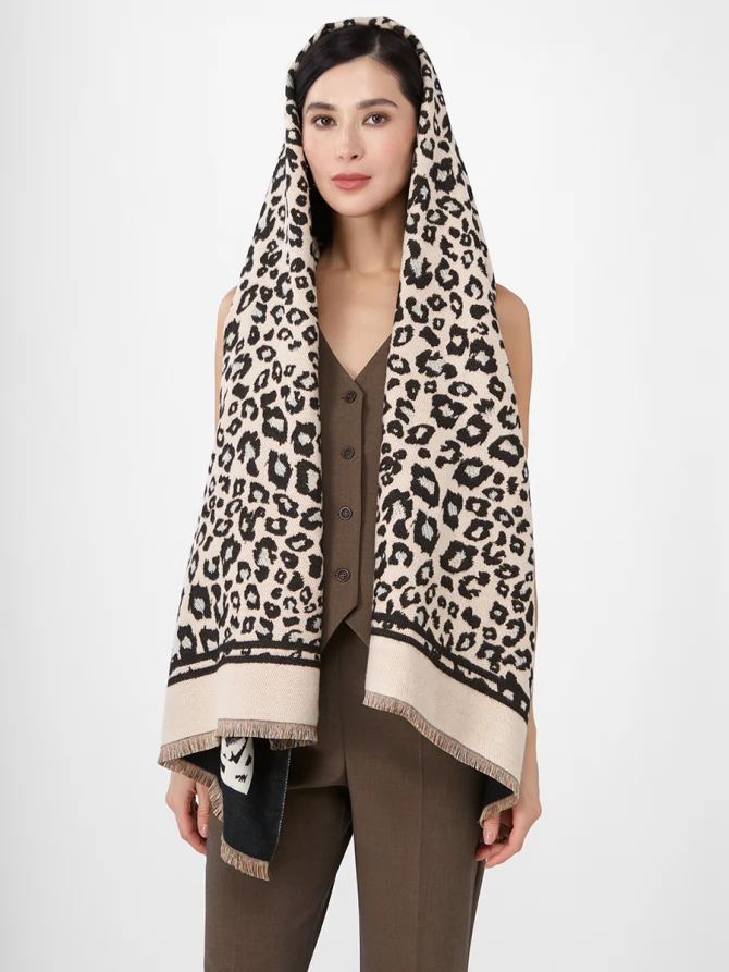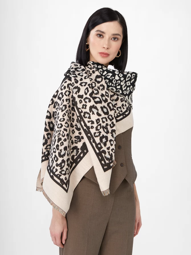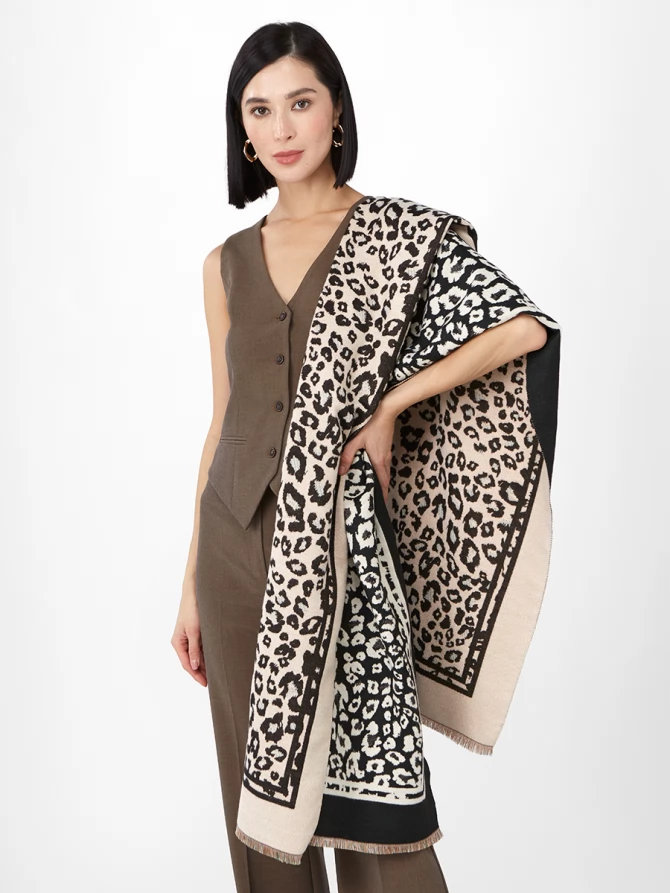 Этот большой, мягкий и теплый палантин – воплощение комфорта и элегантности. Его уникальность в двустороннем дизайне с актуальным леопардовым принтом. С одной стороны – роскошное сочетание бежевого фона с черными пятнами, с другой – эффектный черный фон с бежевыми акцентами. Это позволяет вам каждый день создавать новые образы, просто перевернув палантин!