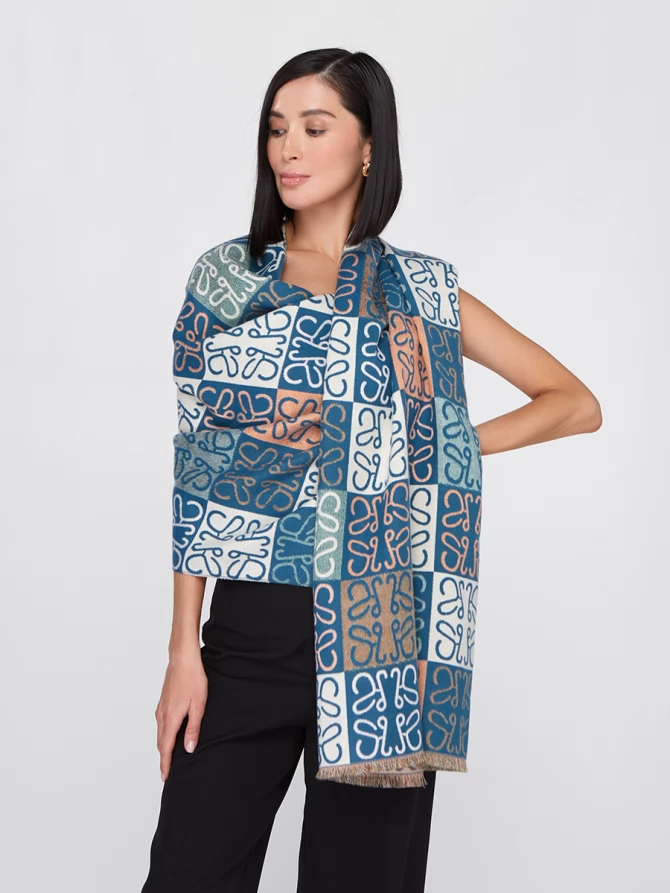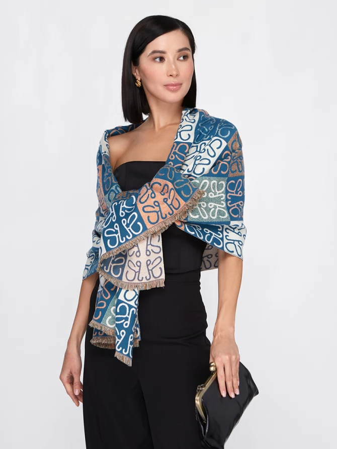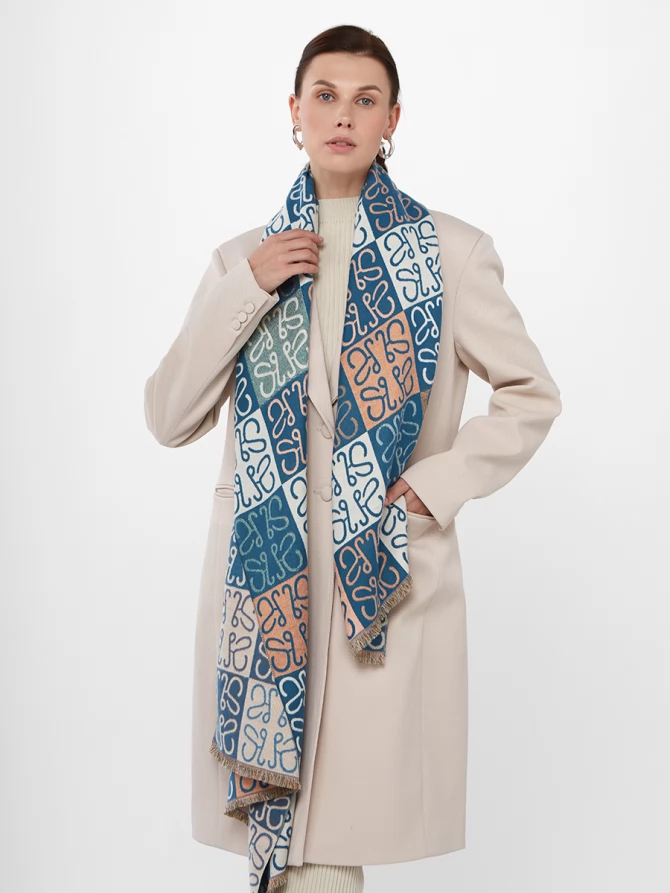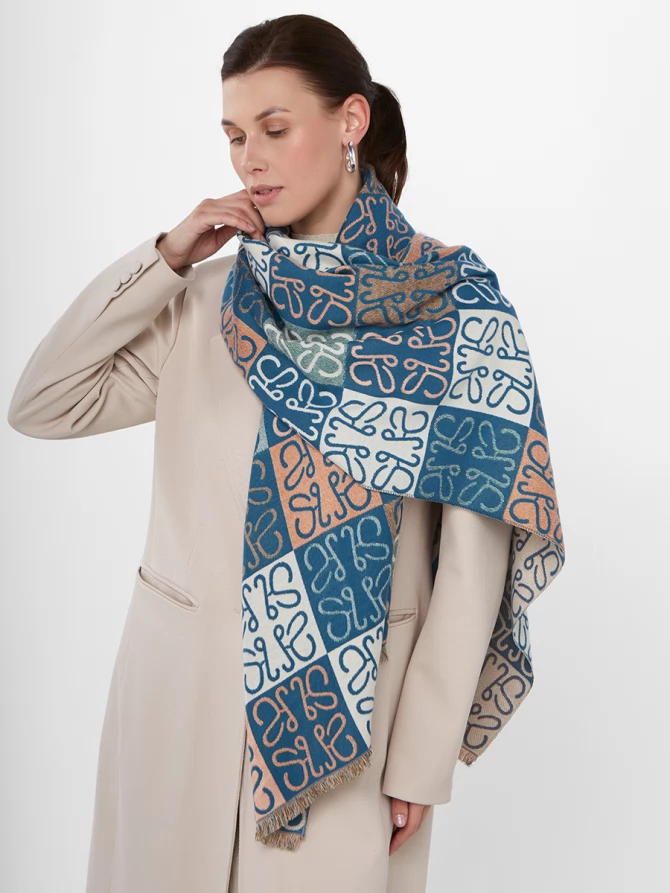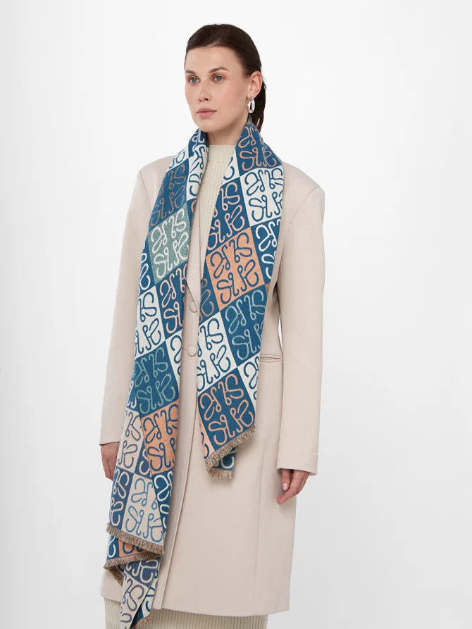 Представьте: большой, мягкий и невероятно теплый, он станет вашим незаменимым спутником в прохладную погоду. Его уникальный абстрактный узор в модных оттенках синего, бежевого и молочного выполнен в духе последних мировых трендов, добавляя изысканность любому образу. Двусторонняя конструкция позволяет каждый раз создавать новый акцент, играя с цветами и настроением.