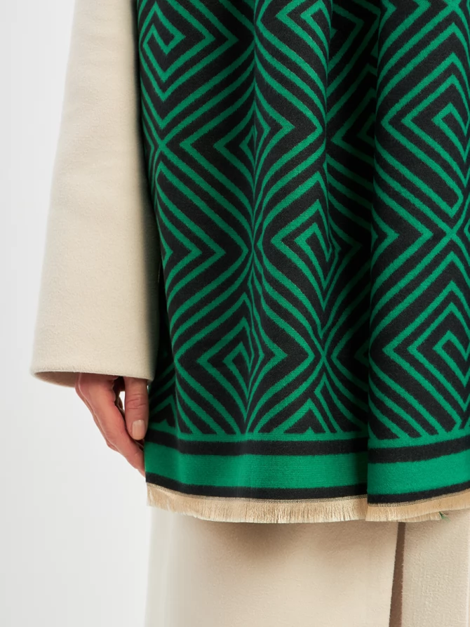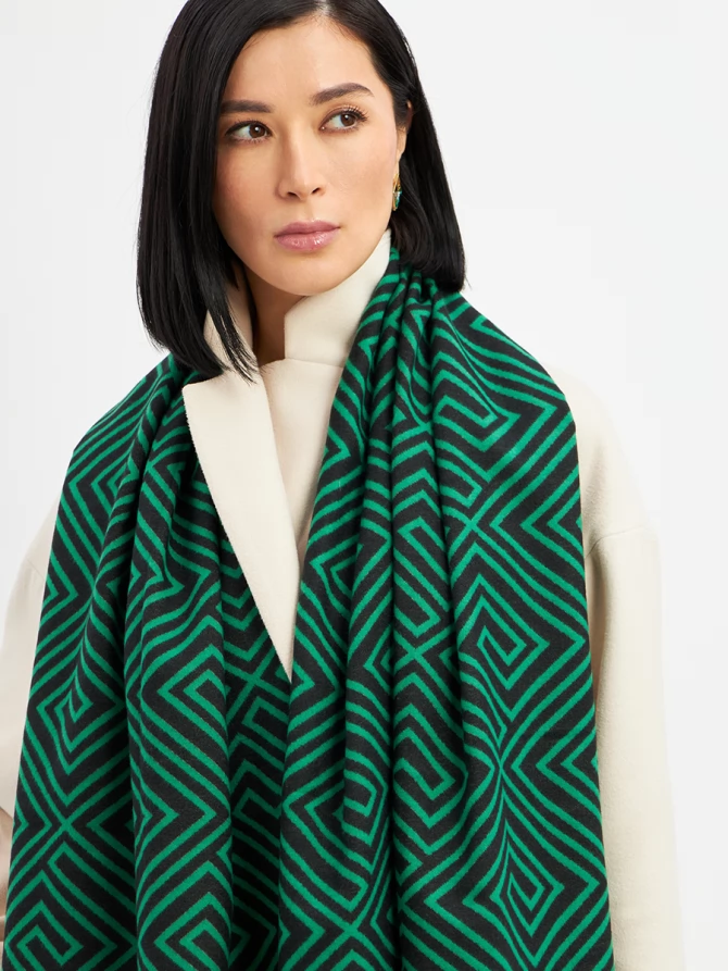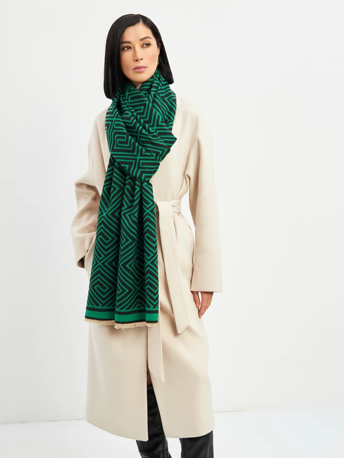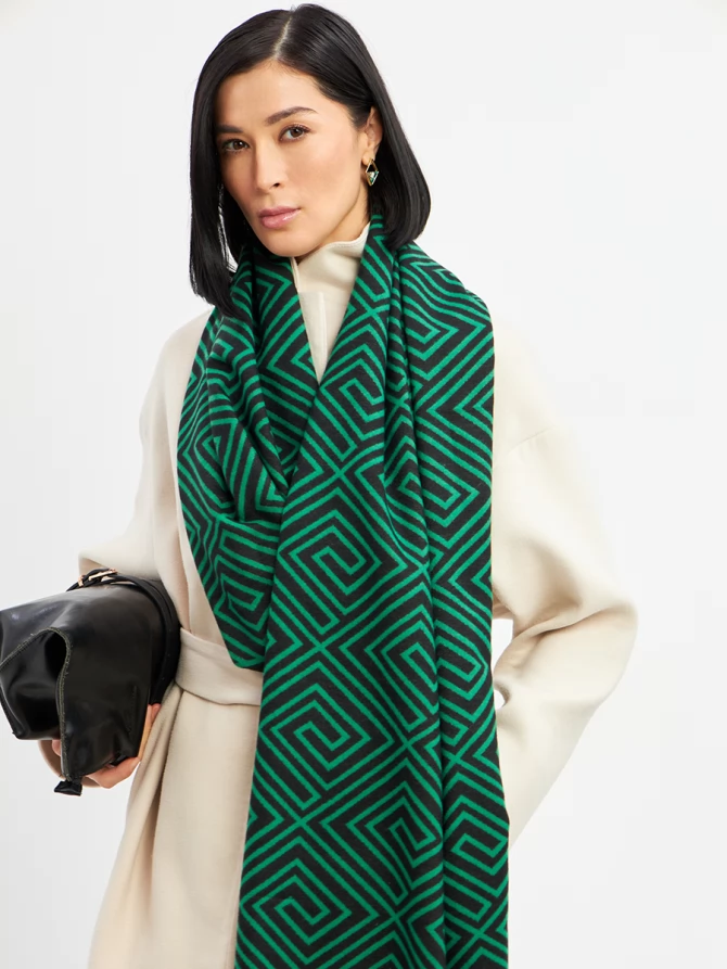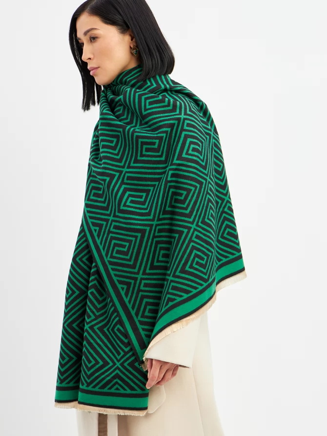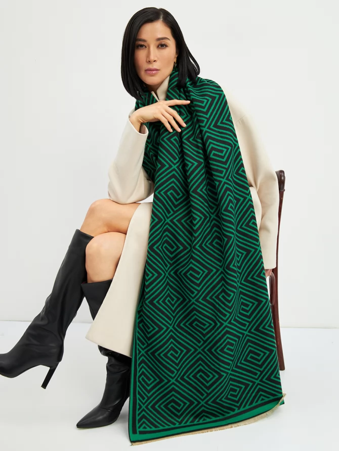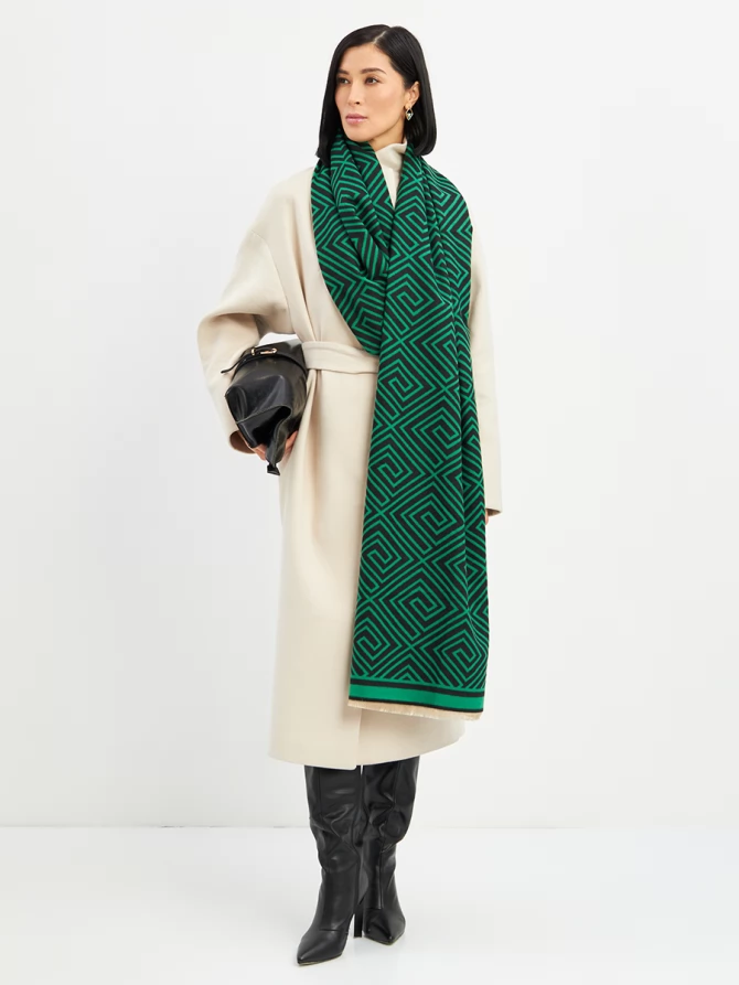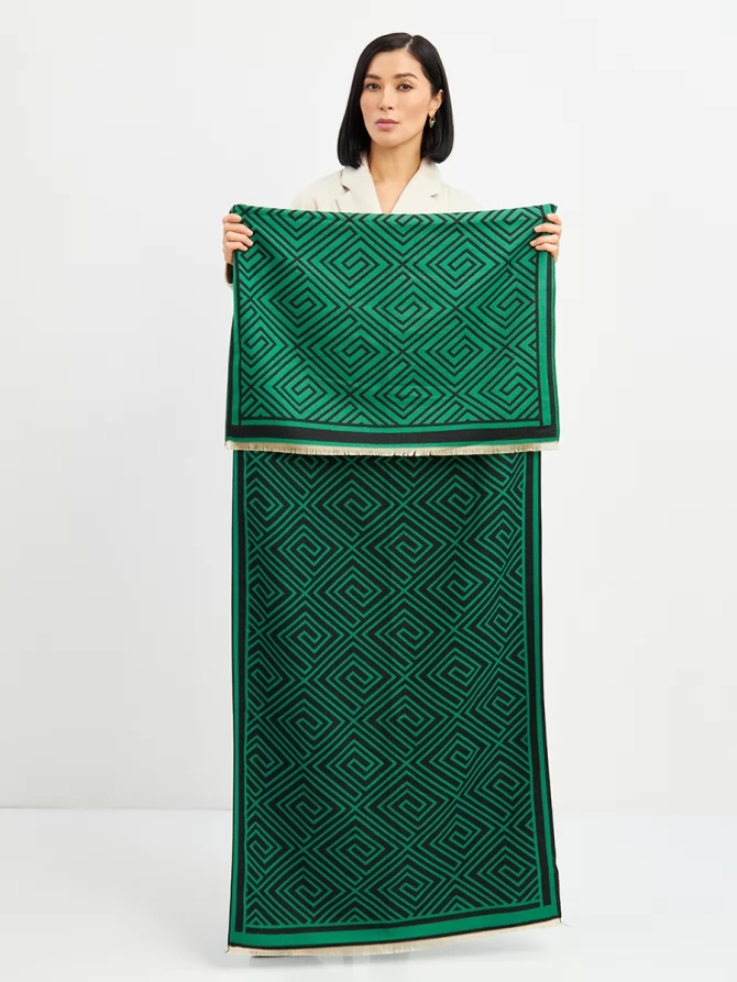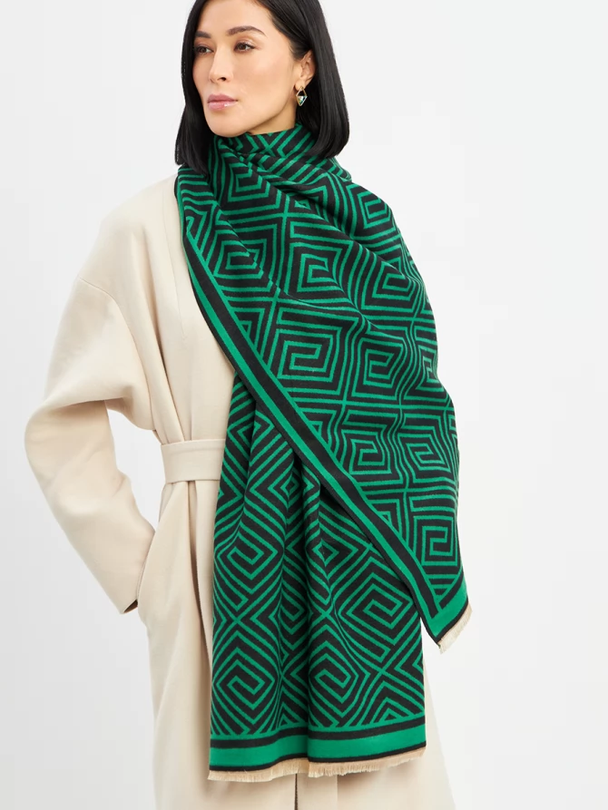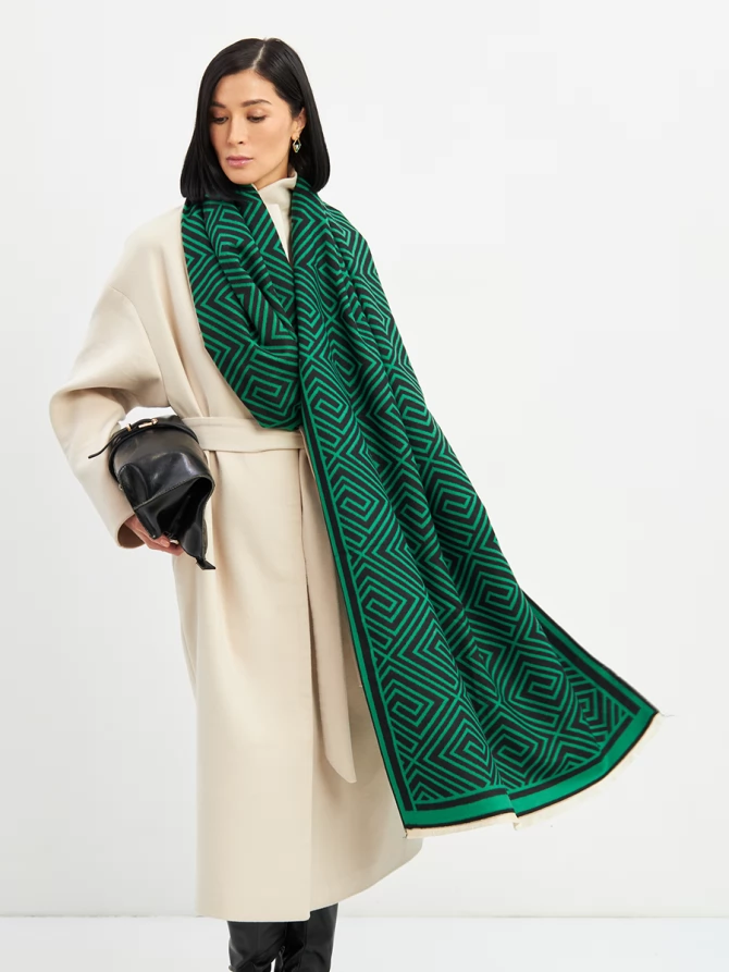 Наш большой и невероятно мягкий палантин с трендовым геометрическим принтом в глубоких оттенках зеленого и черного мгновенно добавит шика и выразительности вашему ансамблю. Его двусторонний дизайн предлагает еще больше возможностей для стилизации: создавайте новые комбинации, меняя стороны, и каждый раз выглядите по-новому. Укутайтесь в него, чтобы почувствовать нежное тепло в прохладный день, или элегантно накиньте на плечи, завершая вечерний образ. Его объем и роскошный крой обеспечивают идеальную посадку и эффектную драпировку.