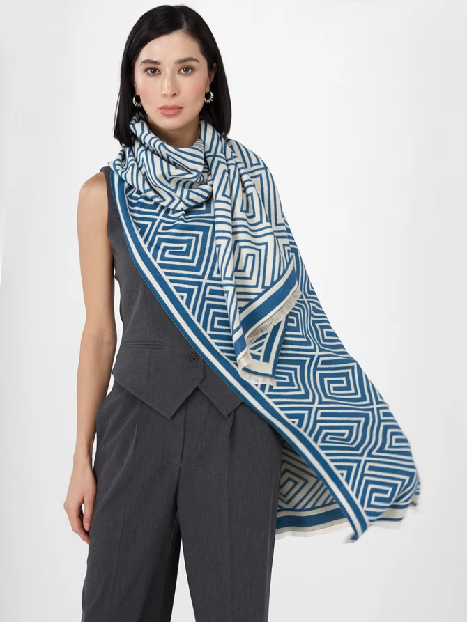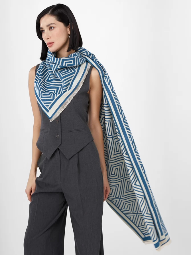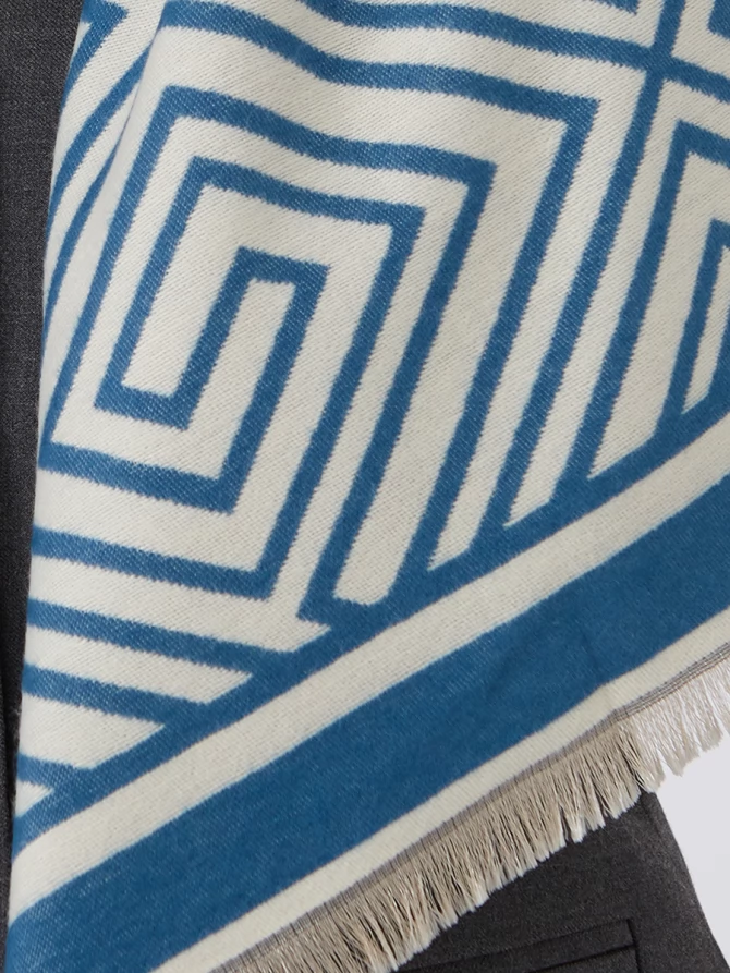 Этот большой, невероятно мягкий и теплый палантин выполнен с особым вниманием к деталям. Его эффектный двусторонний дизайн с выразительным геометрическим принтом в глубоком синем и молочном оттенках – это настоящее воплощение современных трендов. Узор из изящных лабиринтов и квадратов придает аксессуару особую динамику и шик, делая его центральным акцентом вашего образа.