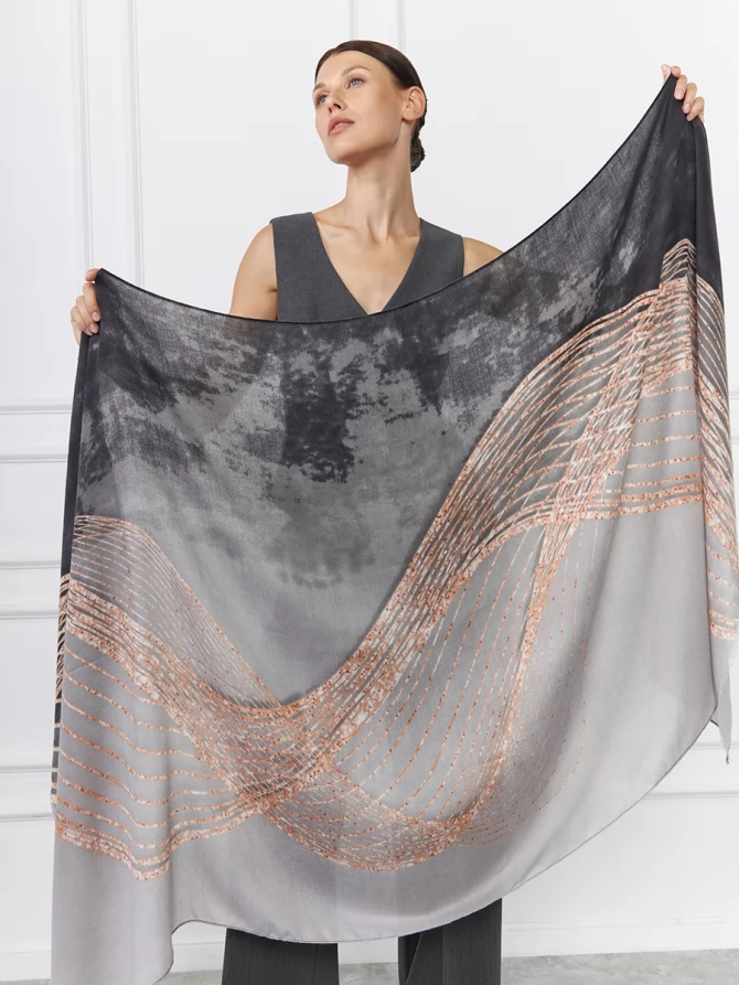 Наш палантин — воплощение роскошной мягкости и невесомой тонкости. Он невероятно приятен к коже, дарит ощущение уюта и тепла. Благодаря двустороннему дизайну, вы получаете два стильных решения в одном: элегантный серый фон с динамичными линиями медного оттенка, переходящий в глубокий черный. Этот уникальный абстрактный узор идеально соответствует актуальным мировым трендам и позволяет легко менять настроение вашего наряда.