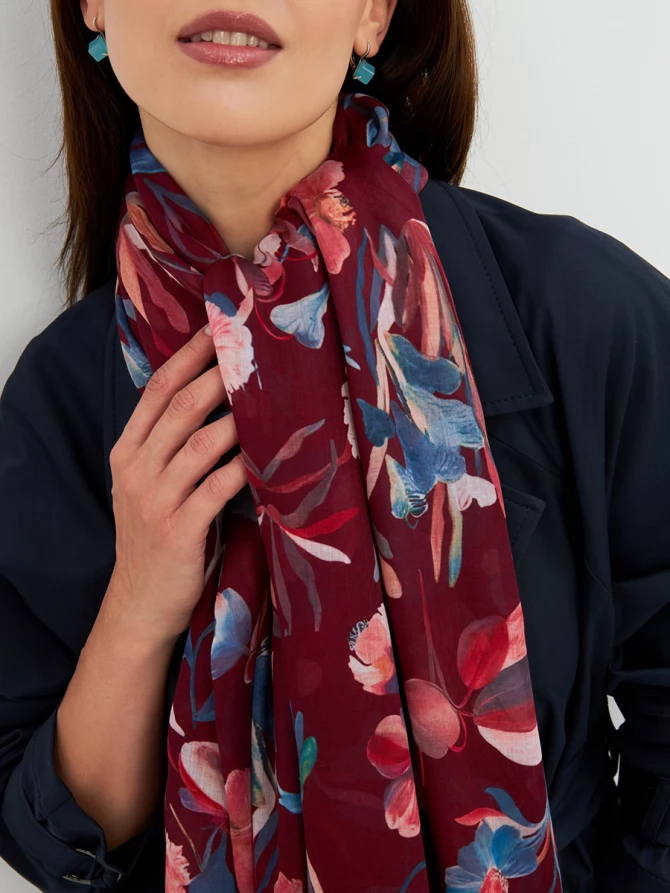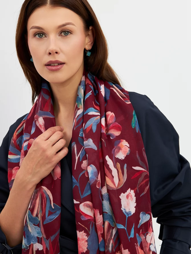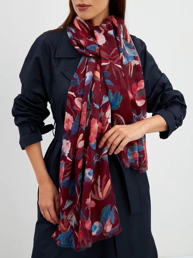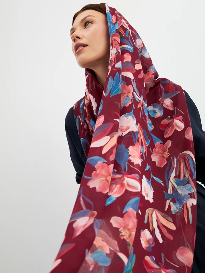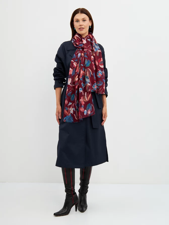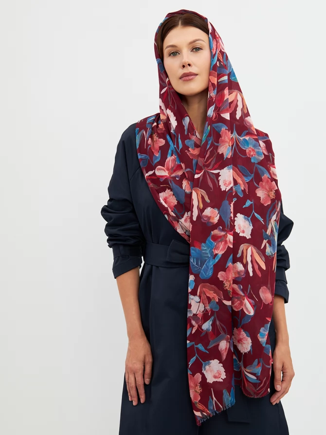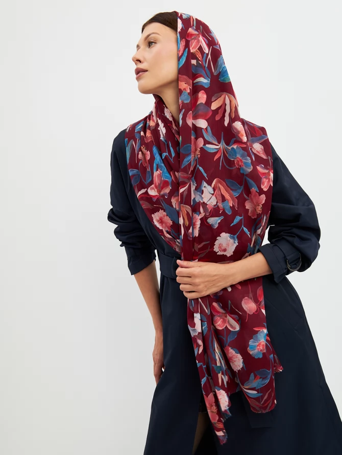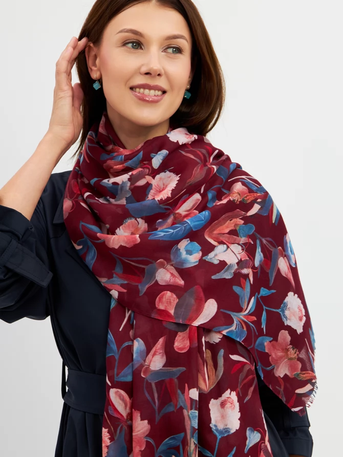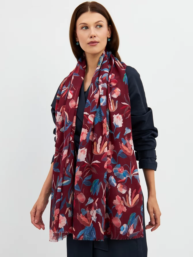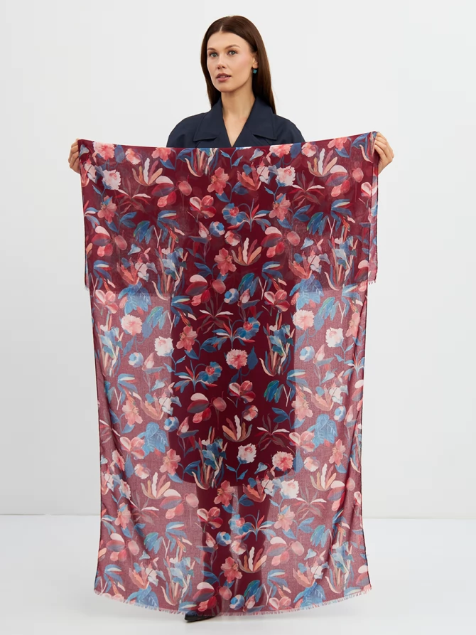 Его уникальный флоральный принт, выполненный в трендовых оттенках бордо, синего и персикового, мгновенно преображает любой образ, добавляя ему свежести и романтичности. Каждый цветок словно нарисован вручную, создавая ощущение художественного произведения. Палантин окутывает легким облаком, даря ощущение уюта и тепла.