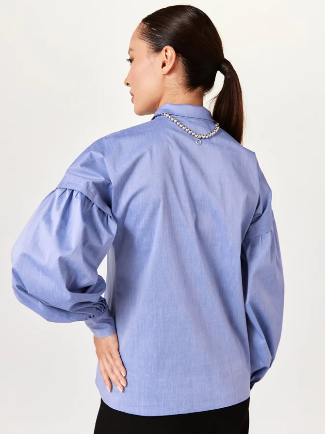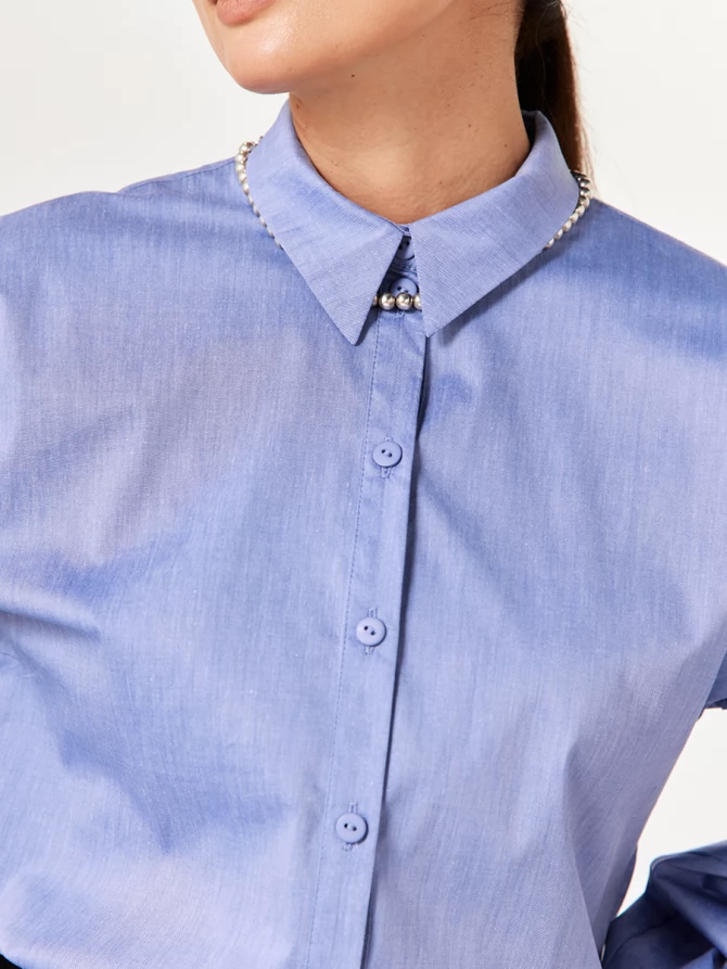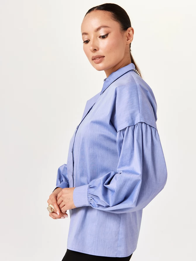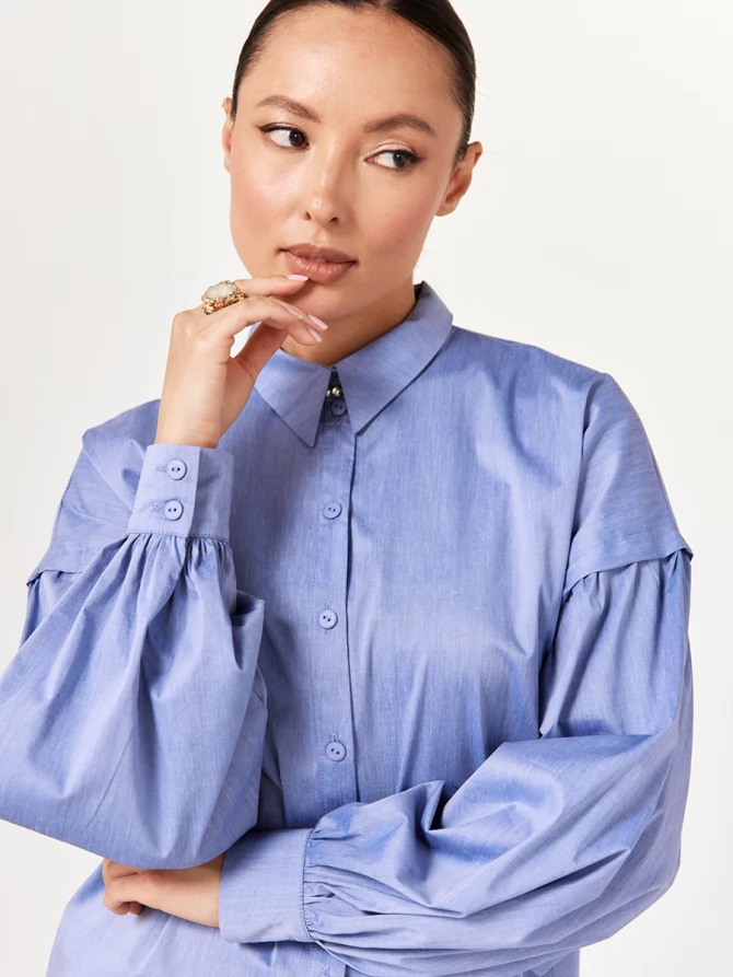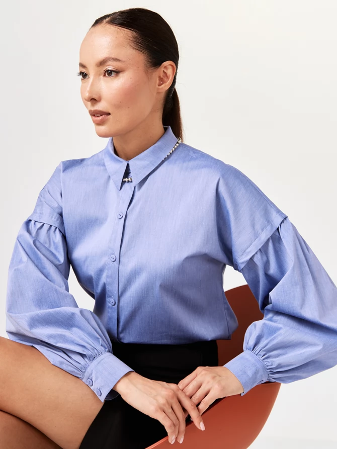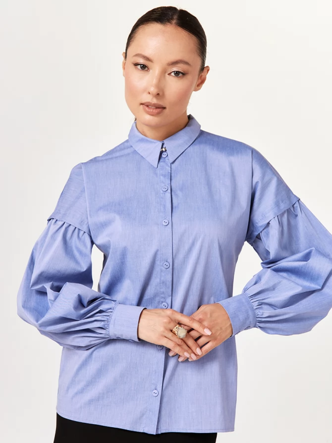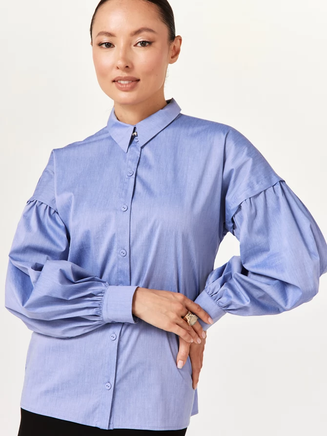 Рубашка женская из однотонного хлопка. Прямой силуэт. Спущенная линия плеча. Рубашечный воротник на стойкес планкой. Рукав со сборкой по окату инизу, на манжете. Застежка на петли и пуговицы. Рост модели 170 см. Изделие на модели 42 р-ра. Длина изделия по спинке 65 см. Деликатная стирка при 30 градусах.
