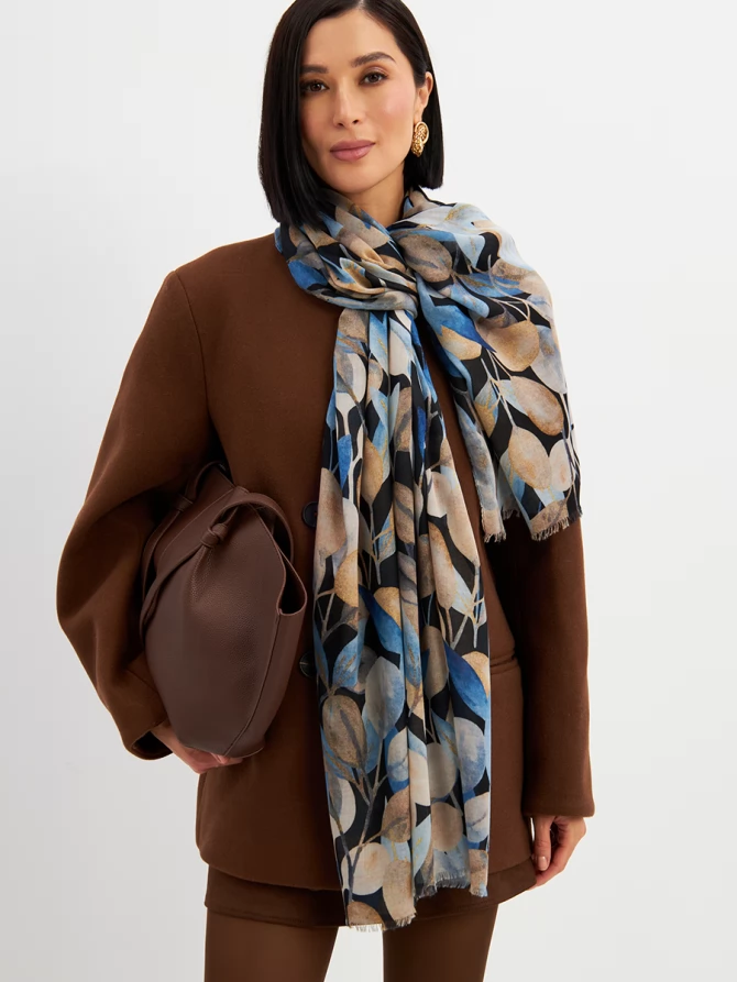 Принт со стилизованными листьями в гармоничных синих, лазурных и бежевых оттенках на темном фоне – воплощение мировых модных тенденций. Каждый элемент рисунка продуман до мелочей. Бахрома ручной работы подчеркивает эксклюзивность и внимание TANTINO к деталям.