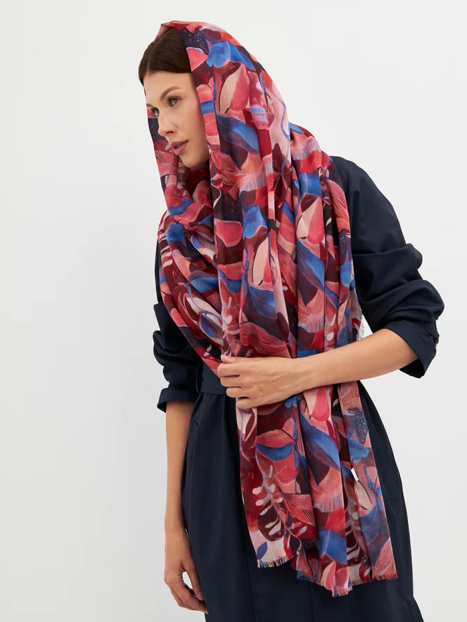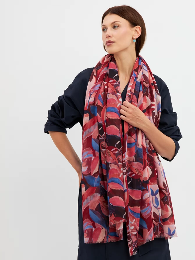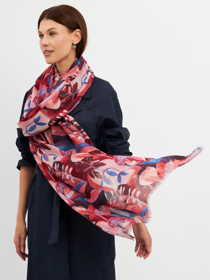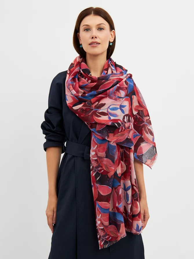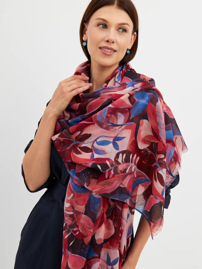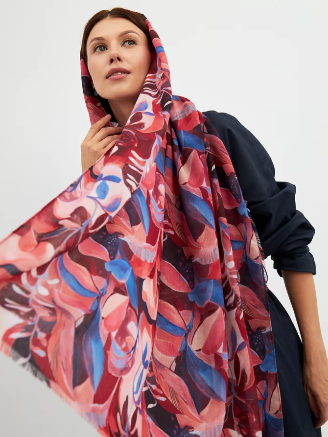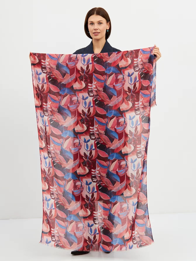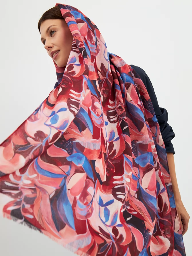 Этот палантин — настоящее произведение искусства: большой, невероятно мягкий и тонкий, он ощущается как нежное прикосновение. Его авторский рисунок, вдохновленный актуальными мировыми трендами, выполнен в сочных оттенках красного, кораллового и глубокого синего. Он мгновенно преобразит любой образ, добавив ему индивидуальности и шарма.