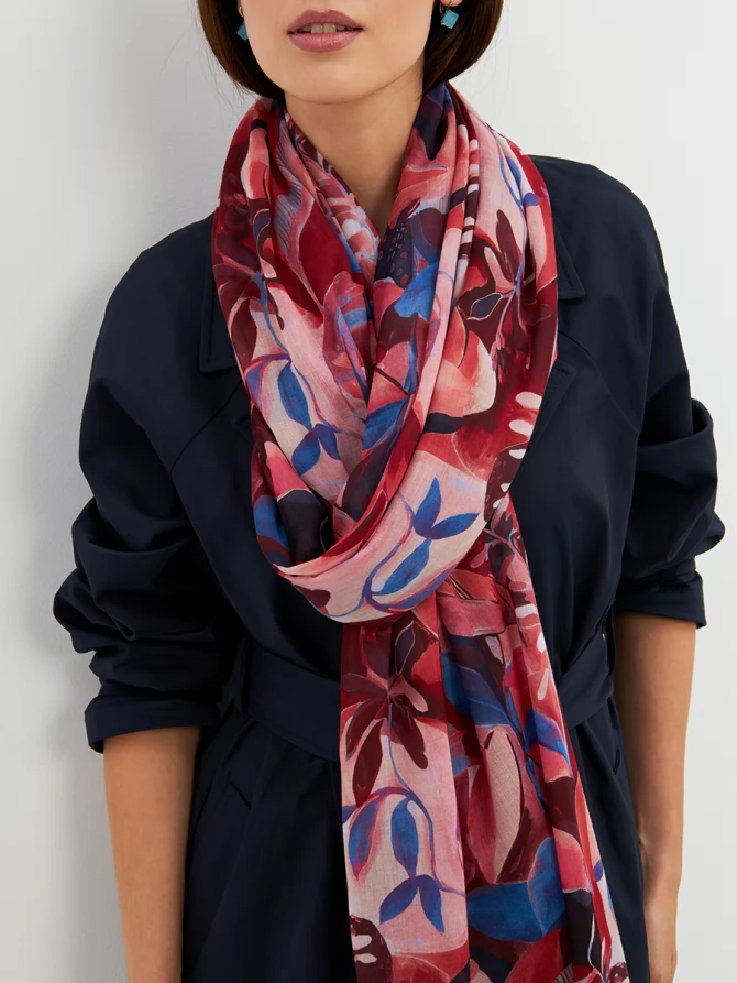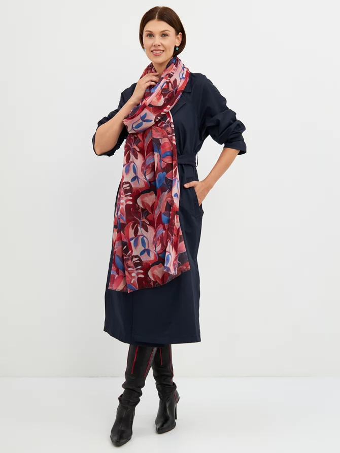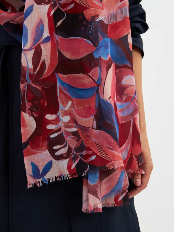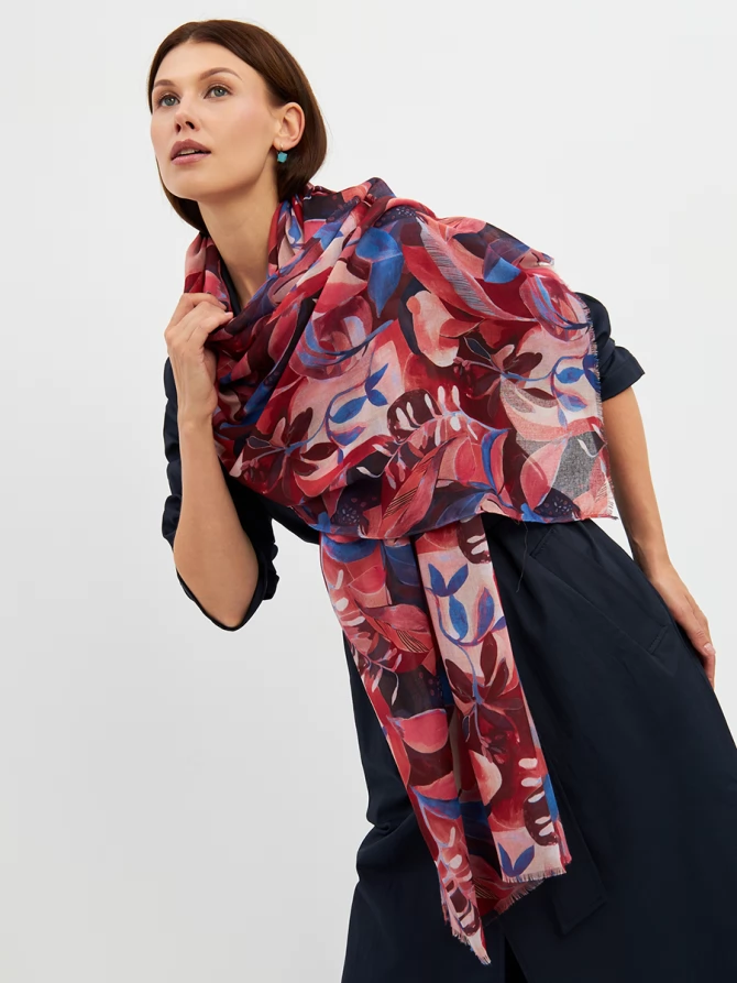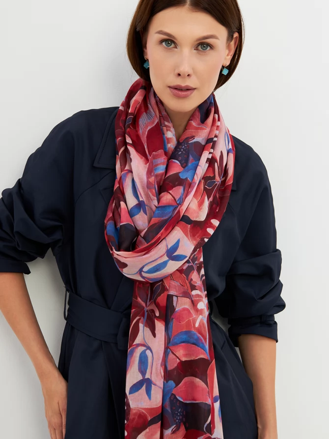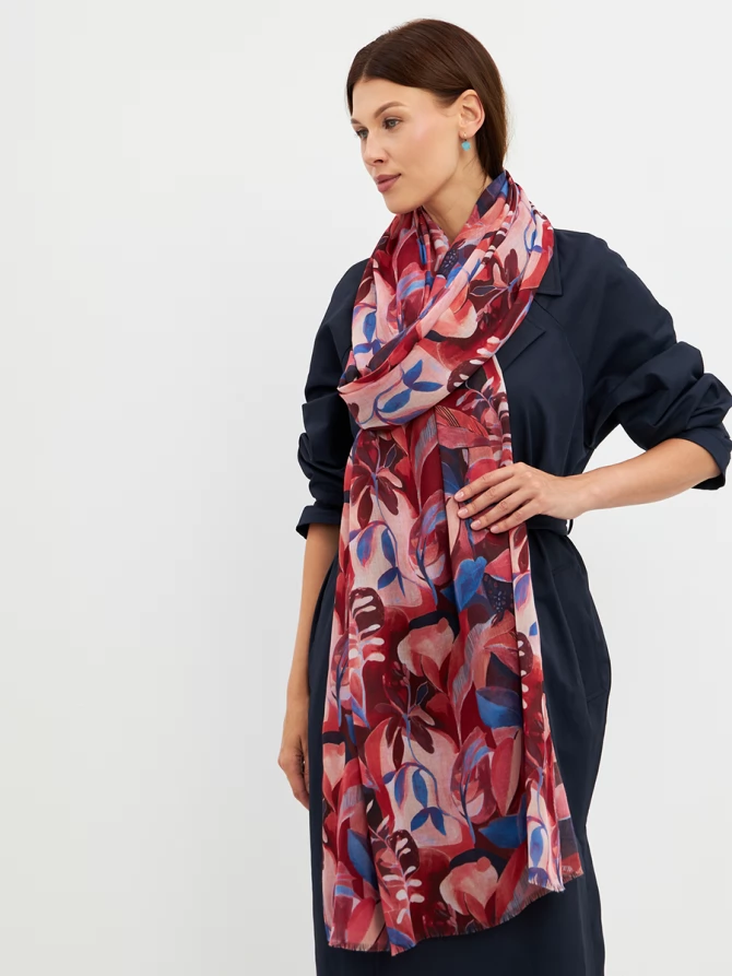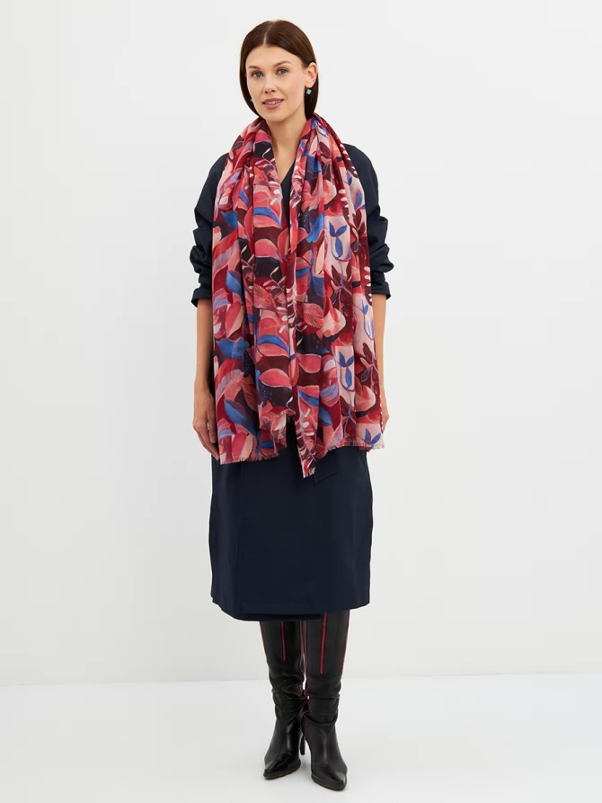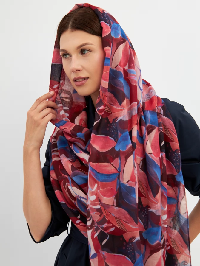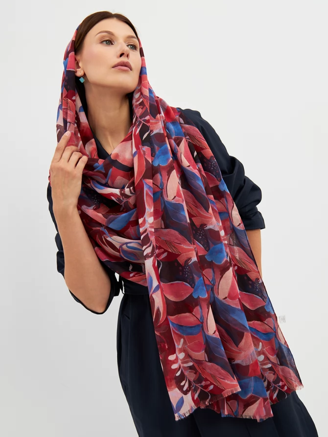 Этот палантин — настоящее произведение искусства: большой, невероятно мягкий и тонкий, он ощущается как нежное прикосновение. Его авторский рисунок, вдохновленный актуальными мировыми трендами, выполнен в сочных оттенках красного, кораллового и глубокого синего. Он мгновенно преобразит любой образ, добавив ему индивидуальности и шарма.