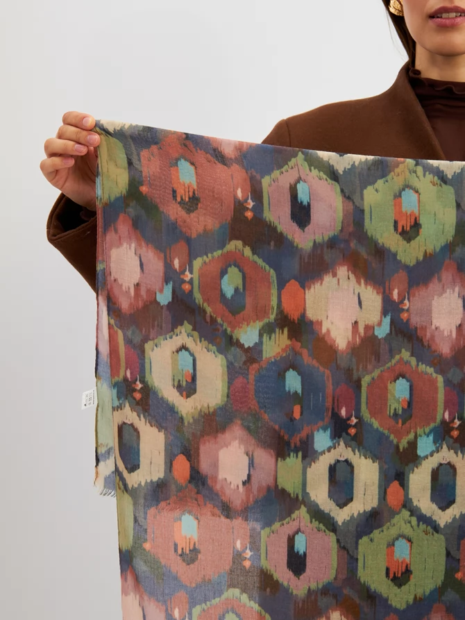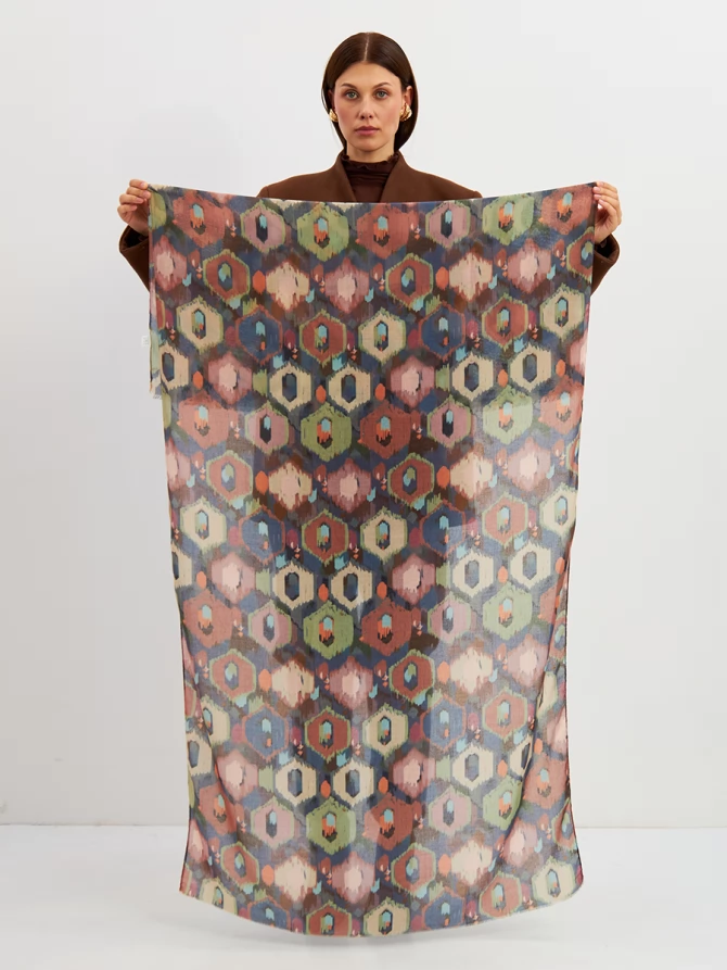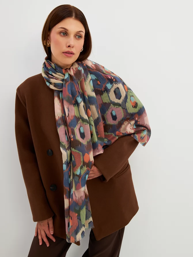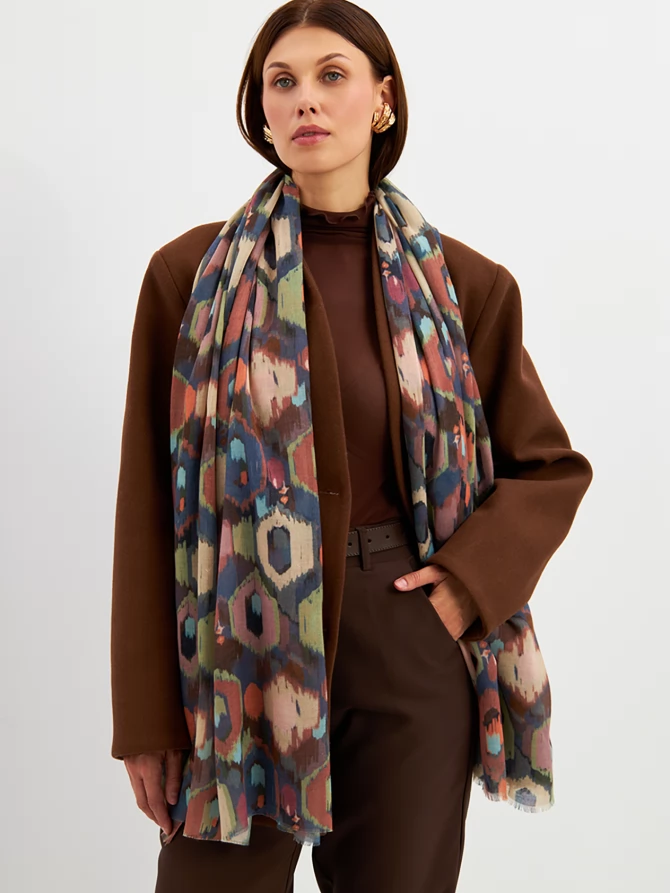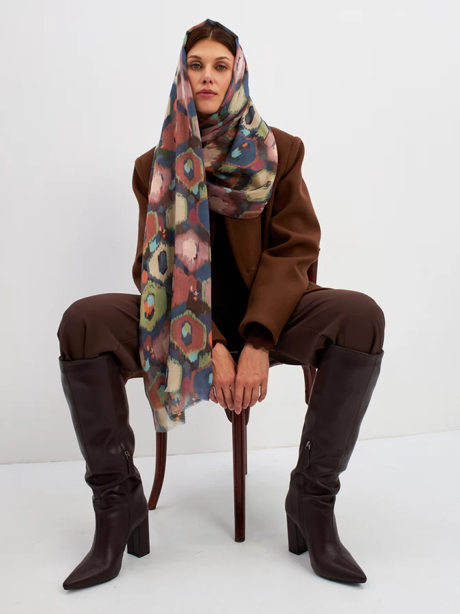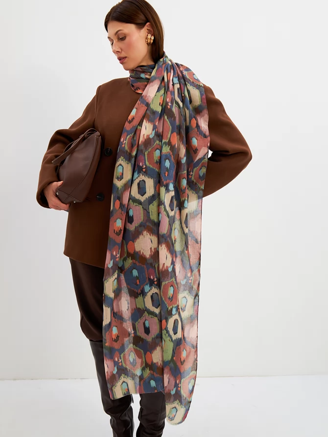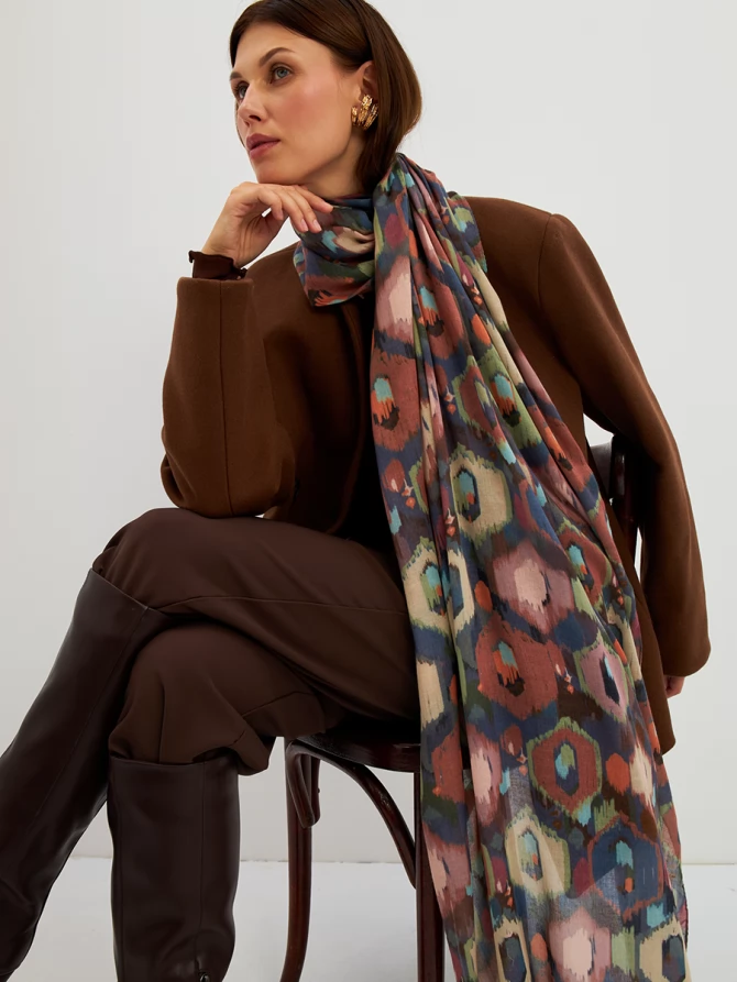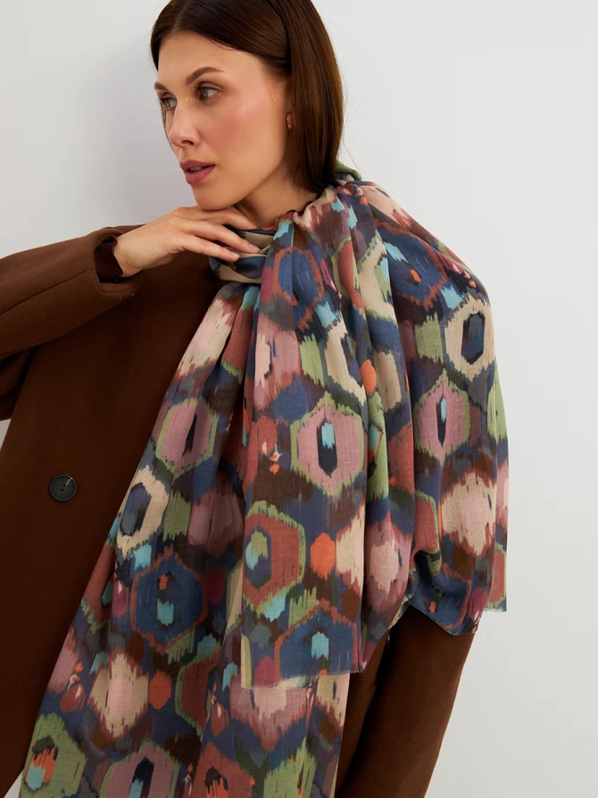 Взгляните на его уникальный авторский принт, вдохновленный актуальными мировыми трендами! Смелые, но гармоничные цветовые сочетания и динамичный геометрический узор создают эффектный акцент, который легко впишется как в деловой, так и в повседневный гардероб. Каждый край палантина украшен бахромой ручной работы – это та самая деталь, которая говорит о внимании к качеству и подлинном мастерстве.