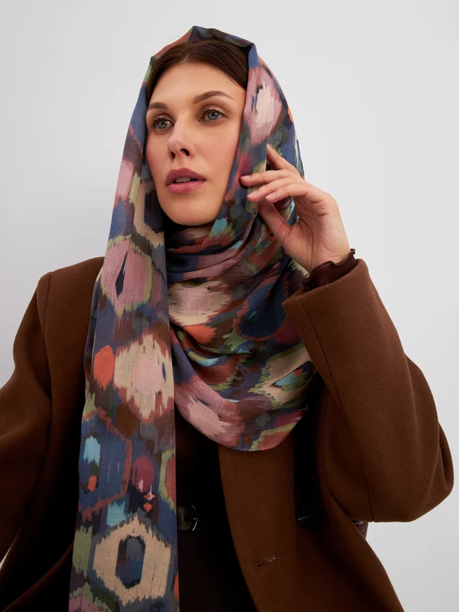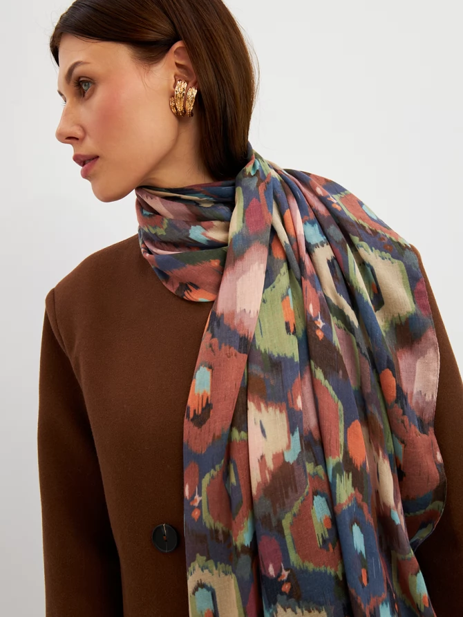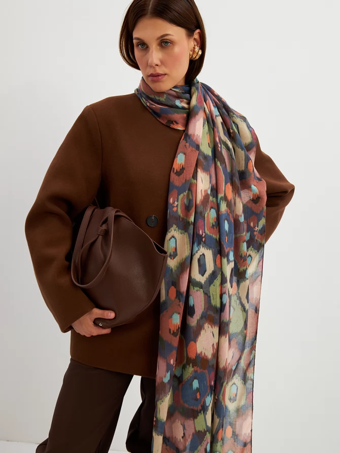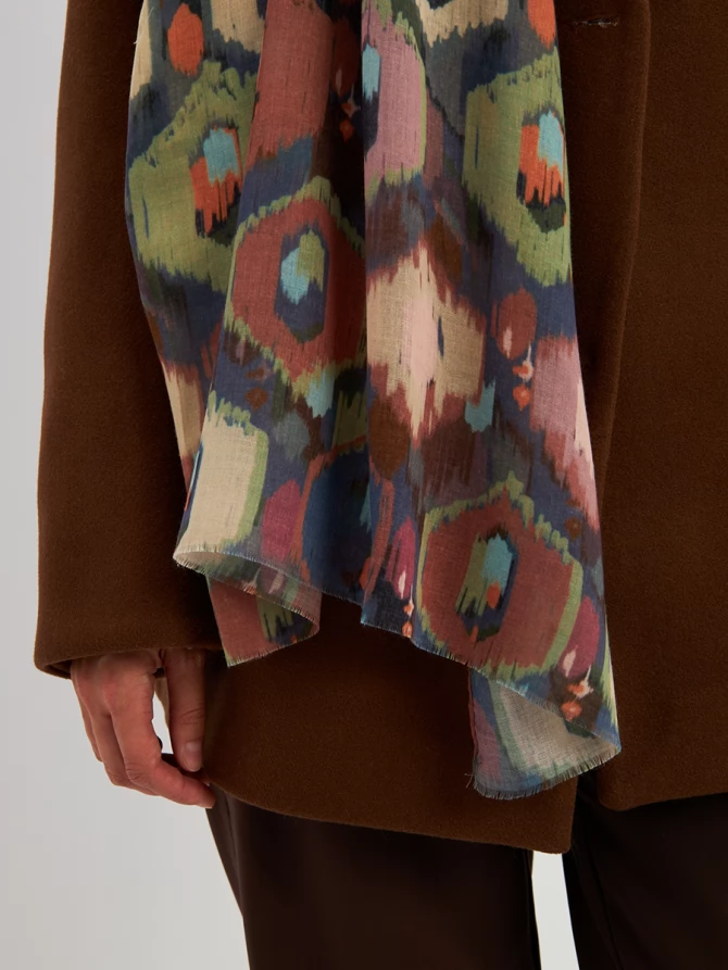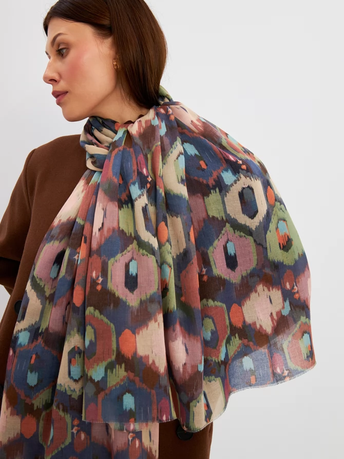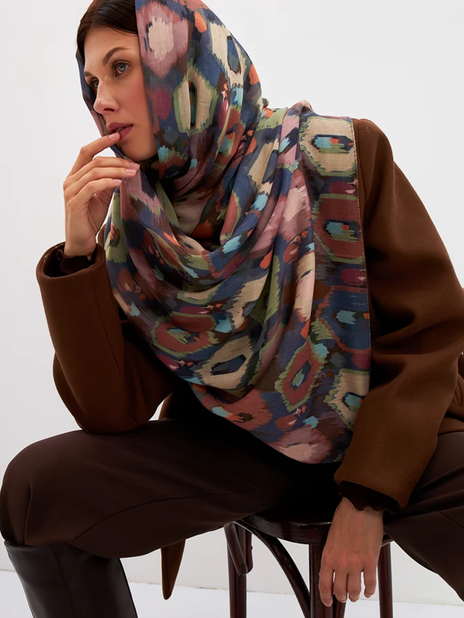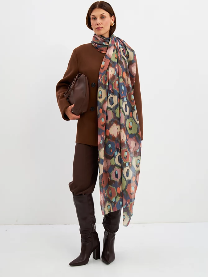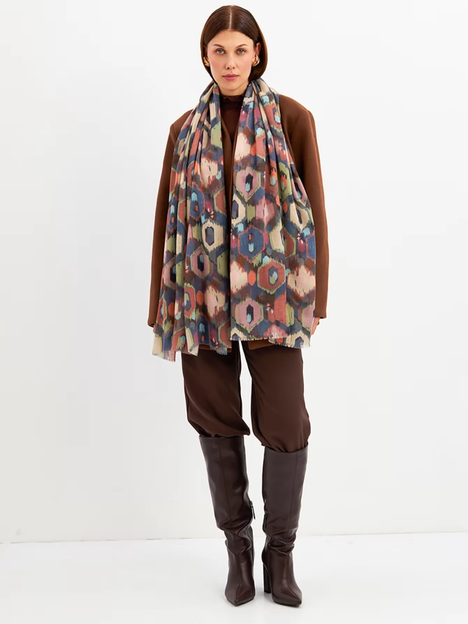Взгляните на его уникальный авторский принт, вдохновленный актуальными мировыми трендами! Смелые, но гармоничные цветовые сочетания и динамичный геометрический узор создают эффектный акцент, который легко впишется как в деловой, так и в повседневный гардероб. Каждый край палантина украшен бахромой ручной работы – это та самая деталь, которая говорит о внимании к качеству и подлинном мастерстве.