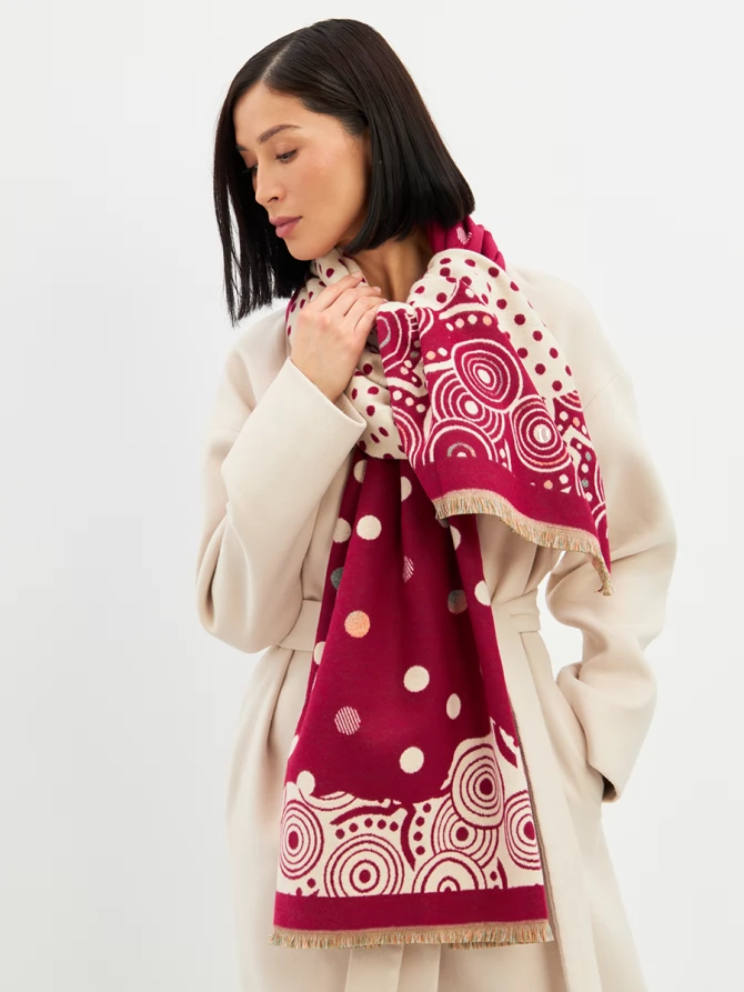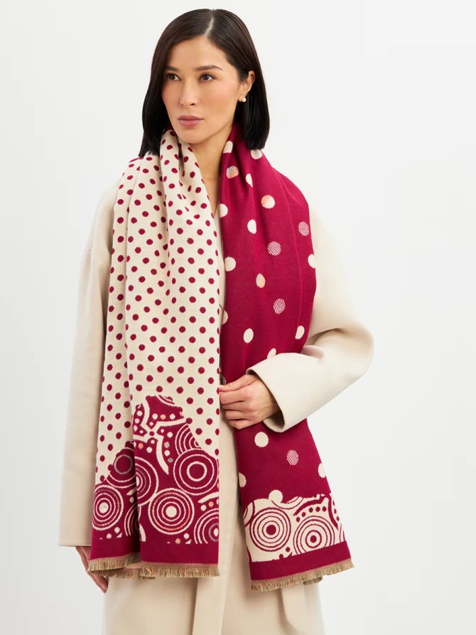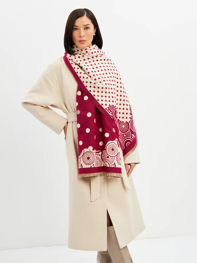 Этот палантин – настоящее произведение искусства. Одна сторона украшена игривым принтом в мелкий горошек на нежном кремовом фоне, создавая легкий и романтичный образ. Стоит лишь перевернуть его, и вы обнаружите совершенно иное настроение: глубокий бордовый цвет, усыпанный крупным горошком и дополненный стильным геометрическим узором по краям. Такой продуманный дизайн позволяет легко менять акценты в вашем образе, делая его уникальным каждый день.