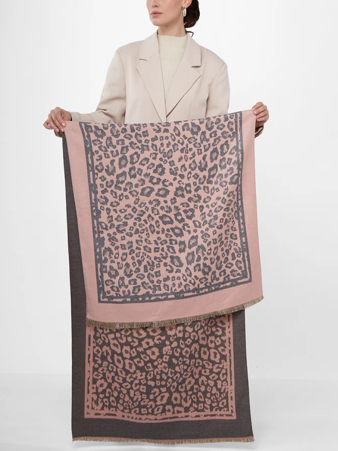 Мы создали этот палантин, чтобы вы могли наслаждаться каждым моментом, чувствуя себя уютно и невероятно стильно. Большой, мягкий и невероятно теплый, он станет вашим незаменимым спутником в прохладную погоду. Его уникальность в том, что он двусторонний: с одной стороны — нежный розовый фон с изысканным серым леопардовым принтом, а с другой — контрастное сочетание, позволяющее легко менять настроение вашего образа.