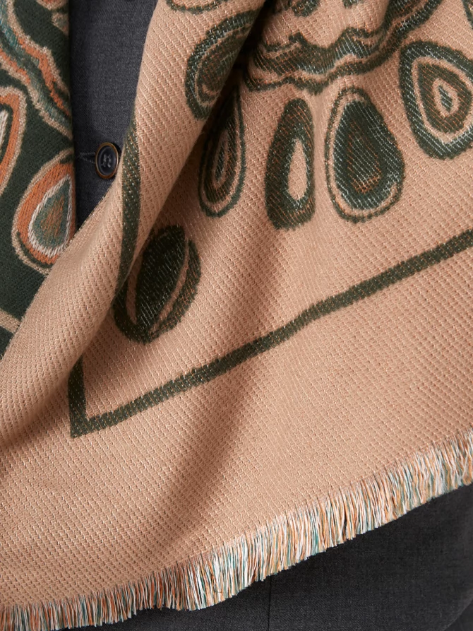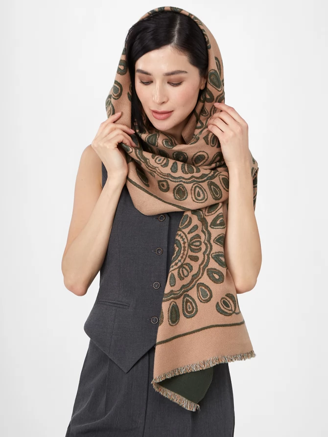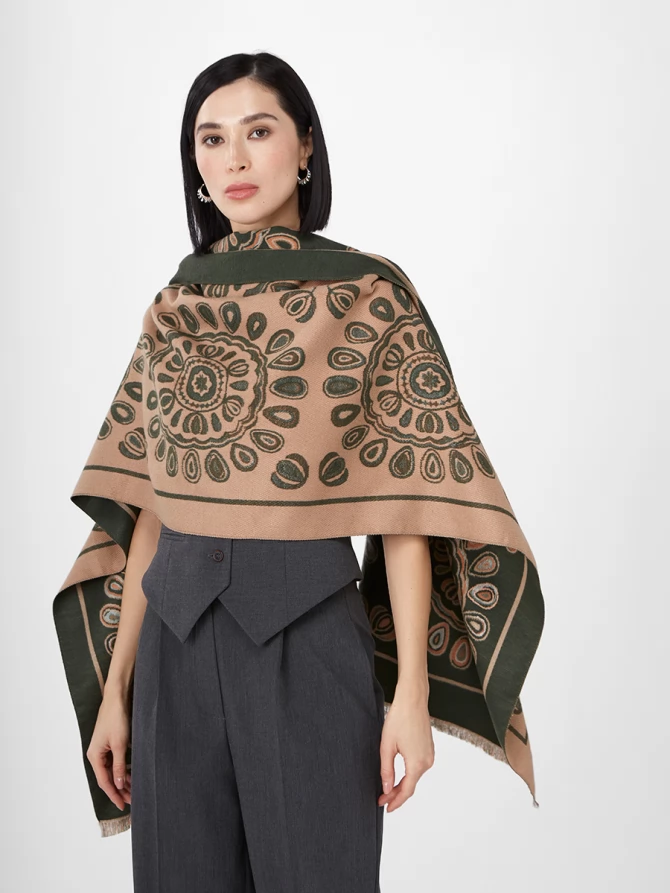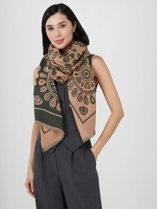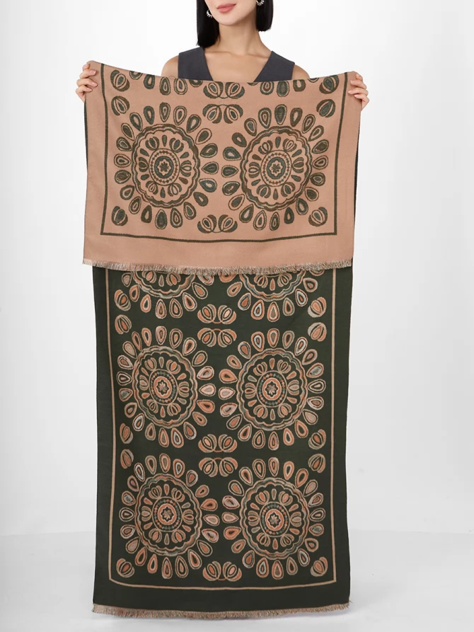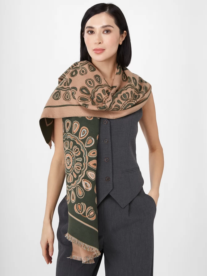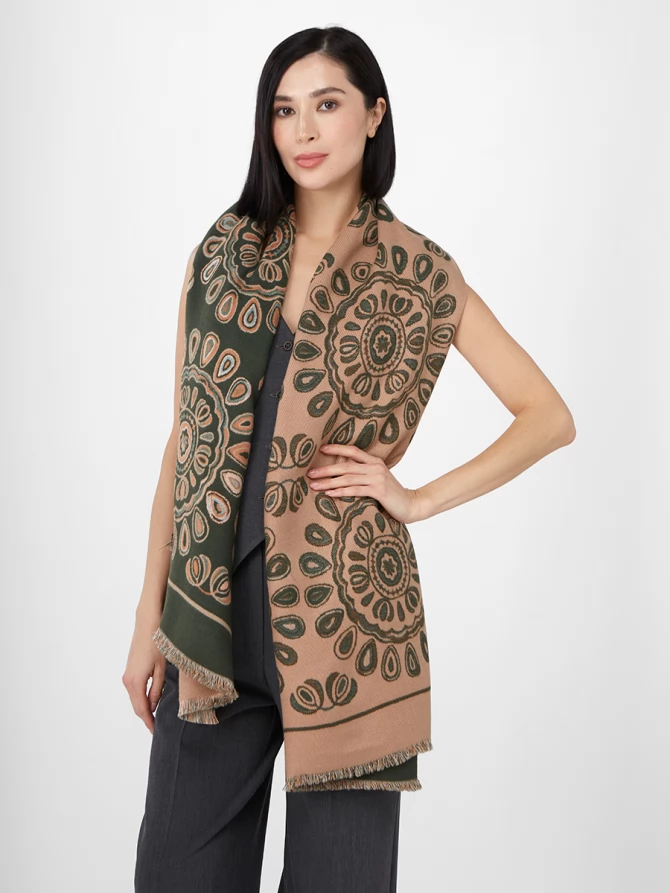 Наш большой, мягкий и невероятно теплый палантин — идеальный спутник для прохладных вечеров и стильных выходов. Особенность этой модели – двусторонний дизайн с актуальным восточным орнаментом, выполненным в гармоничных оттенках бежевого и глубокого оливкового. Вы можете менять стороны, создавая каждый раз новый акцент в вашем гардеробе.
