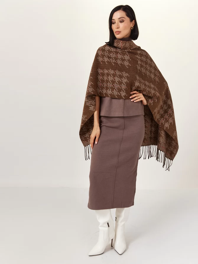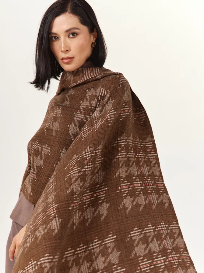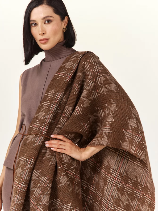 Особенность этой модели – ее двусторонний дизайн, позволяющий каждый день экспериментировать с образами. Накиньте его на плечи, создайте объемный шарф или используйте как стильное пончо – варианты безграничны. Мы с гордостью используем натуральные материалы, обеспечивающие идеальную посадку и приятные тактильные ощущения.