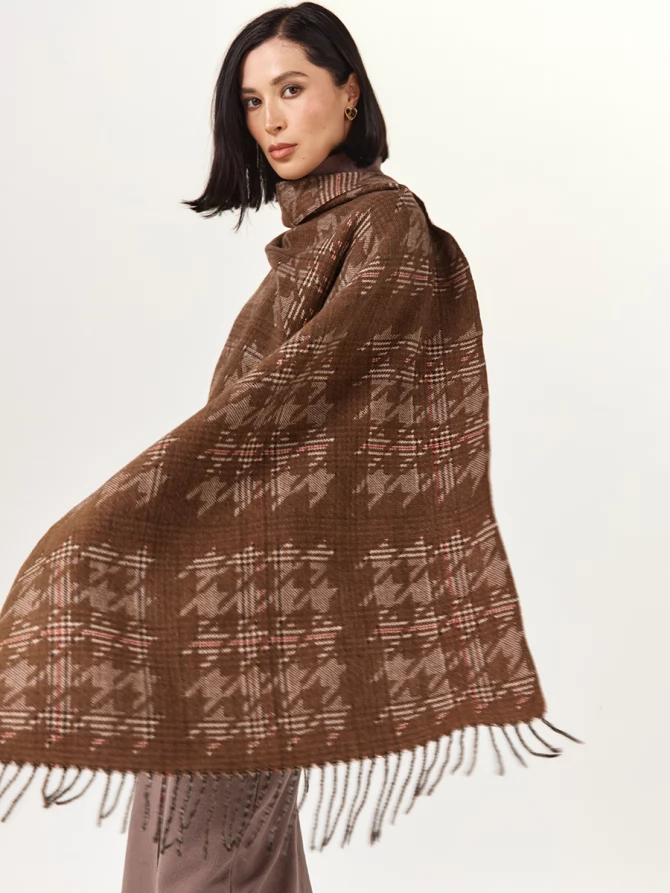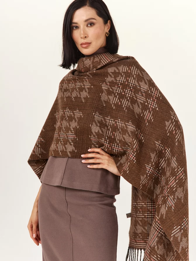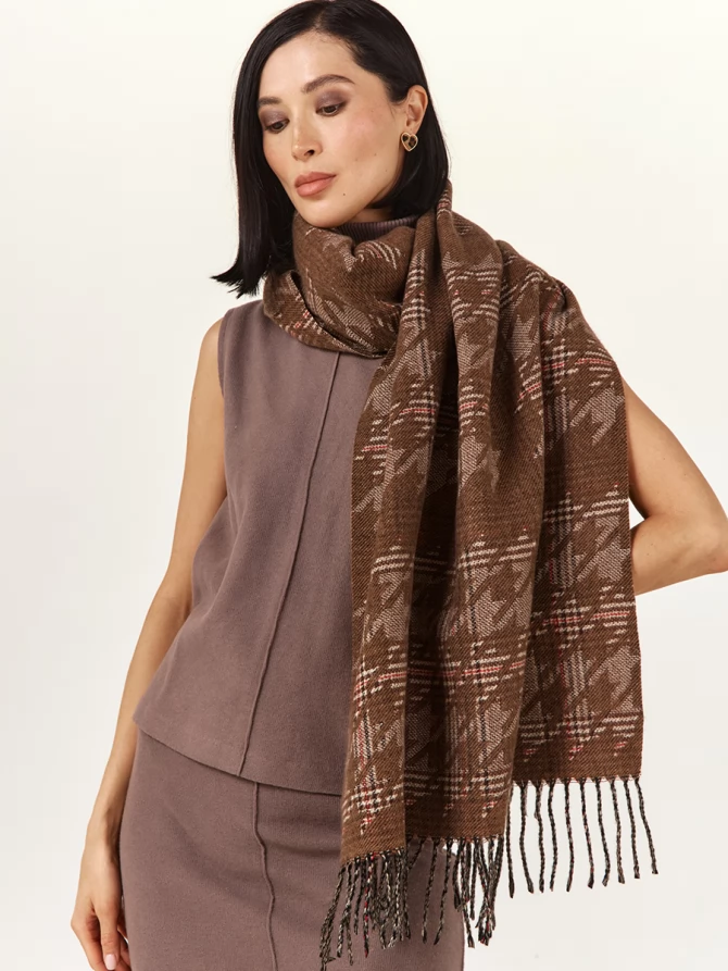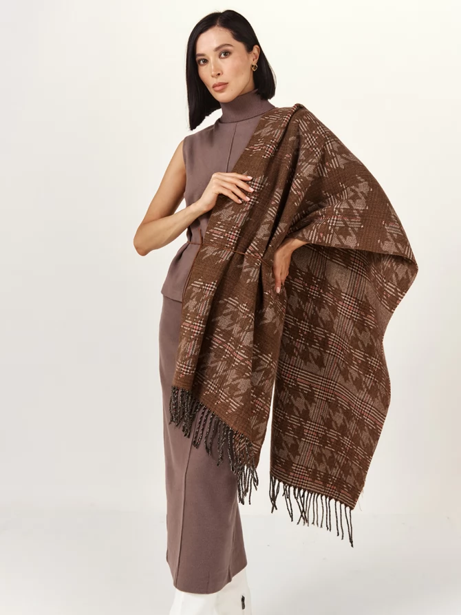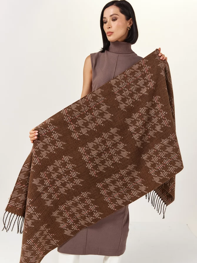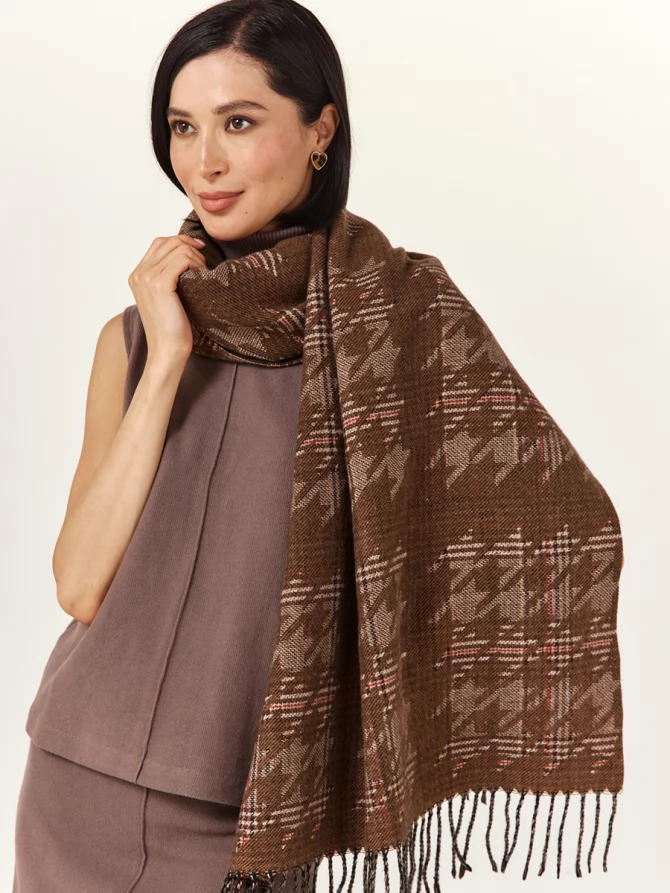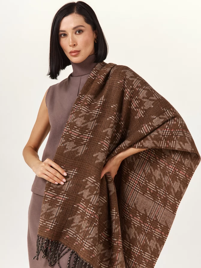 Представляем вашему вниманию большой, невероятно мягкий и теплый палантин. Его благородный коричневый оттенок, дополненный изысканным узором в шотландскую клетку с тонкими акцентами бежевого и красного, добавит вашему образу неповторимый шарм. Будьте уверены, что вы будете выглядеть стильно и чувствовать себя комфортно.