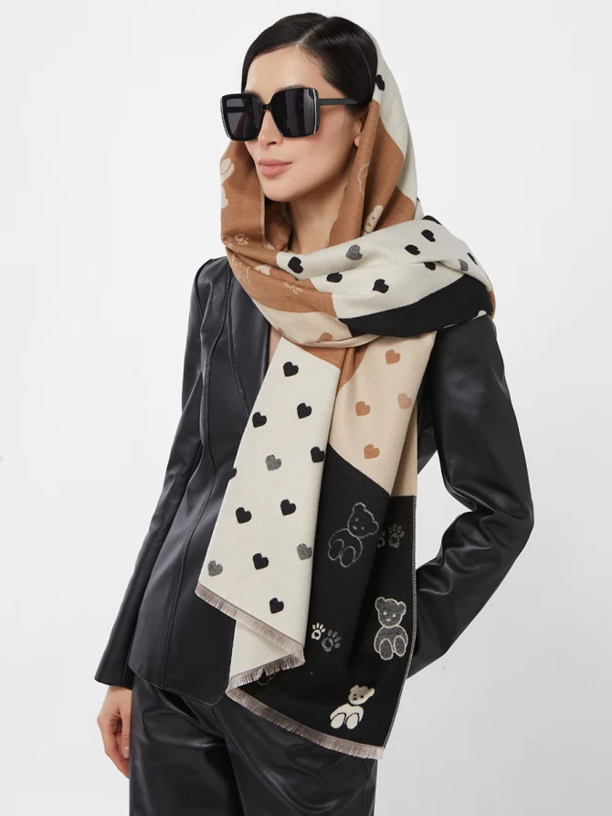 На его двустороннем полотне расцветает очаровательный узор из милых мишек и нежных сердечек, расположенных в стильных цветовых блоках. От теплого карамельного и нежного кремового до глубокого черного — каждый оттенок гармонично дополняет друг друга, создавая уникальный и запоминающийся принт. Это не просто палантин, это целая история, которая будет сопровождать вас каждый день.