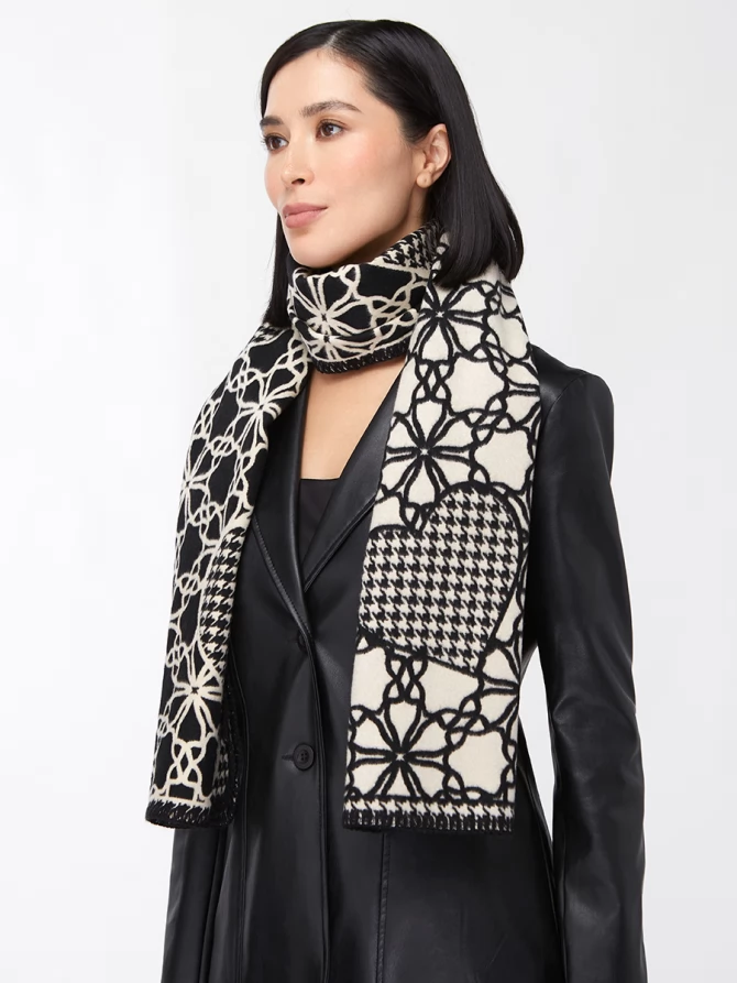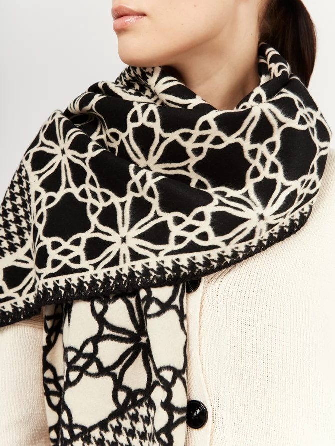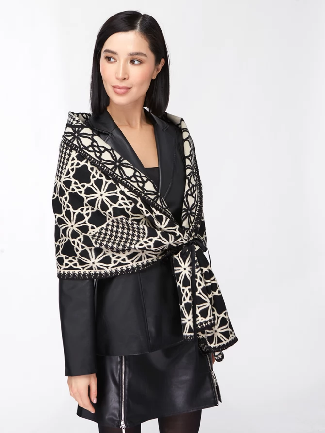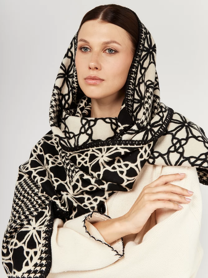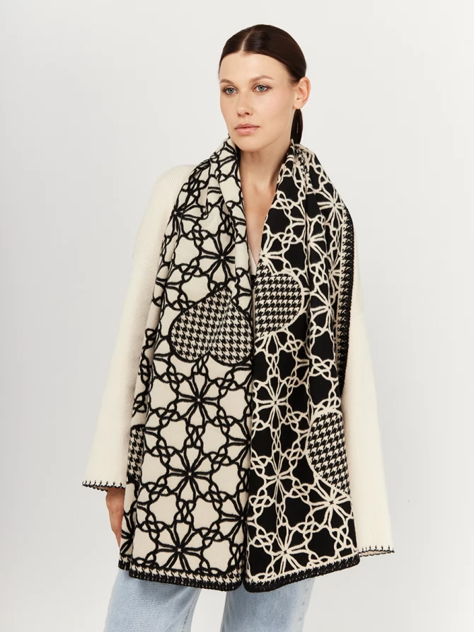 Представляем вашему вниманию по-настоящему роскошный и функциональный аксессуар. Этот большой, мягкий и невероятно теплый палантин выполнен с учетом последних мировых тенденций, сочетая в себе элегантность и комфорт. Его уникальность в двустороннем дизайне: одна сторона украшена сложным графическим орнаментом, напоминающим переплетения кельтских узоров, в классическом черно-белом исполнении. Другая сторона демонстрирует игривый и всегда актуальный принт "гусиная лапка", гармонично дополненный тем же геометрическим мотивом.