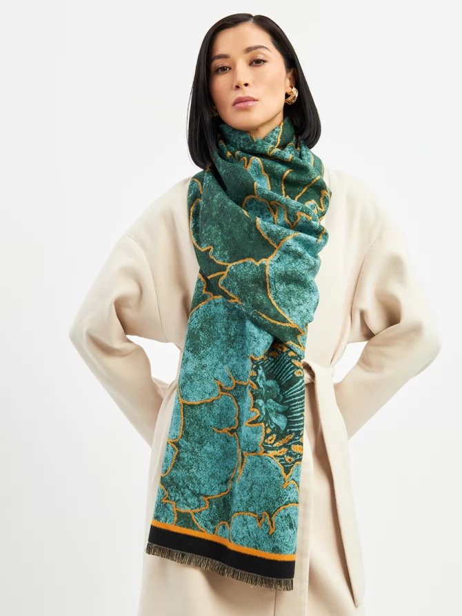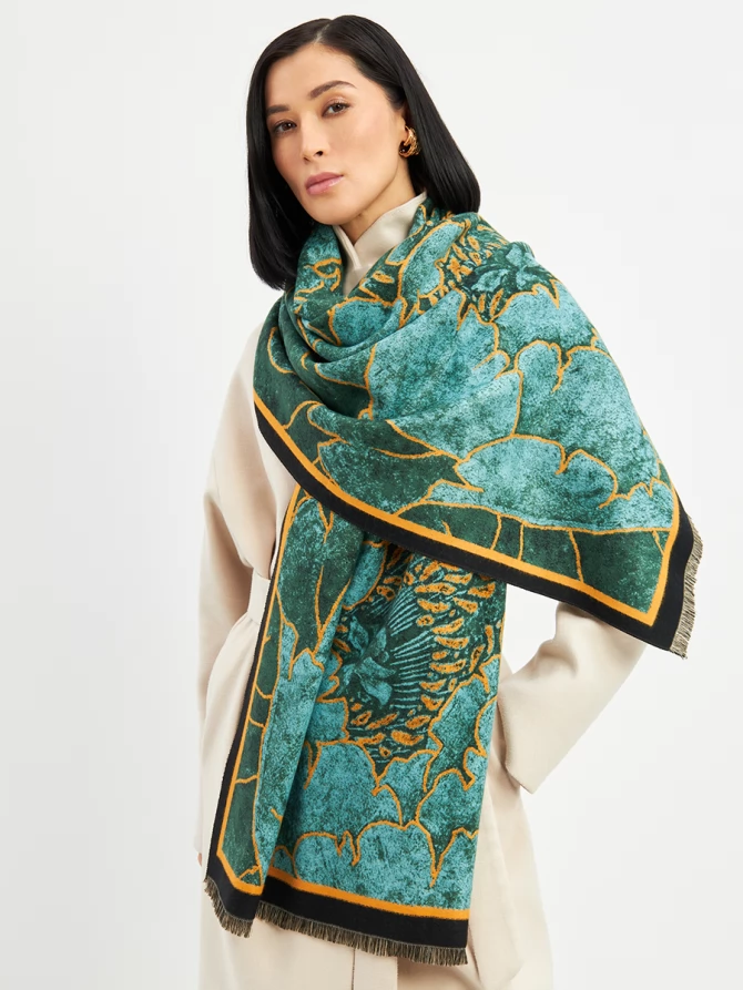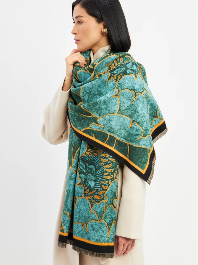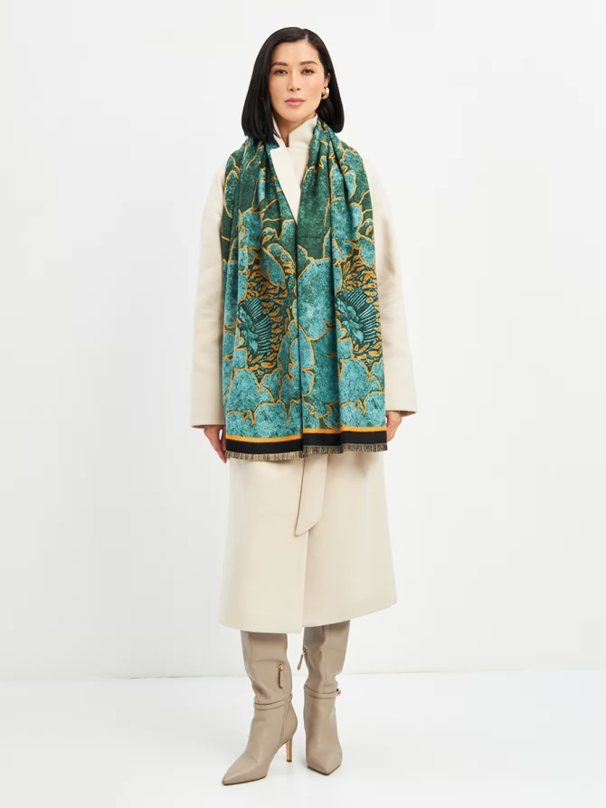 Авторский принт, вдохновленный мировыми трендами, воплощает глубокие оттенки изумрудного и бирюзового с яркими золотисто-оранжевыми акцентами. Это сочетание создает магнетический эффект. Палантин идеально драпируется, добавляя образу утонченности.