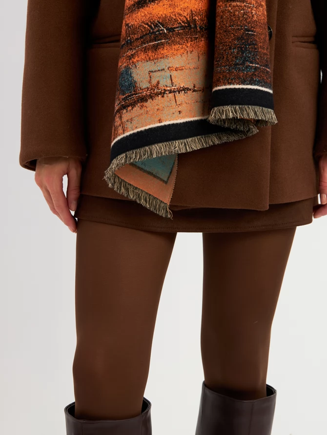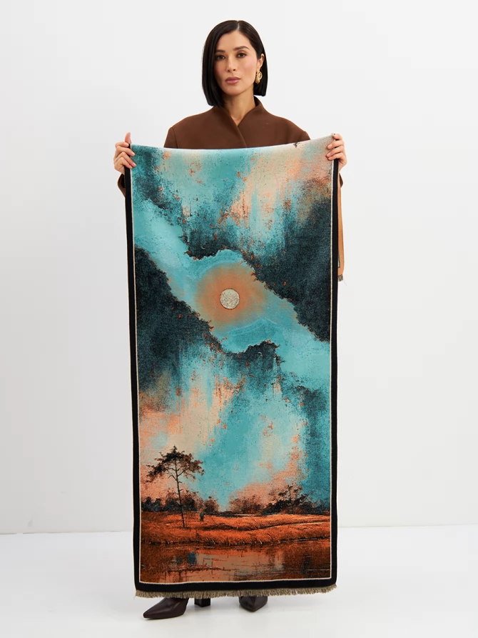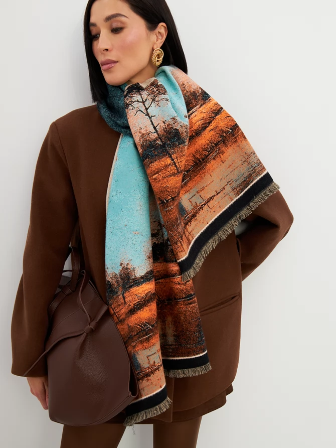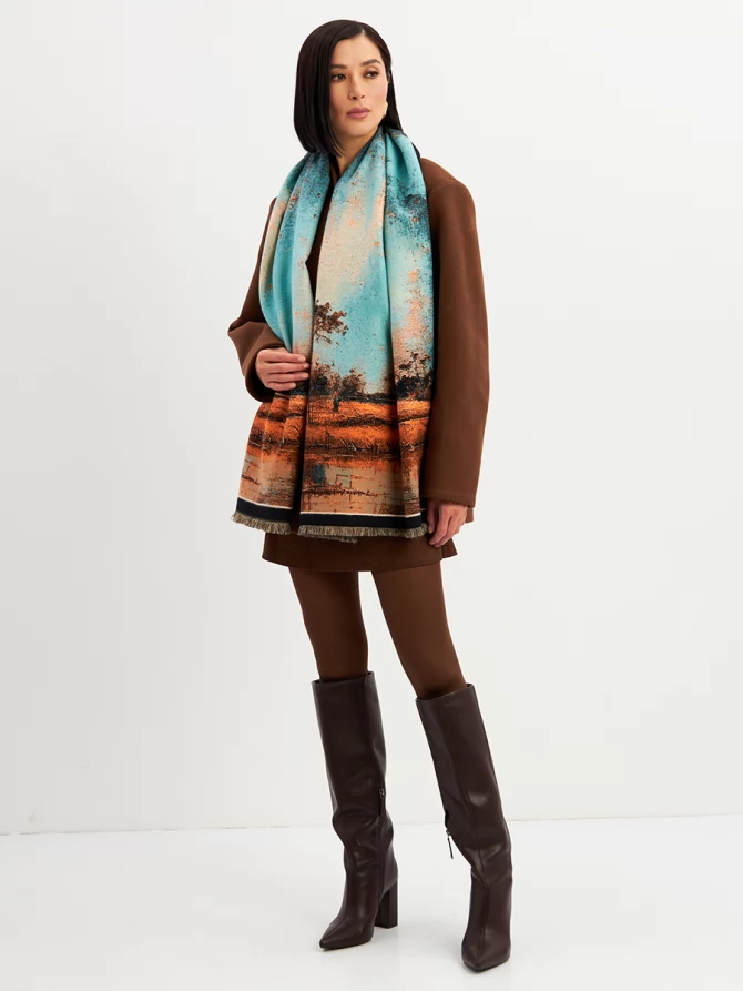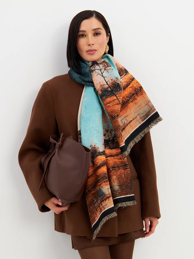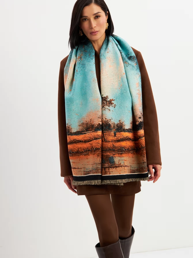 Уникальный дизайн: Палантин украшен завораживающим художественным принтом, напоминающим живописный осенний пейзаж. Теплые терракотовые и оранжевые оттенки гармонично переплетаются с глубокими бирюзовыми и небесно-голубыми тонами, создавая эффектную композицию. Детализированный рисунок с деревьями и линией горизонта придает аксессуару особую глубину и выразительность. Дополнен изящной бахромой по краям, которая придает ему завершенный и богемный вид.
