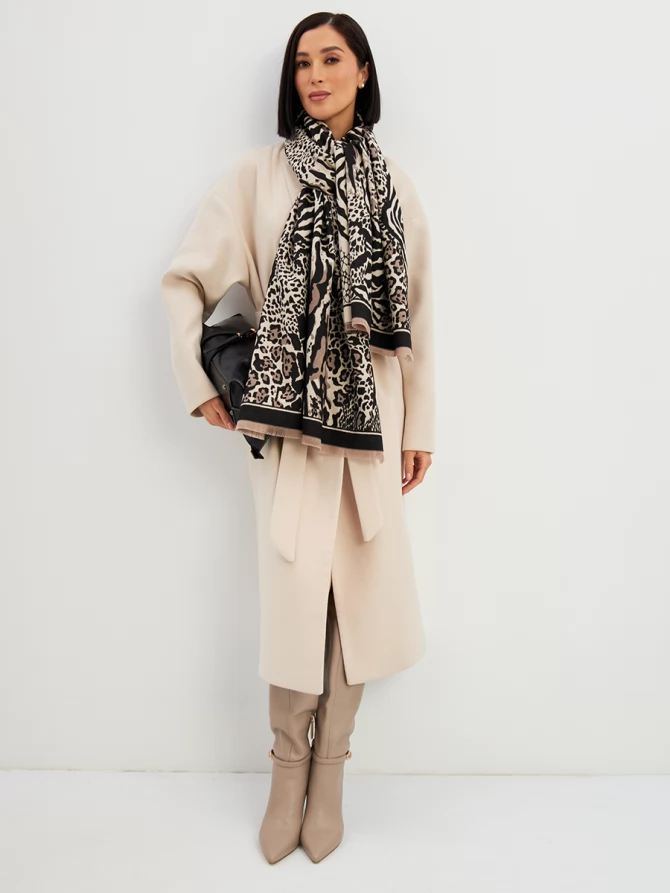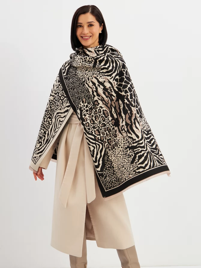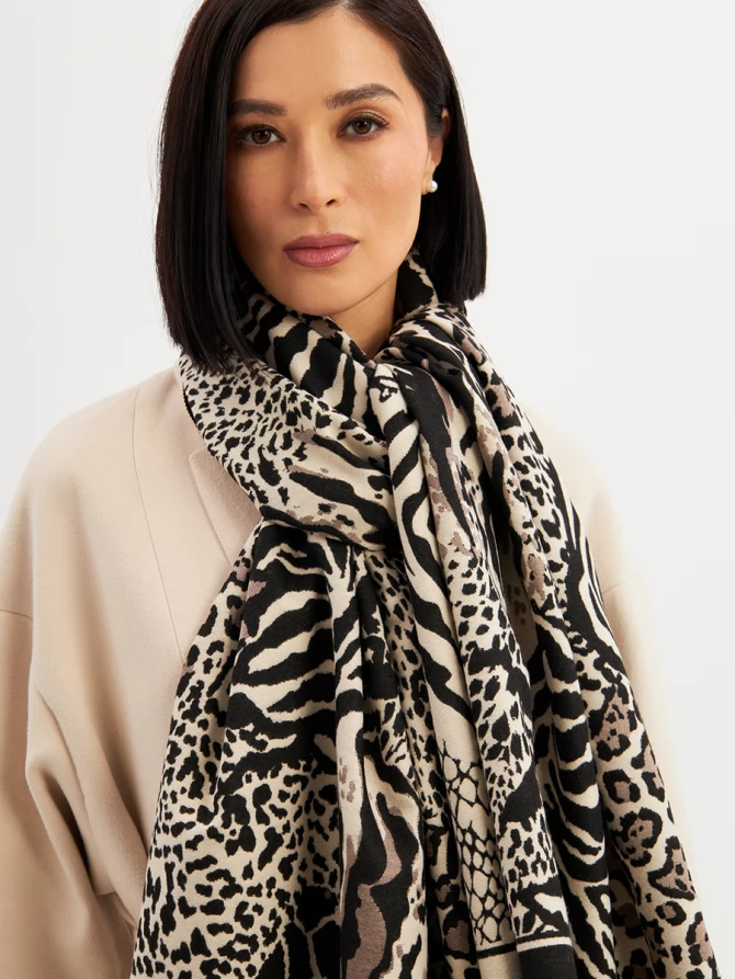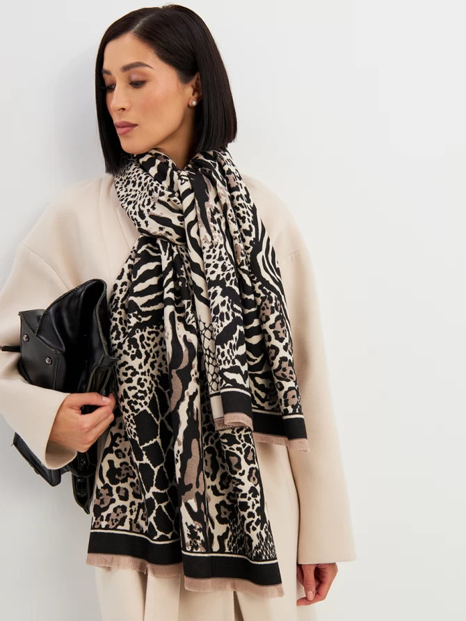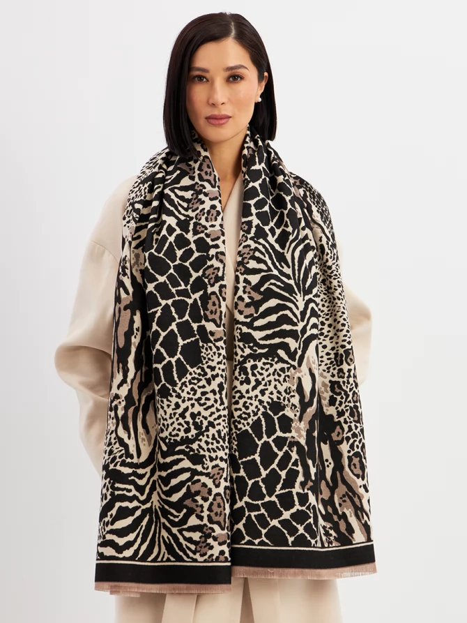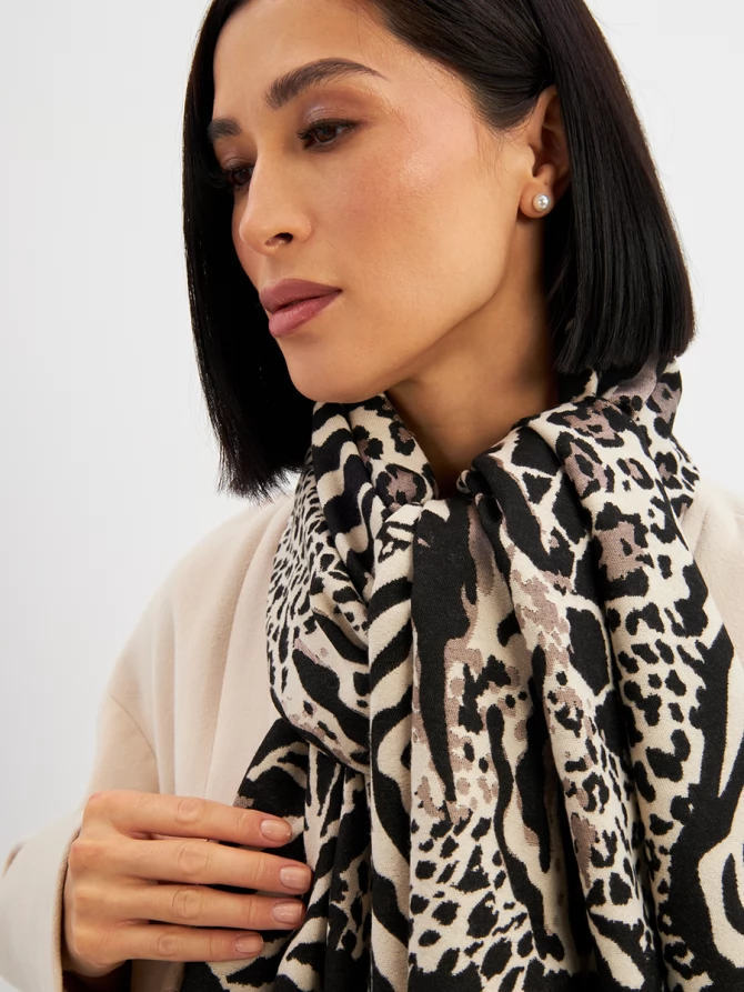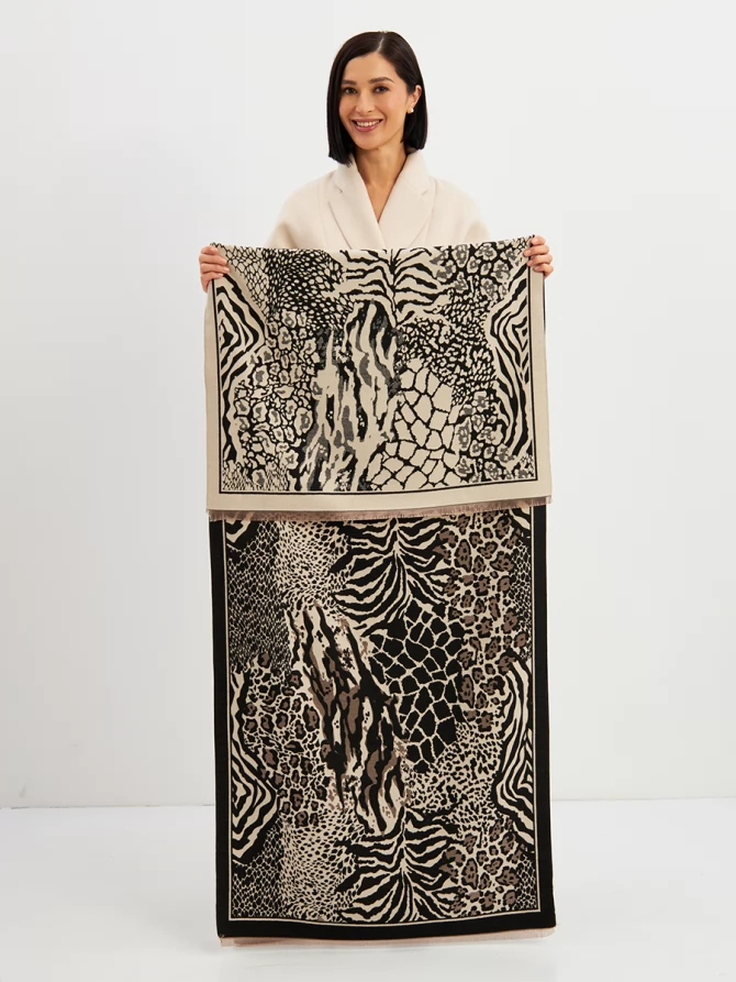 Окутайтесь в объятия роскоши и актуальных трендов! Палантин украшен завораживающим анималистичным принтом, сочетающим в себе дерзость леопарда и графичность зебры в универсальной черно-бежевой гамме. Этот узор — абсолютный хит мировых подиумов, который мгновенно придает вашему наряду элегантность и характер.